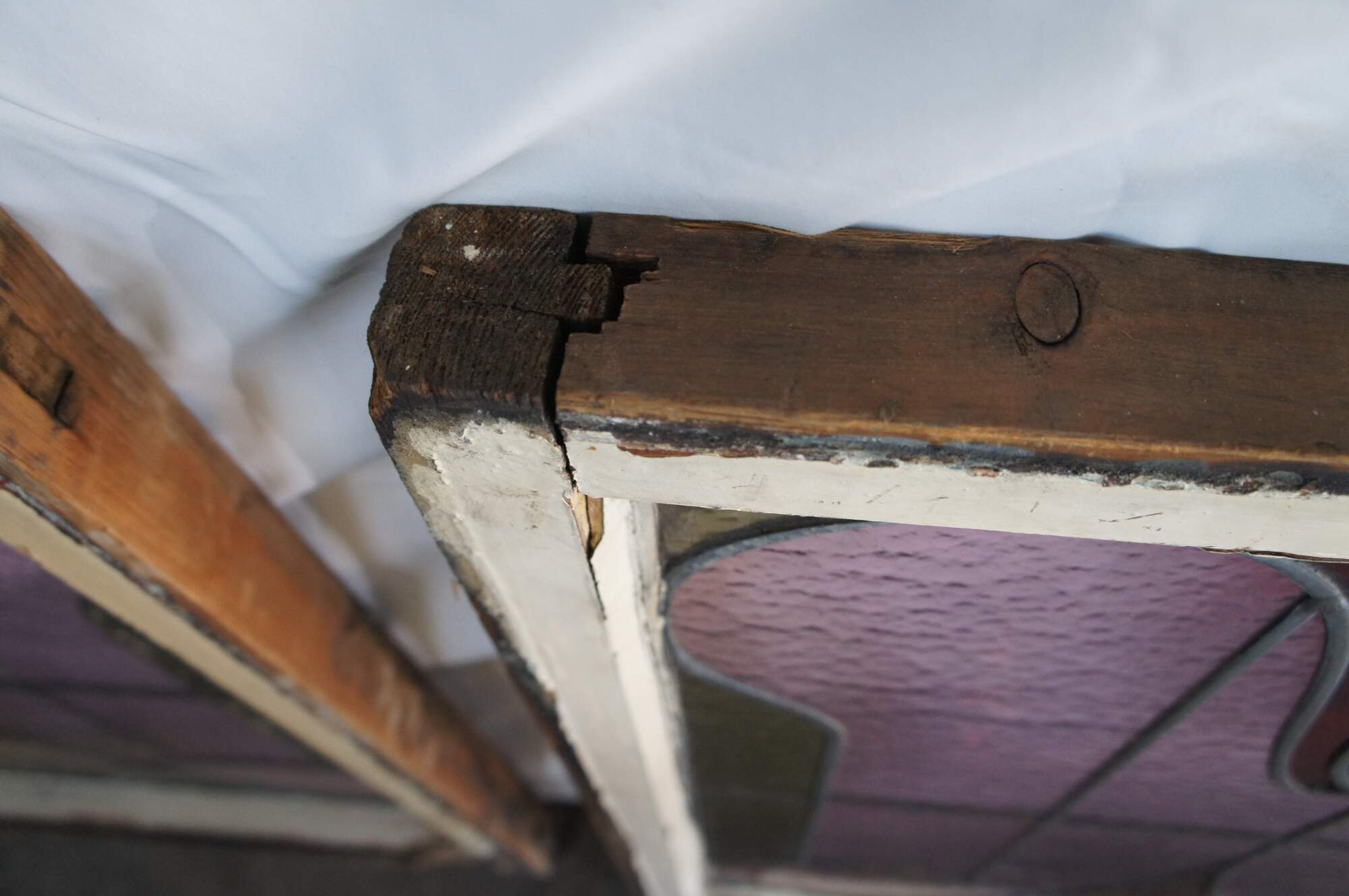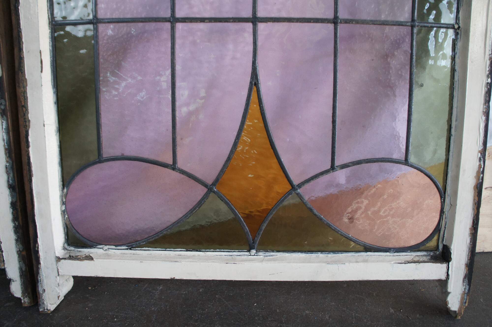 Pair of antique 19th century Victorian / Art Nouveau framed stained glass windows. Features colors of green, rose, red and amber in a white frame. Originally used as sliding windows.