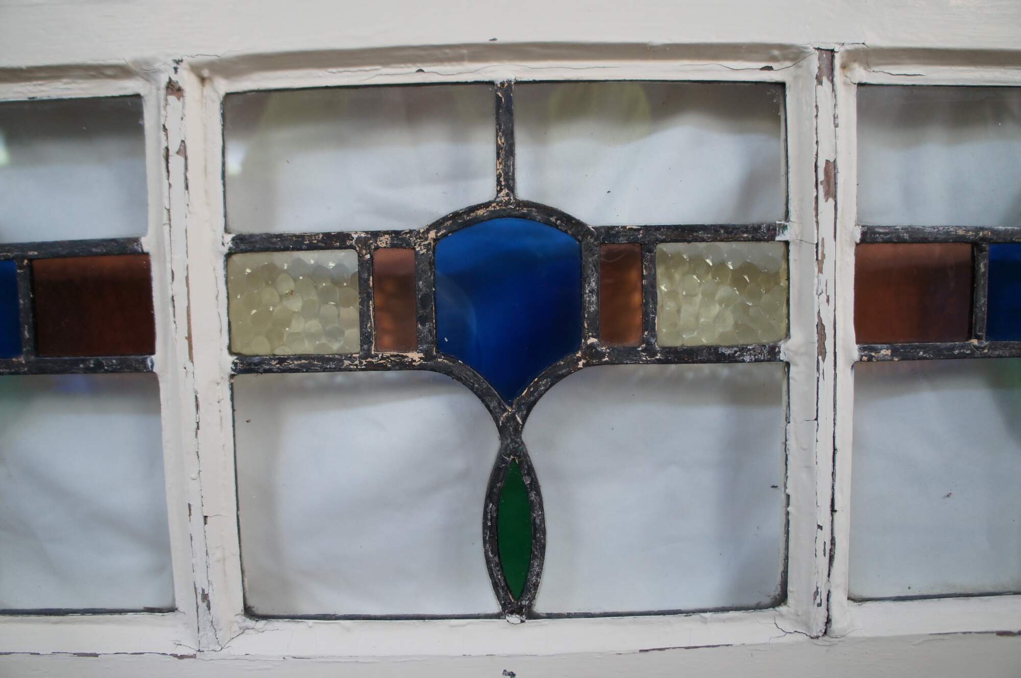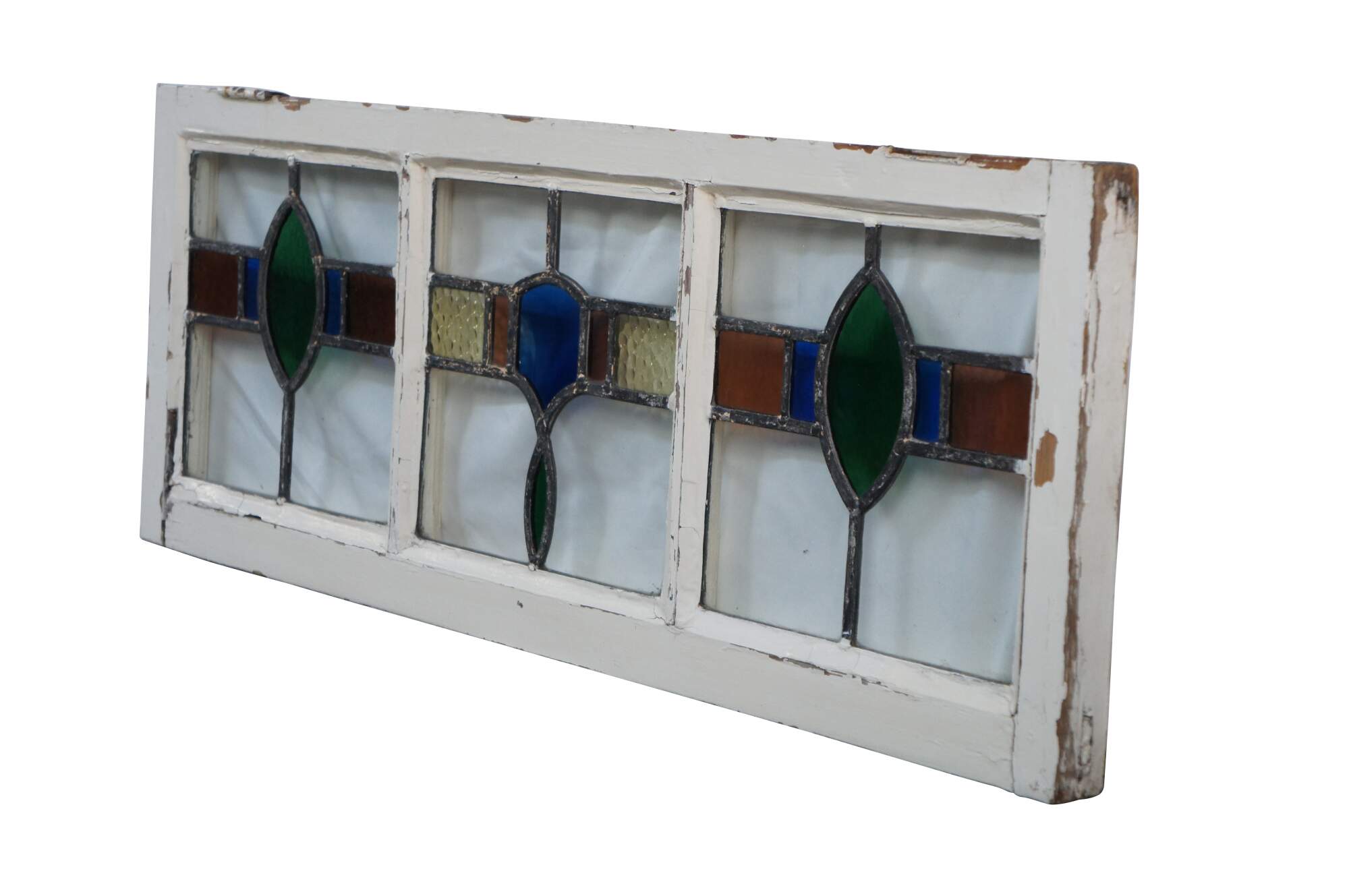A beautiful Victorian era reclaimed leaded stained glass window panel. Features a trio of windows set in a white wooden frame. Features shades of green, yellow red and blue.