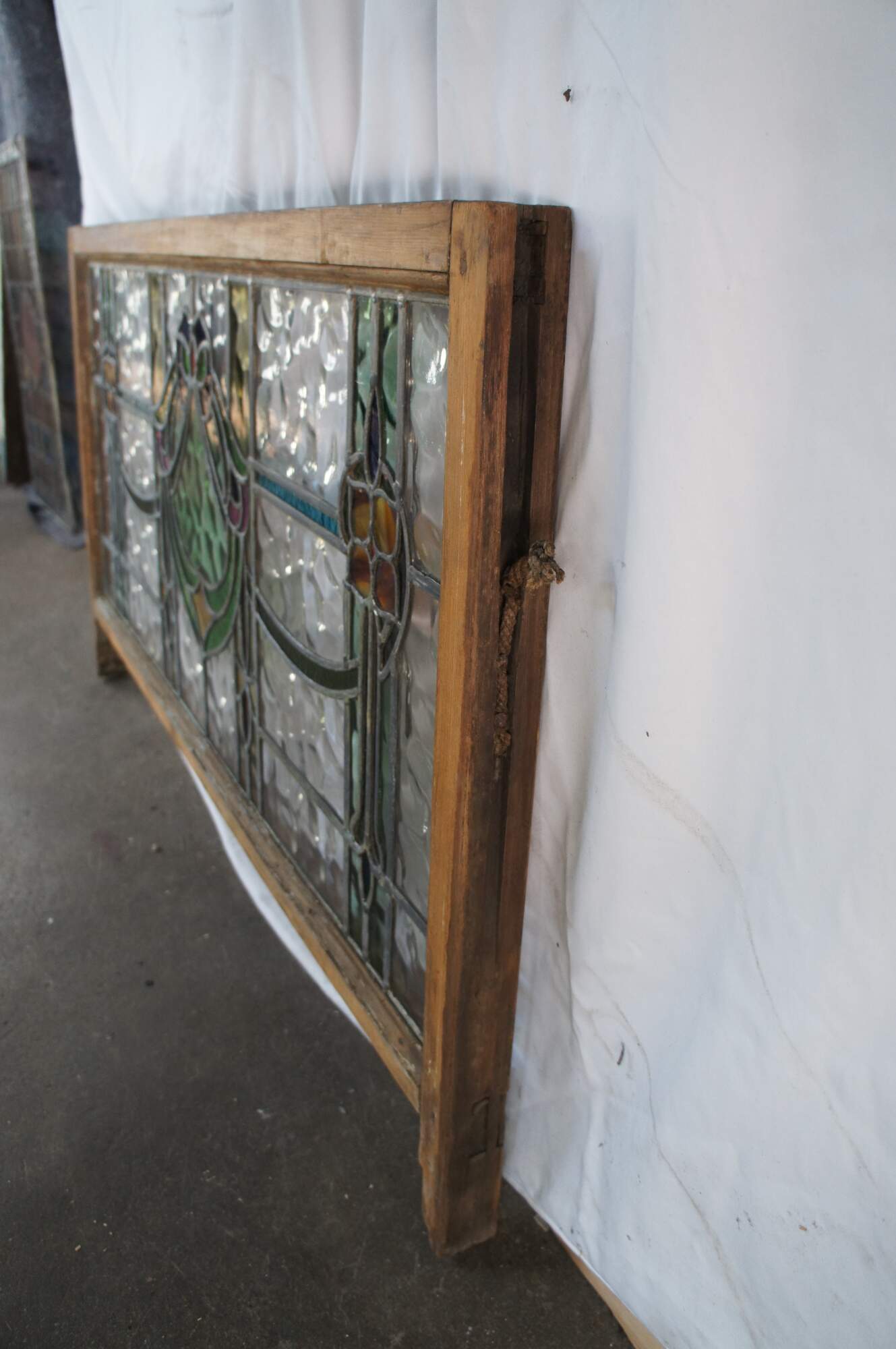 19th Century American Victorian Art Nouveau leaded stained glass transom window panel. Features a beautiful ribboned motif with flowers. Includes Pebbled glass and leaded green, amber, blue and yellow.