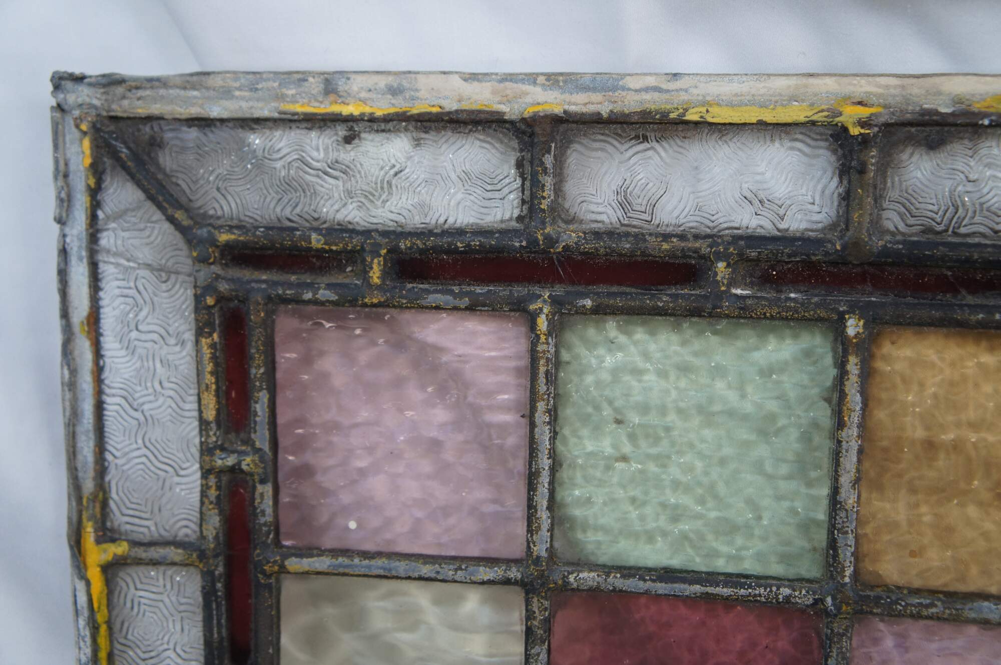 Good Condition; age and use related wear. missing piece of glass along one of the blue panels. Some edge wear and bending to the leaded frame