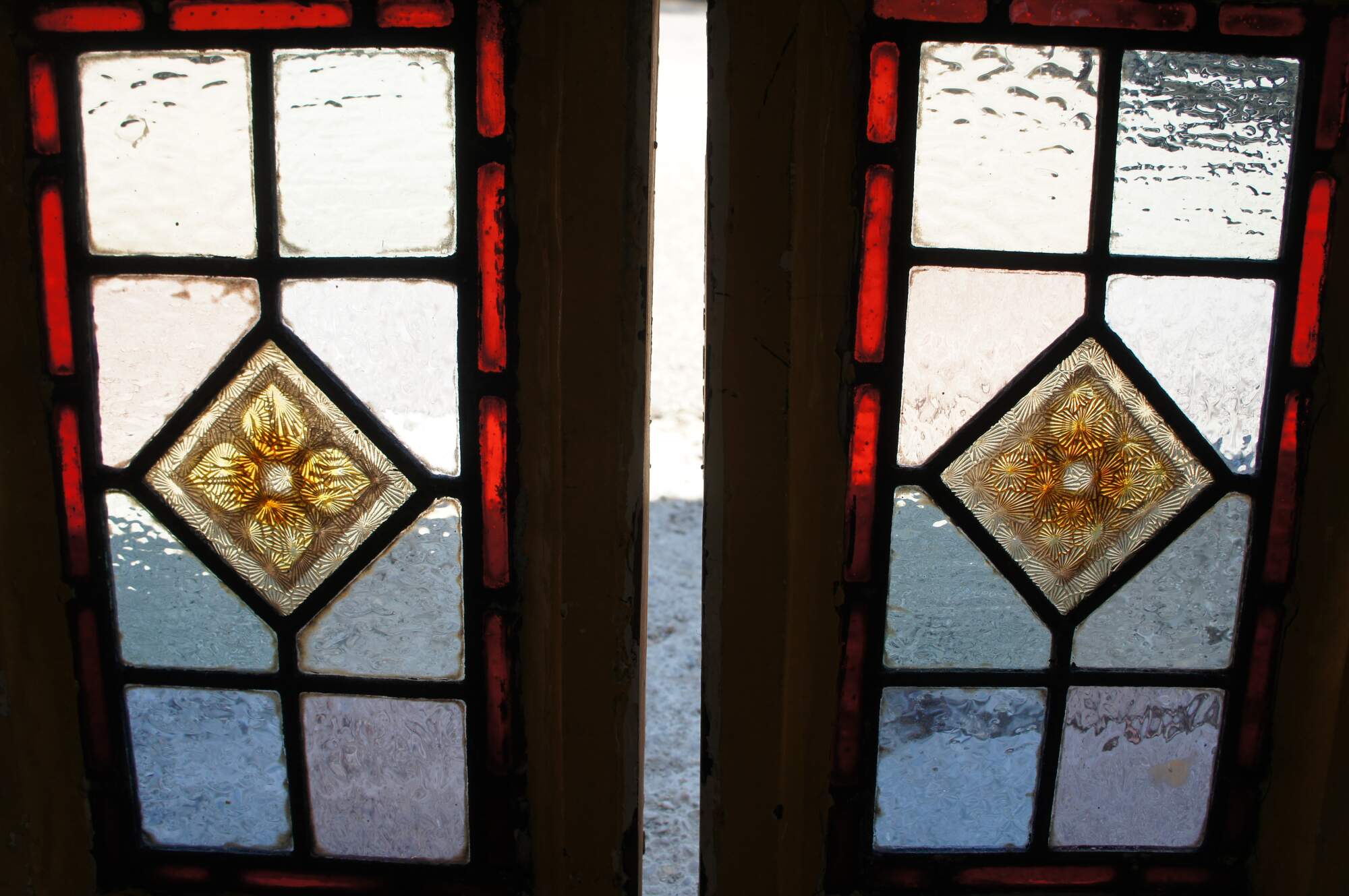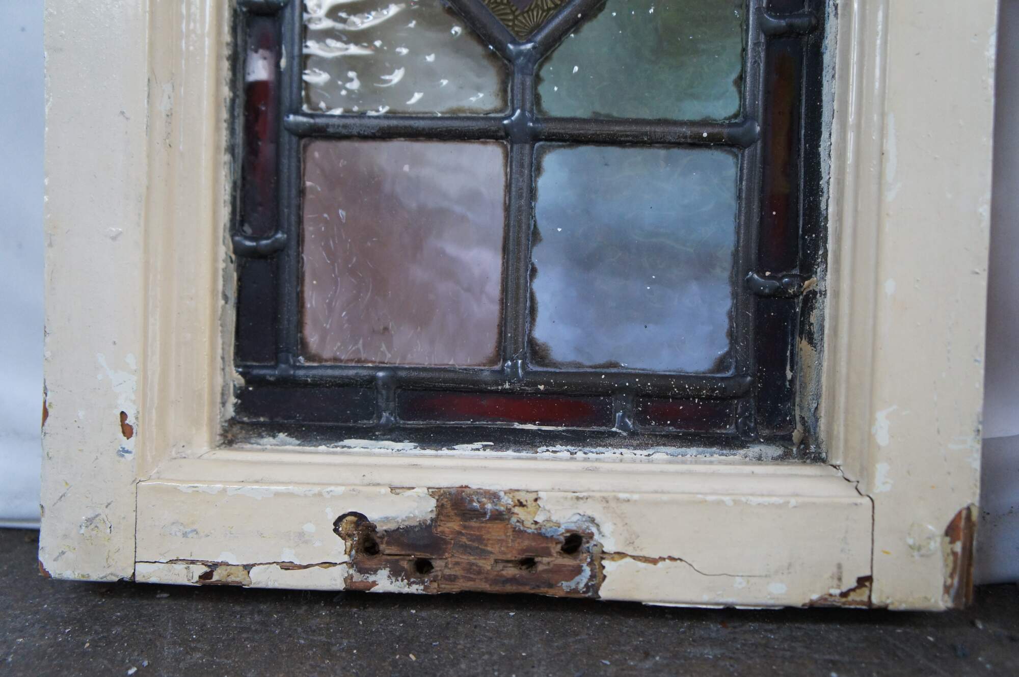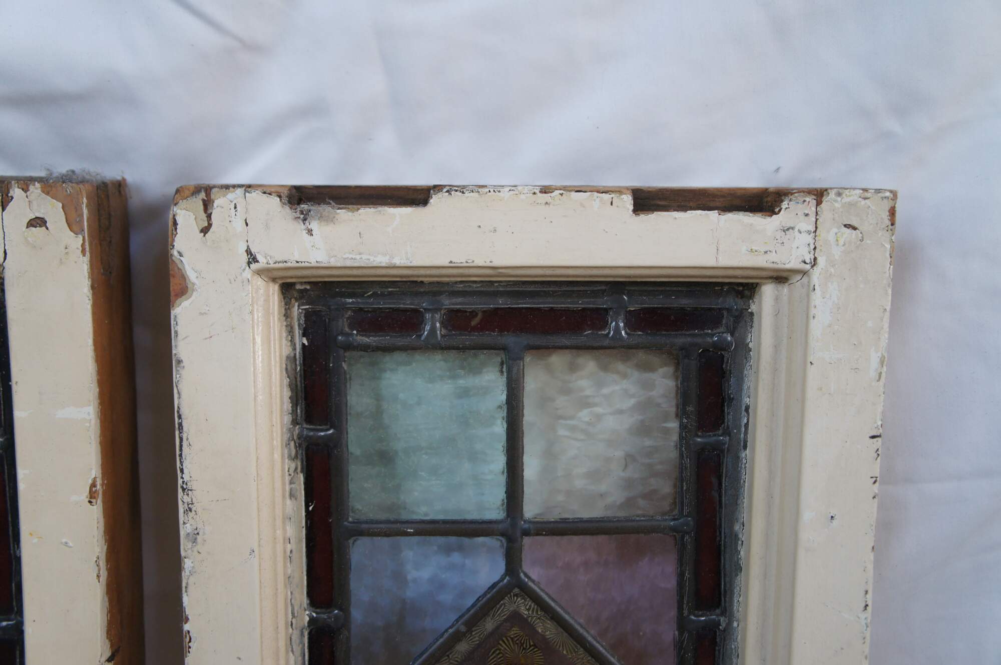 Unque pair of American Victorian leaded stained glass windows. Featuring a diamond textured motif at the center around pebbled clear glass with ruby glass border set within a wooden frame