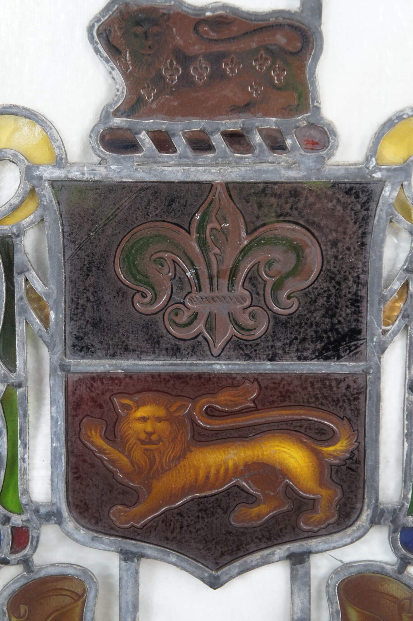 The fleurs-de-lis and lion were part of the old arms of the city, and are themselves derived from the arms of the Duchy of Lancaster. Each lion stands on a garb for the two Rural District Councils.