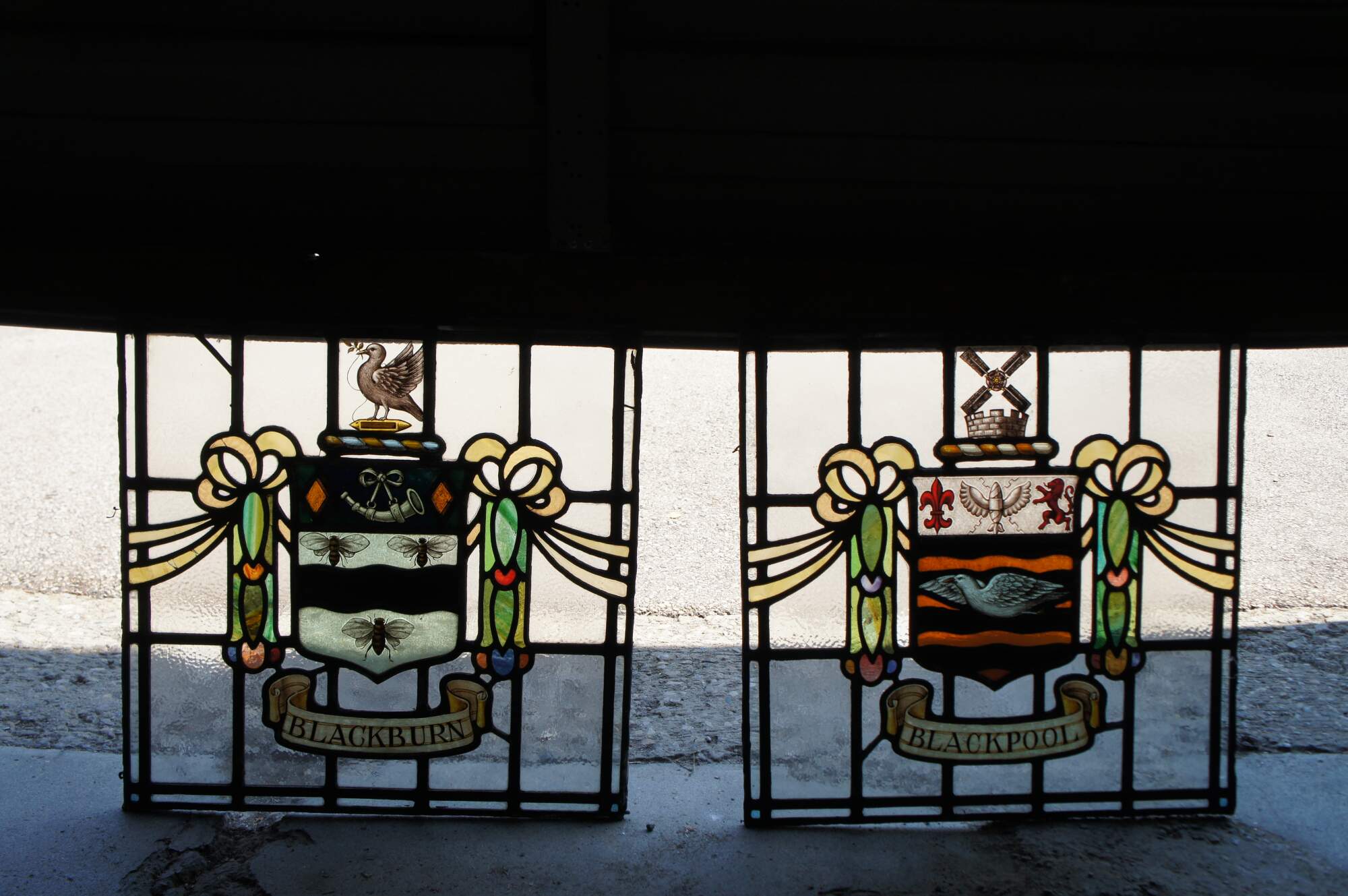 Between a fleurs-de-lys for the Banks family and a lion for the Cocker family is a thunderbolt. This represents the generation of electricity and the town's famous electric trams.