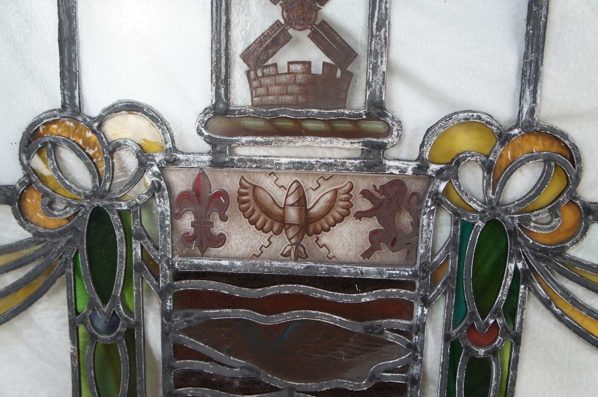 The crest has a dove and olive branch, a popular charge in Victorian civic arms. He stands on a weaver's shuttle. The crest represents the beneficial results emanating from the art of weaving.