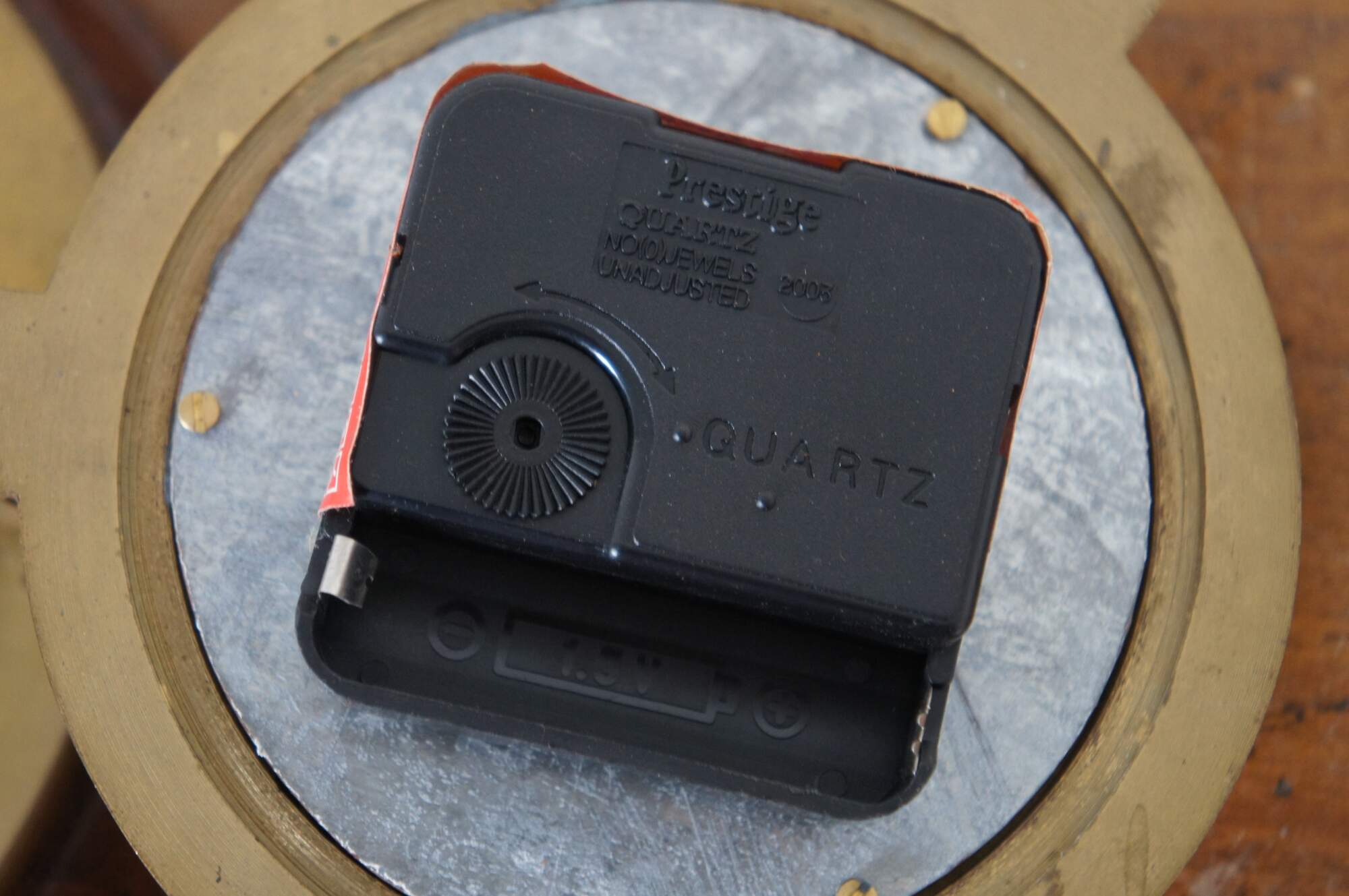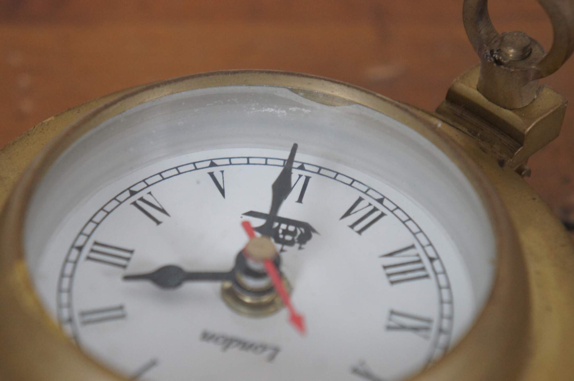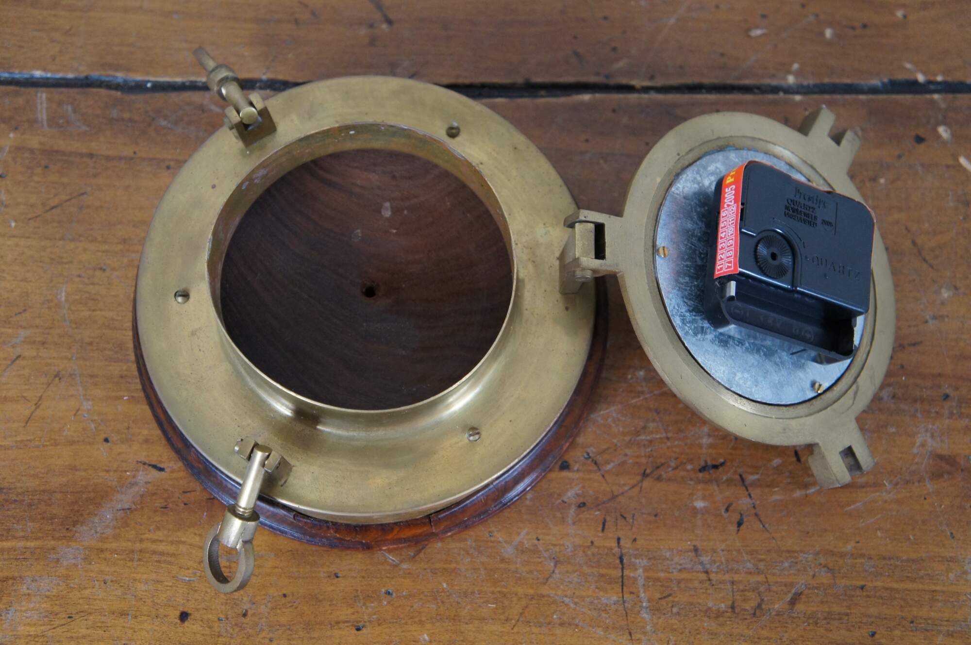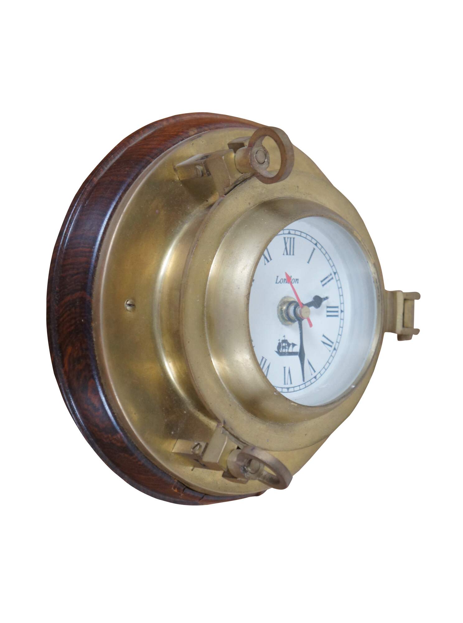 Late 20th century porthole shaped wall clock with wooden base and brass frame around a white face with black Roman numerals and hands, red second hand, marked London over a sailing ship. Made in India. Prestige Quartz battery operated movement