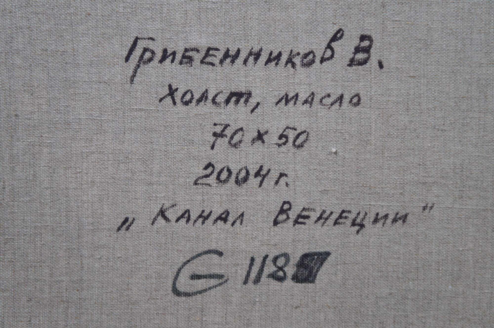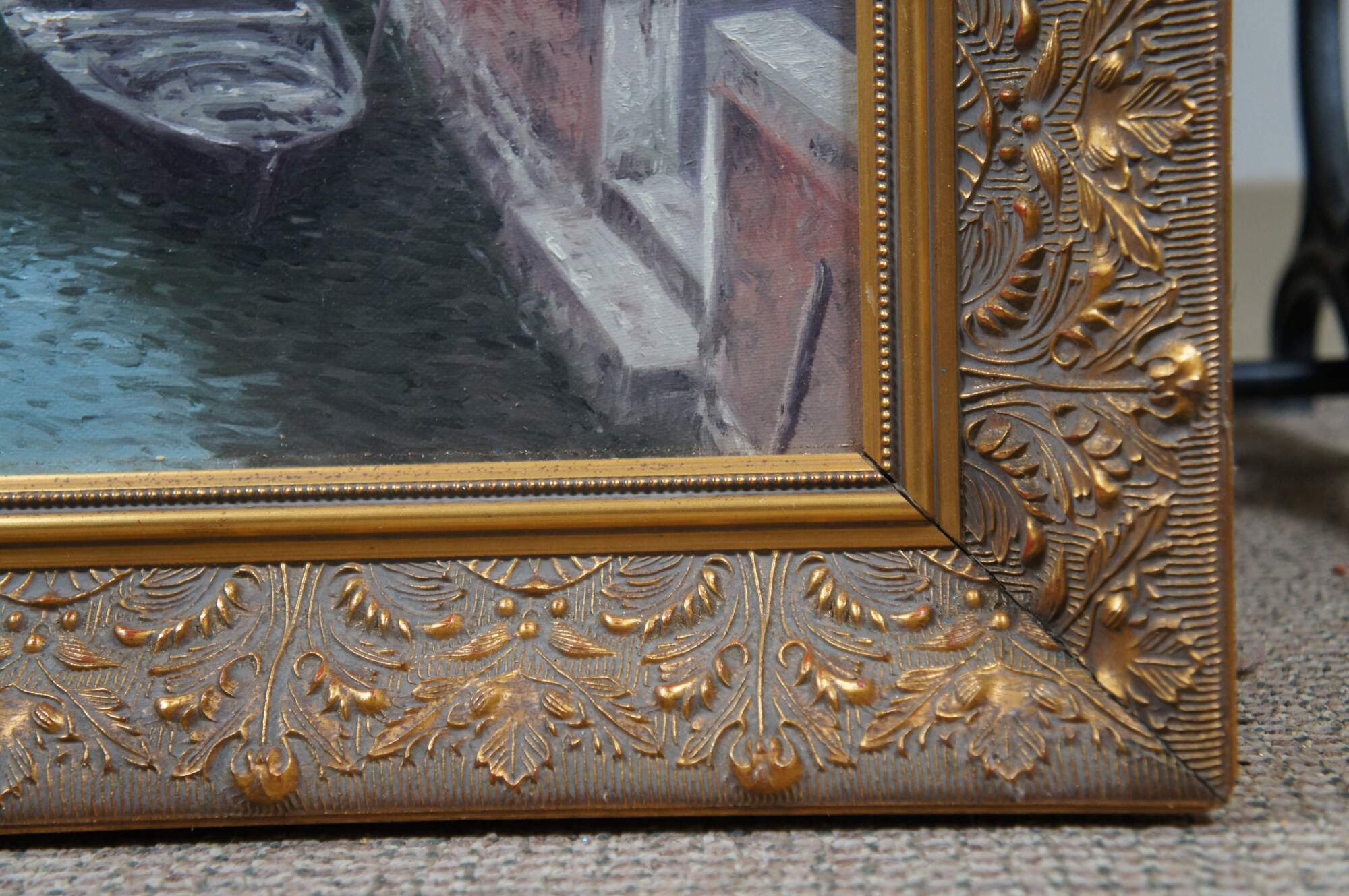 Vintage Russian Impressionist oil painting on canvas by Vasily Gribennikov. It features a river / canal view in Venice Italy, circa 2004. Signed lower left. Gold frame with acanthus leaf design.