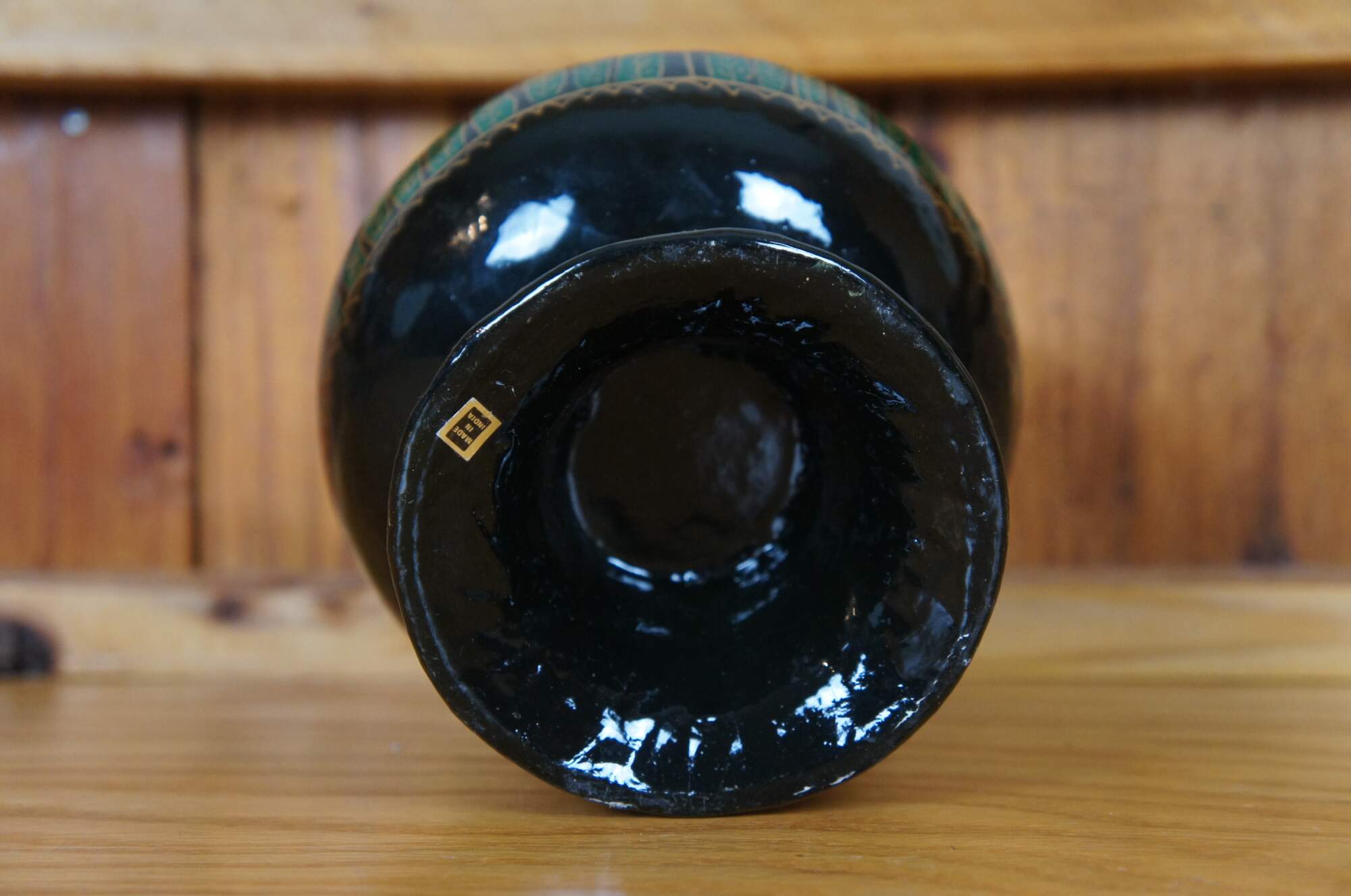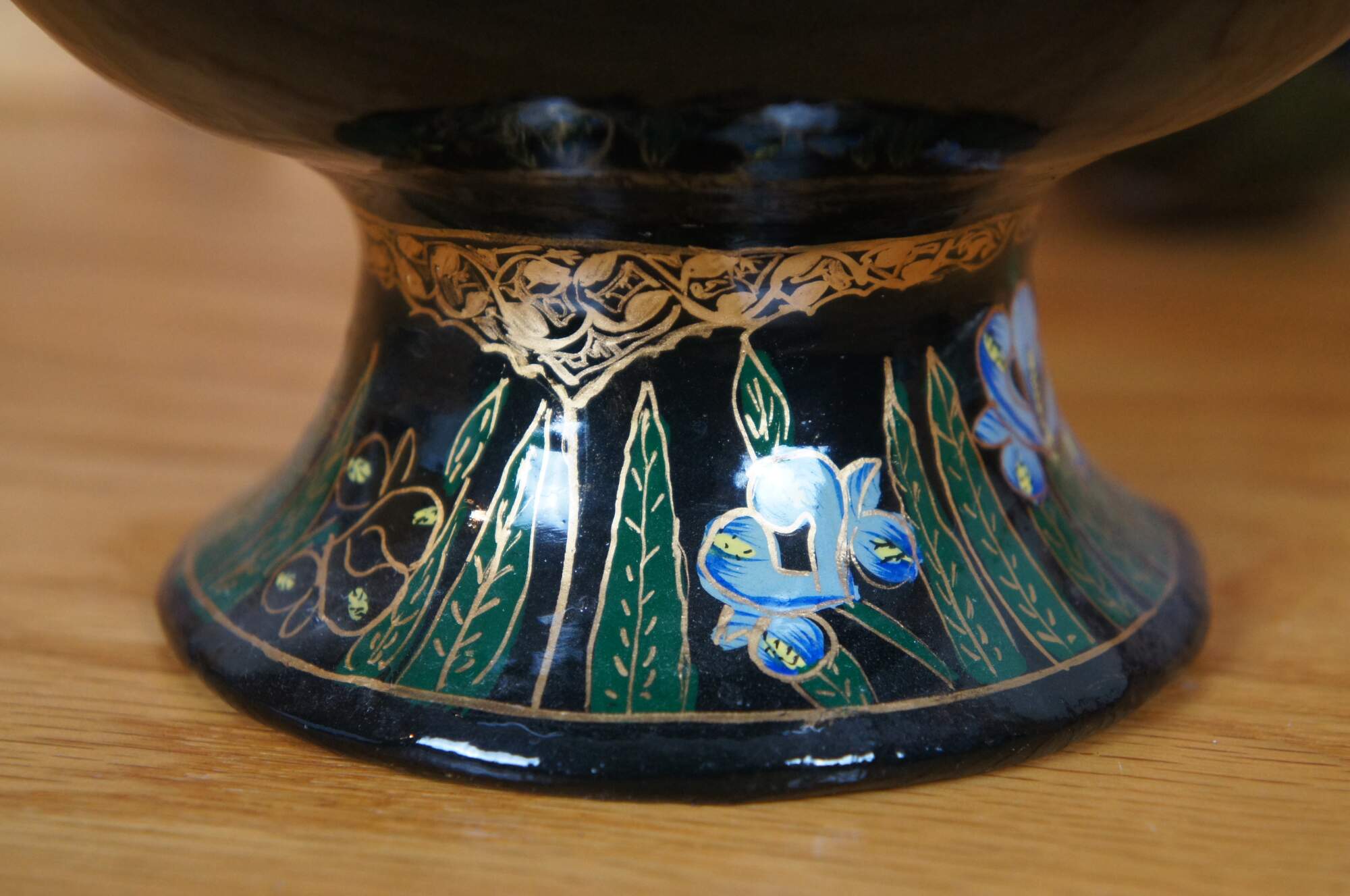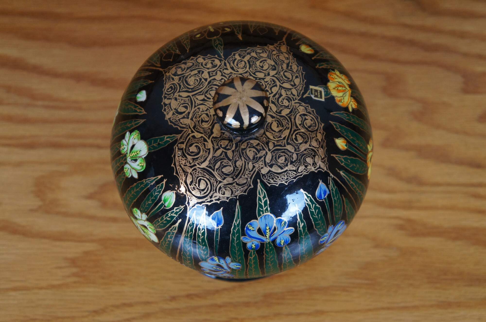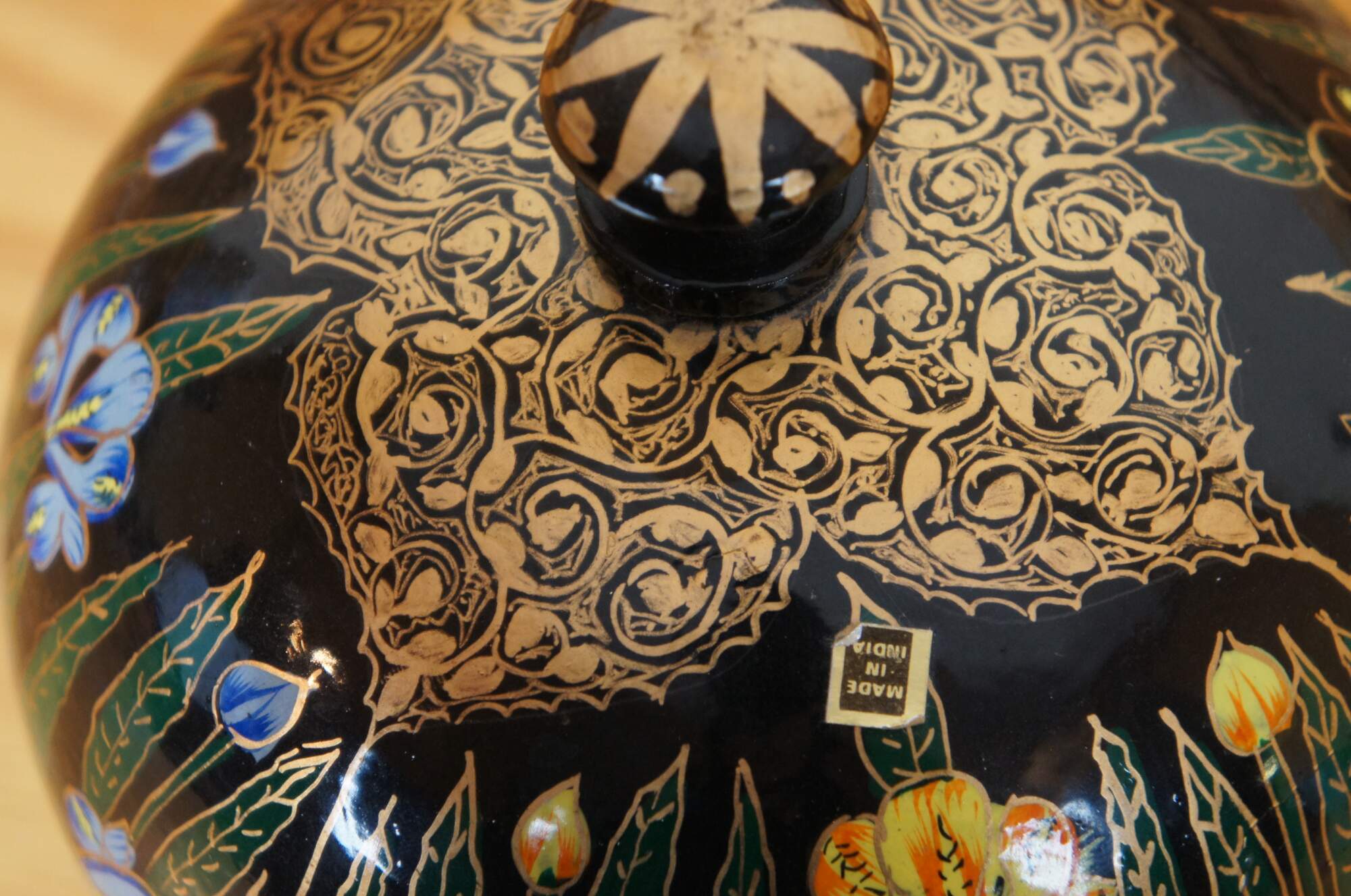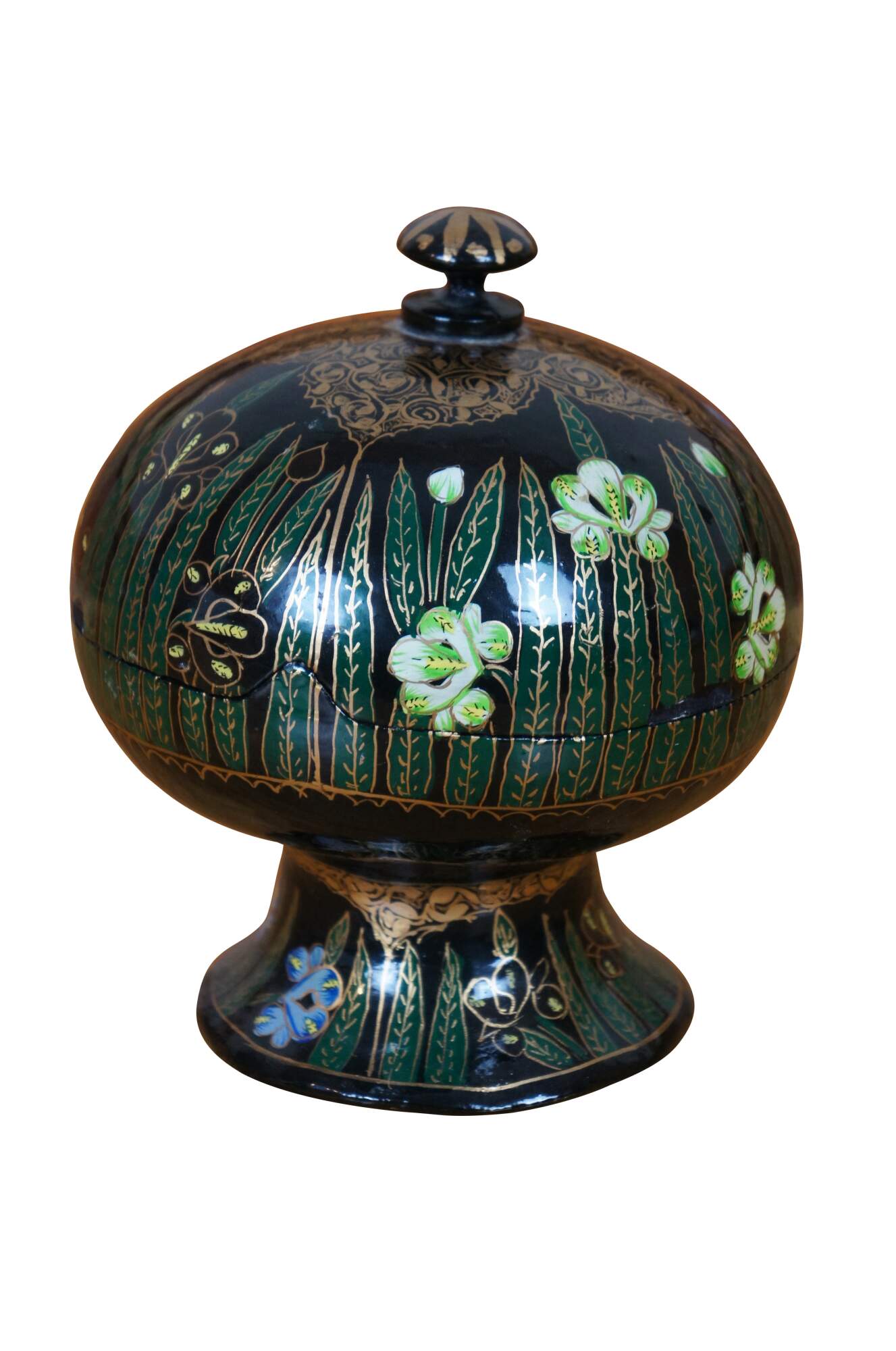 Vintage black laquered lidded pedestal kashmir / kashmiri papier mâché box made in India. It features a floral motif with leaves and flowers.