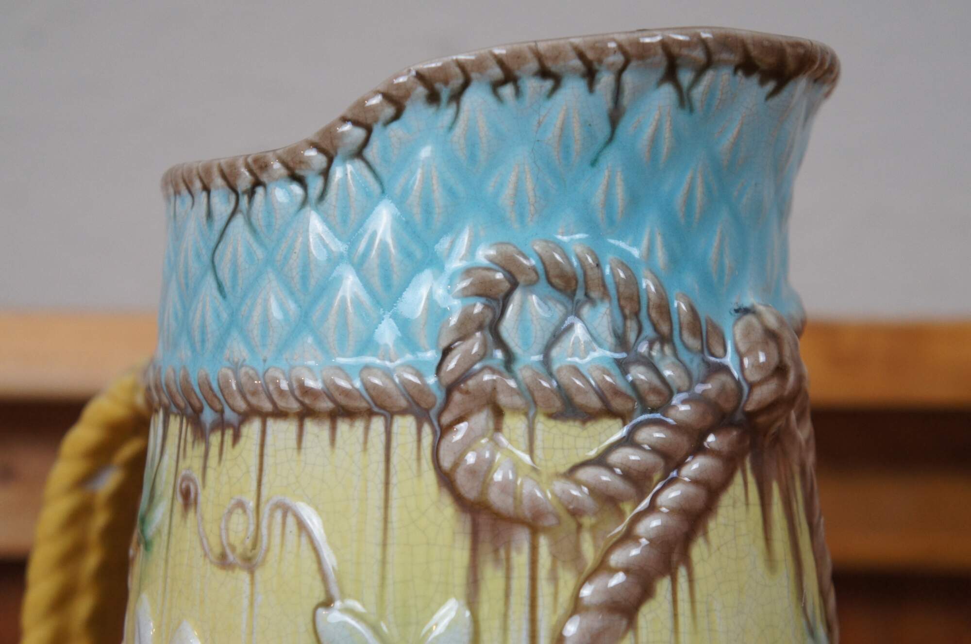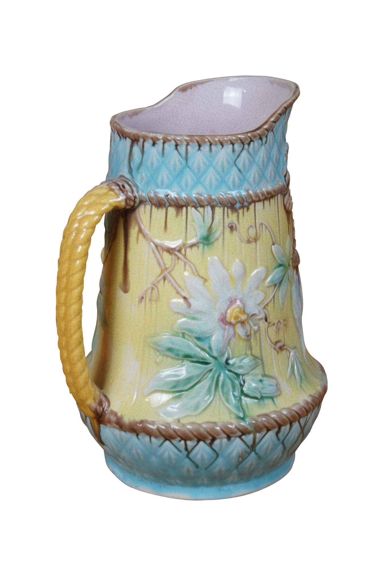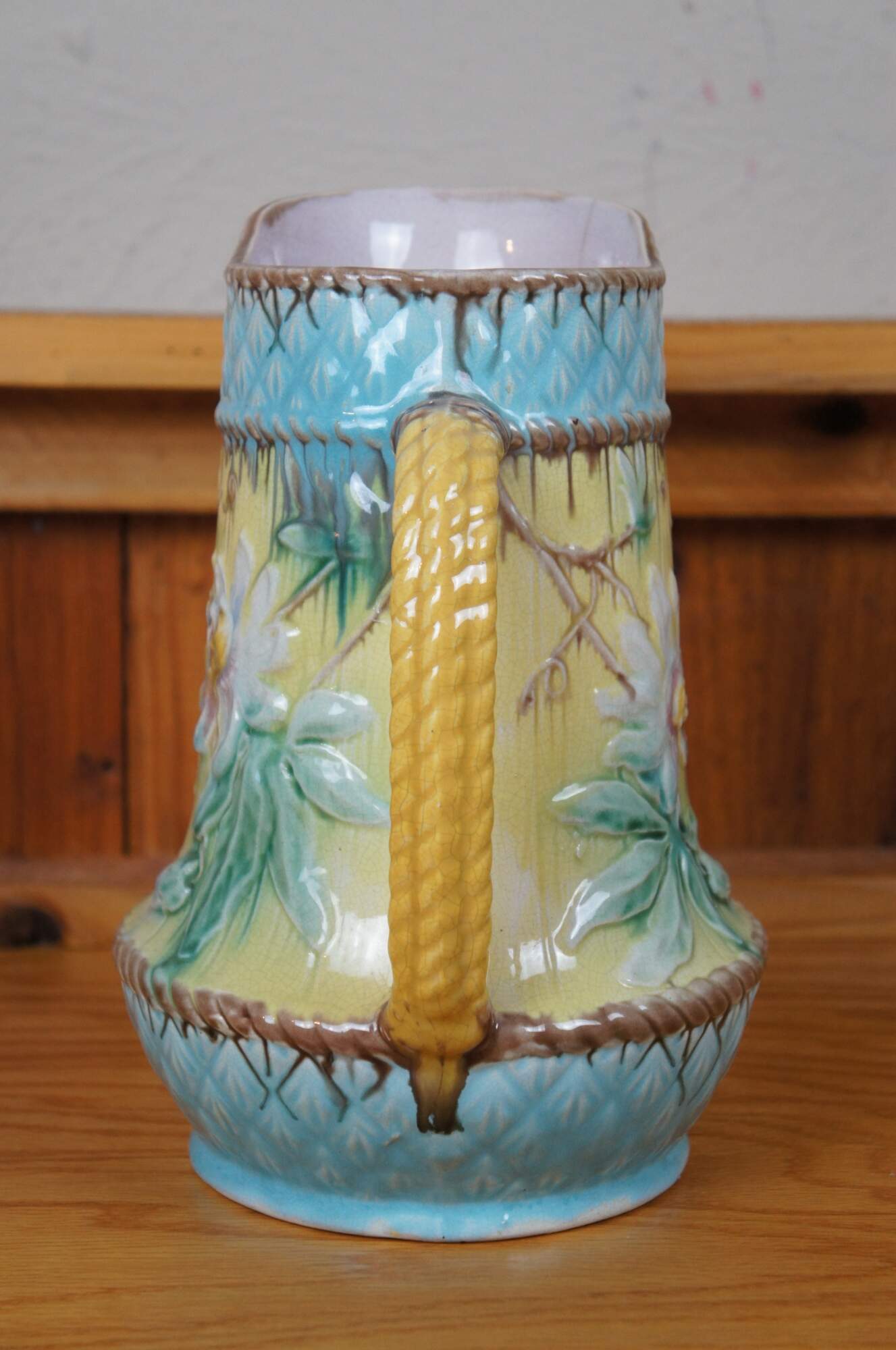 Very large and impressive antique Majolica French country pitcher / jug / carafe featuring a turquoise blue and yellow pineapple design with Passion flowers accented with a rope twist boarder and handle, and lavender interior. Attributed to Wardle.