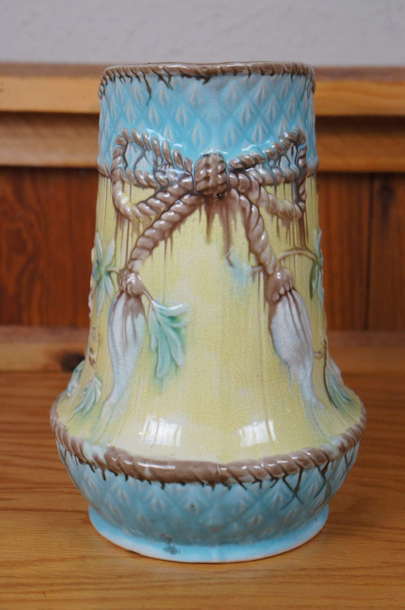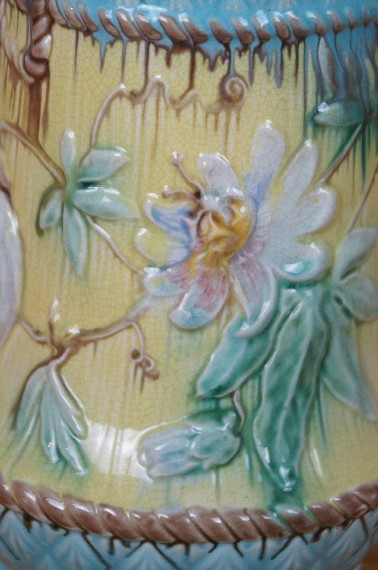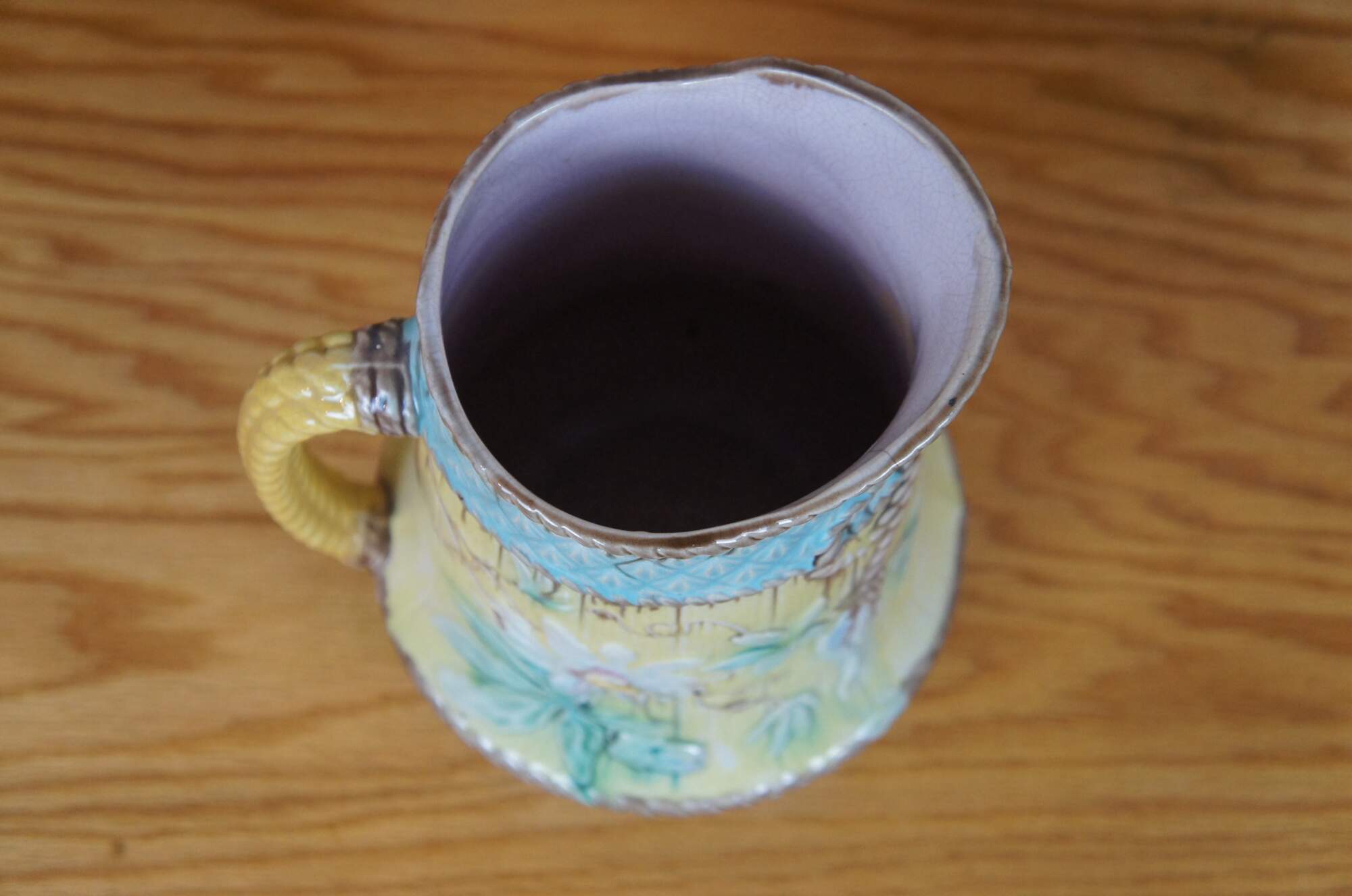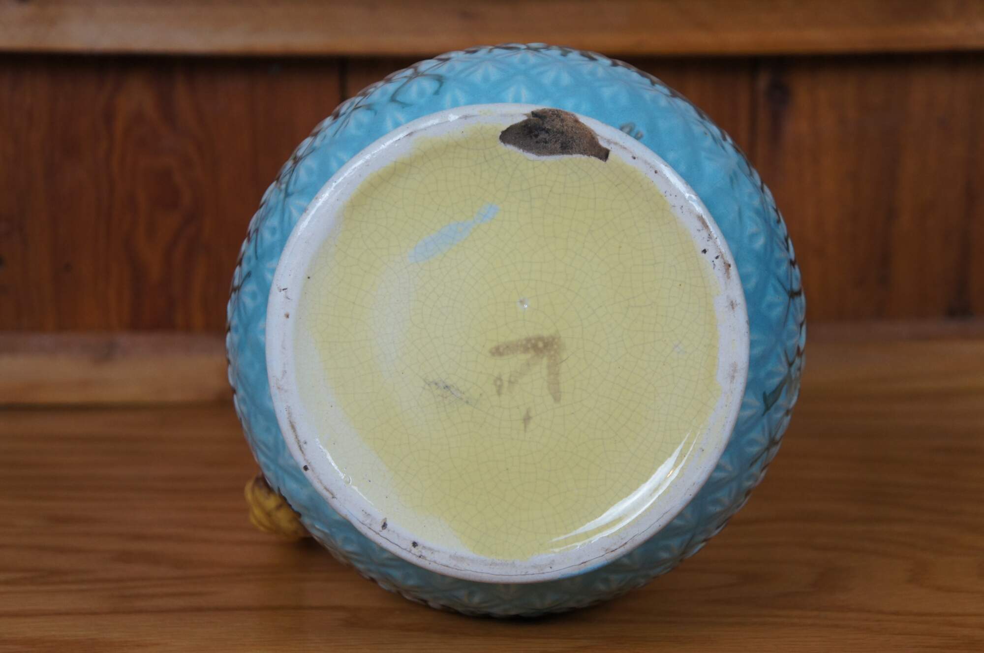 Very large and impressive antique Majolica French country pitcher / jug / carafe featuring a turquoise blue and yellow pineapple design with Passion flowers accented with a rope twist boarder and handle, and lavender interior. Attributed to Wardle.