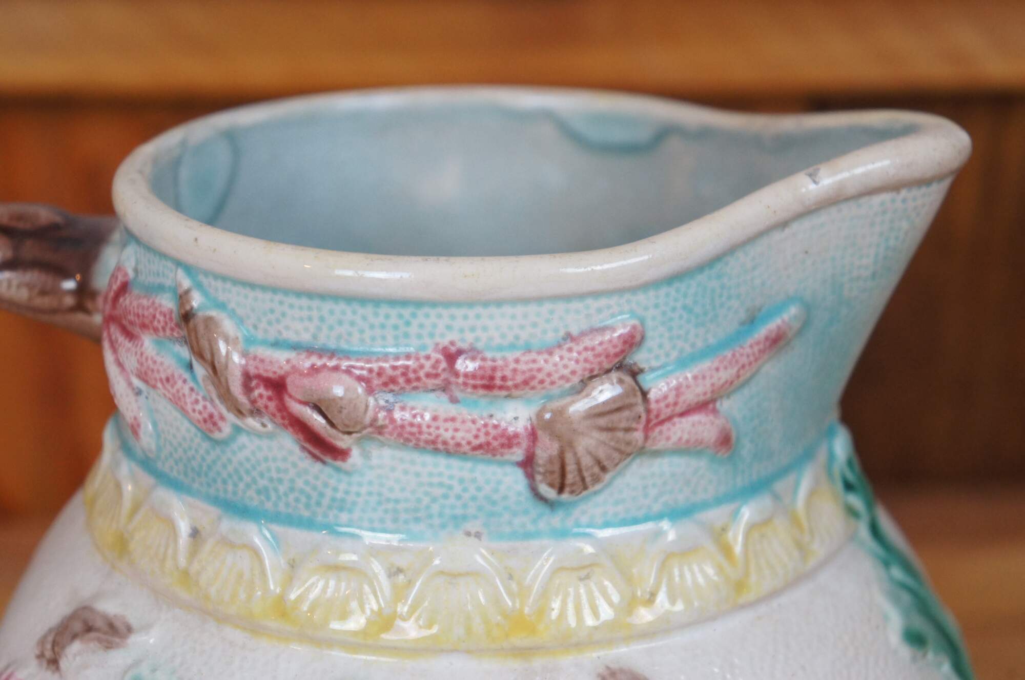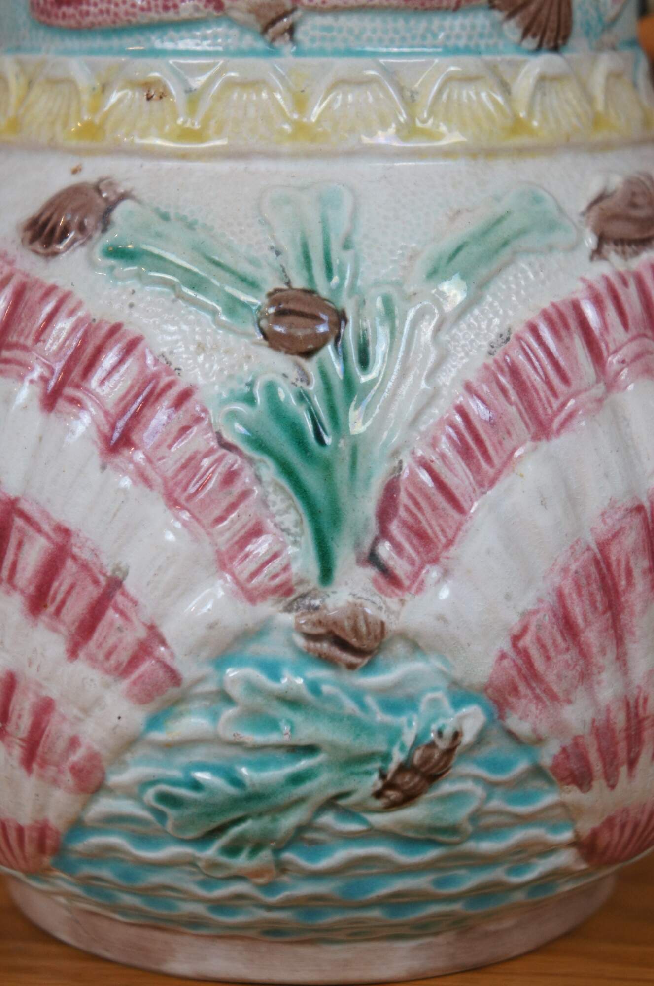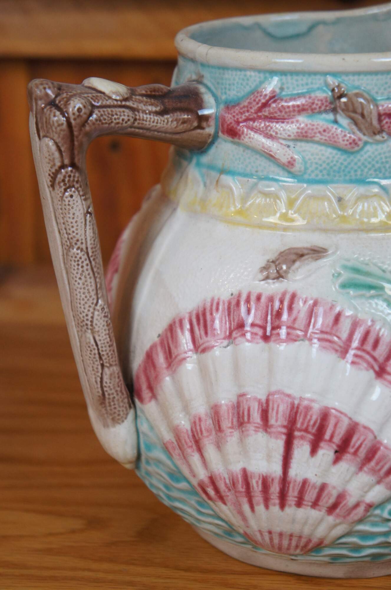 Large antique Arsenal Pottery after Wardle Majolica nautical Ocean pitcher / jug / carafe featuring a coral seashell and seaweed theme.