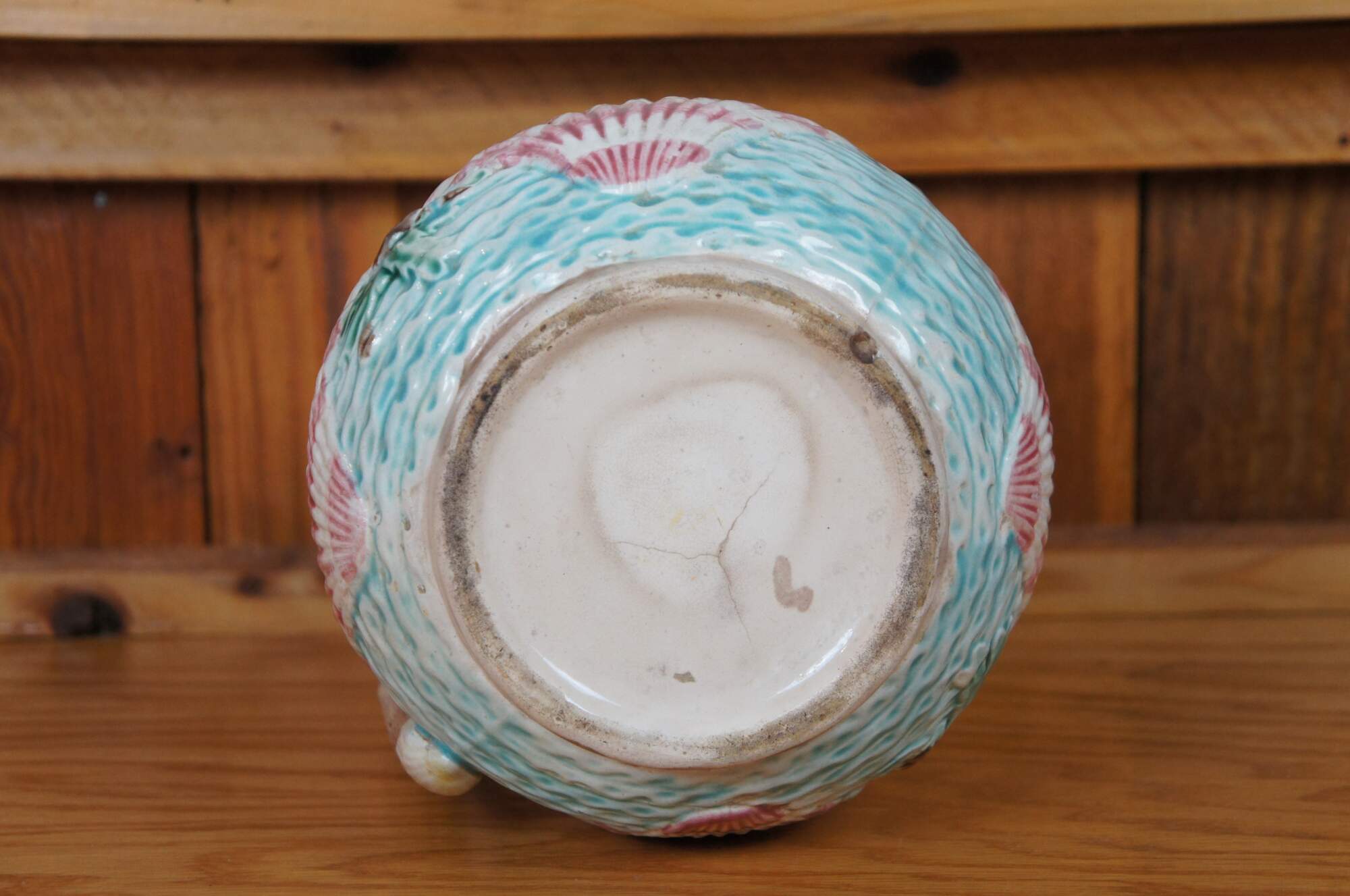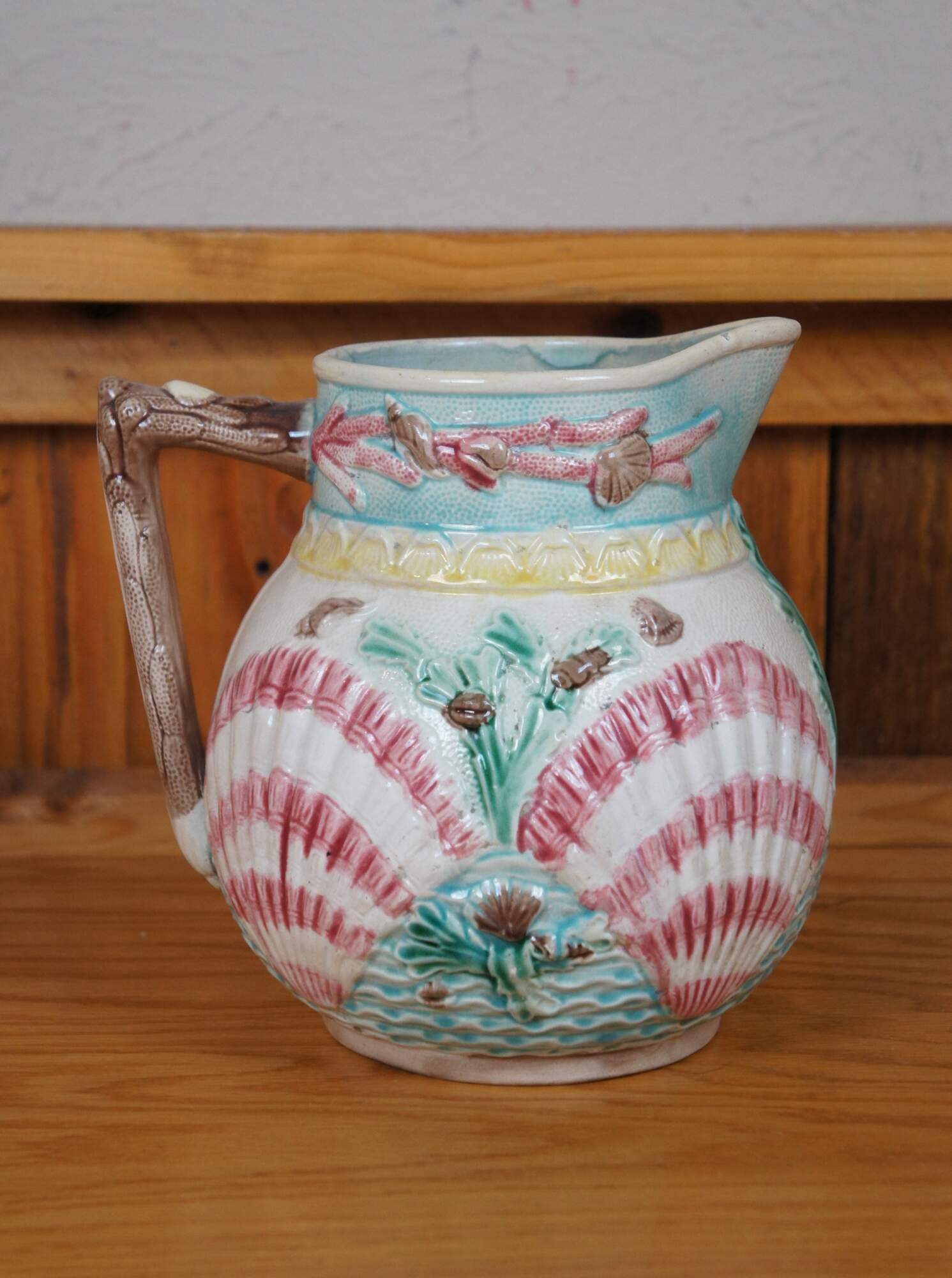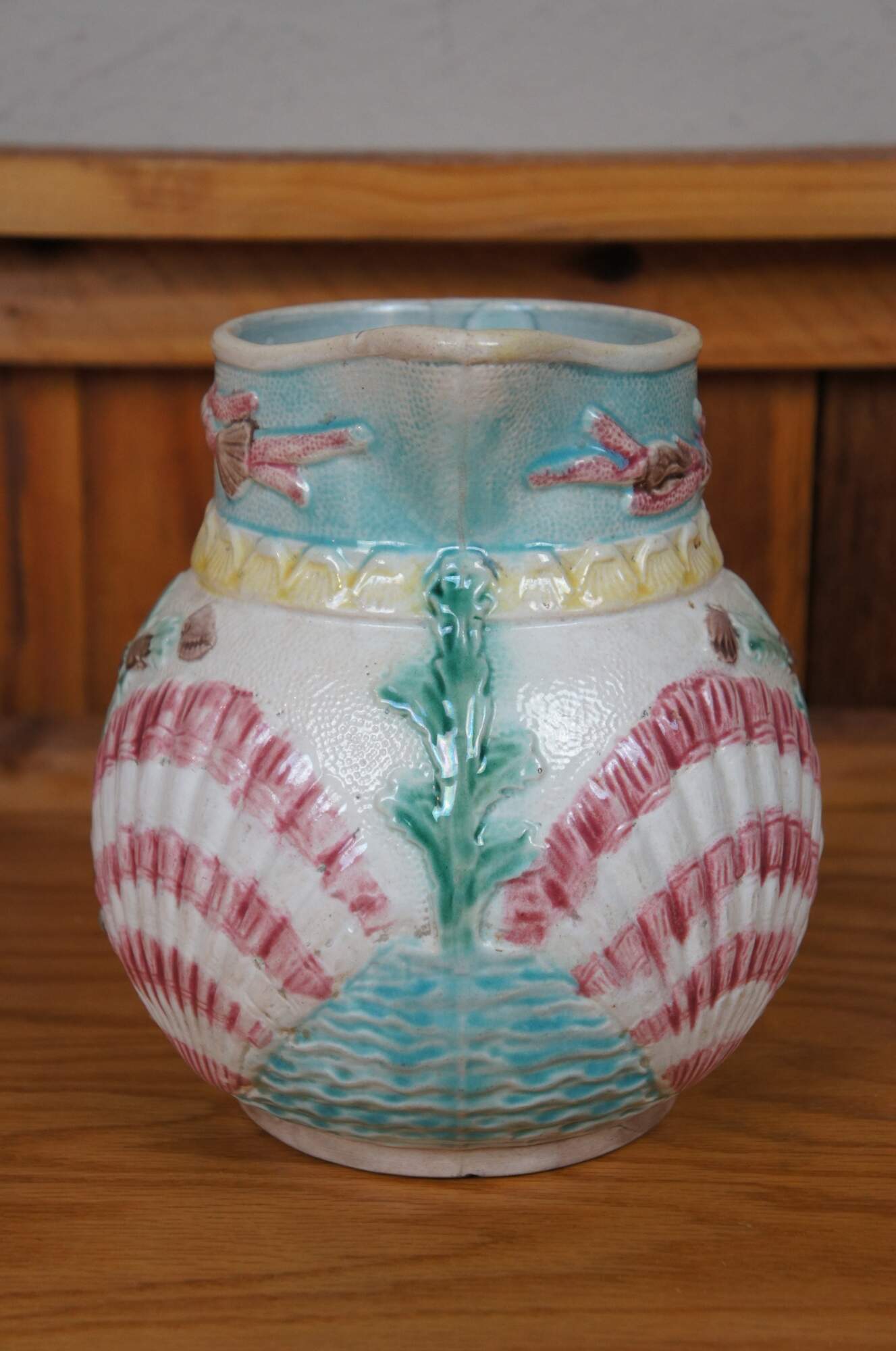 Large antique Arsenal Pottery after Wardle Majolica nautical Ocean pitcher / jug / carafe featuring a coral seashell and seaweed theme.