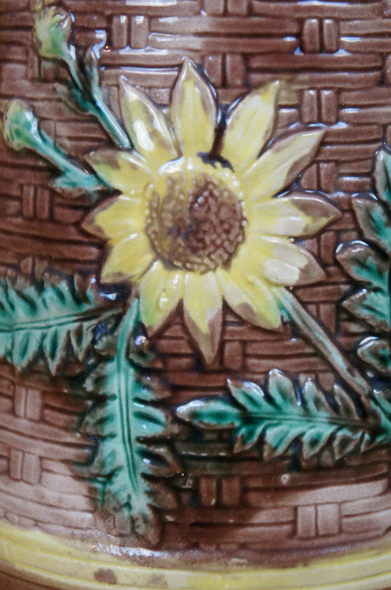 Antique Majolica creamer pitcher / jug featuring a farmhouse motif with wood grain basket weave design, sunflowers, wild dogwood flowers, and acanthus handle.