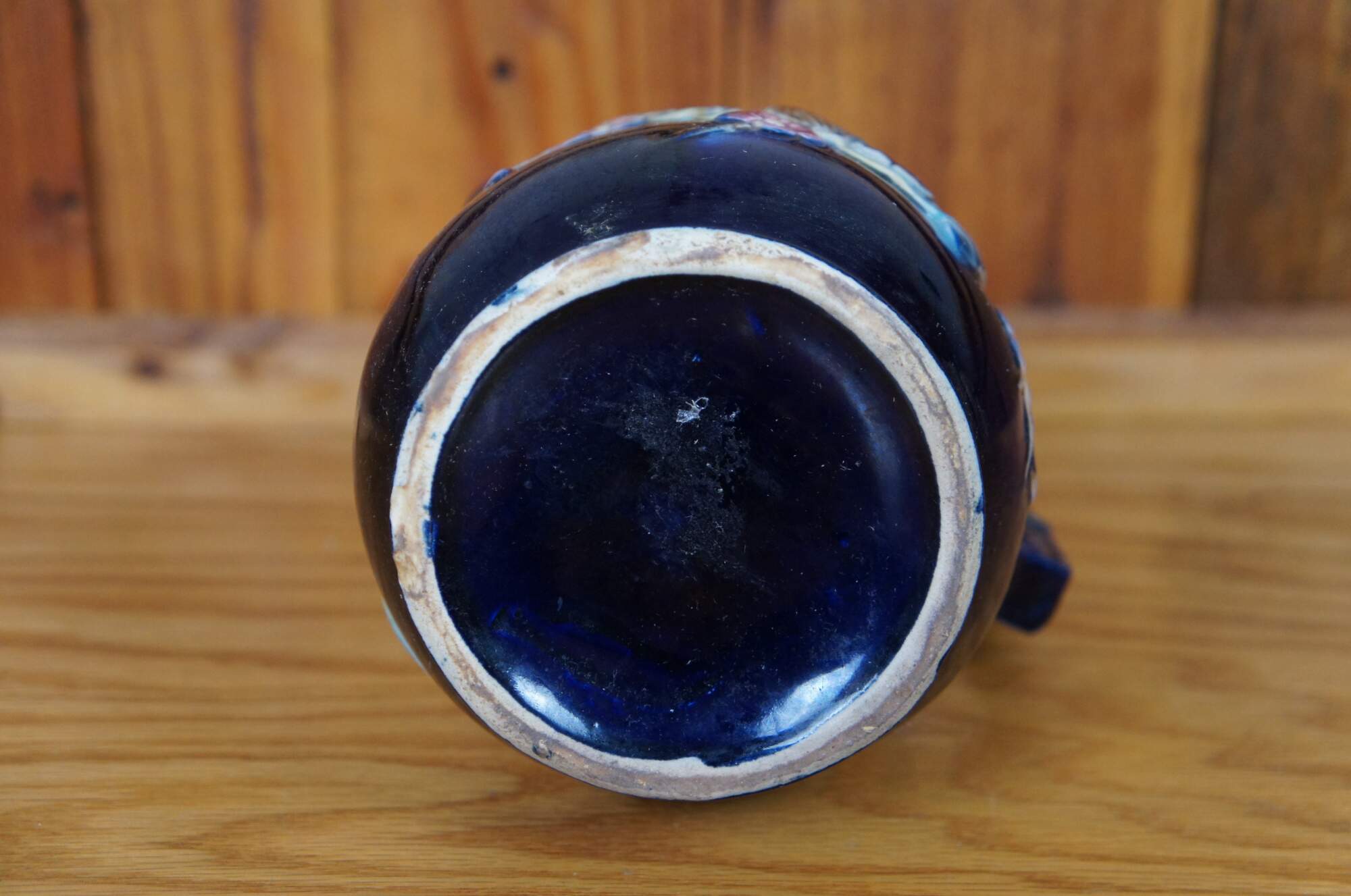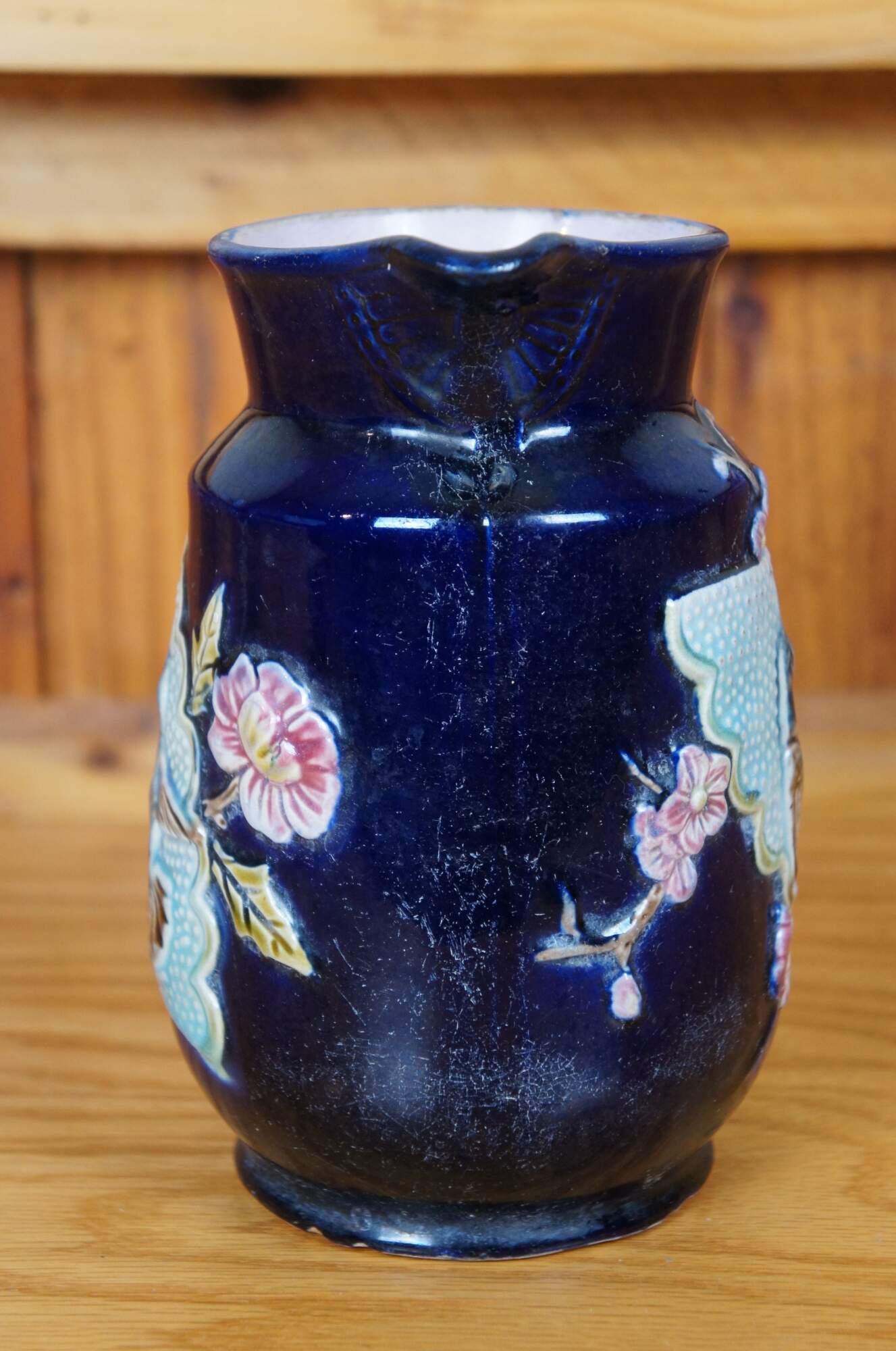 Antique Majolica creamer pitcher / jug featuring a deep cobalt blue glazed ground accented with a Chinese hand fan with hummingbirds and flowers. Attributed to Shorter & Boulton. Most of Shorter & Boulton designs had a strong Asian influence. One of the company’s earliest registered majolica designs was the Fan motif.