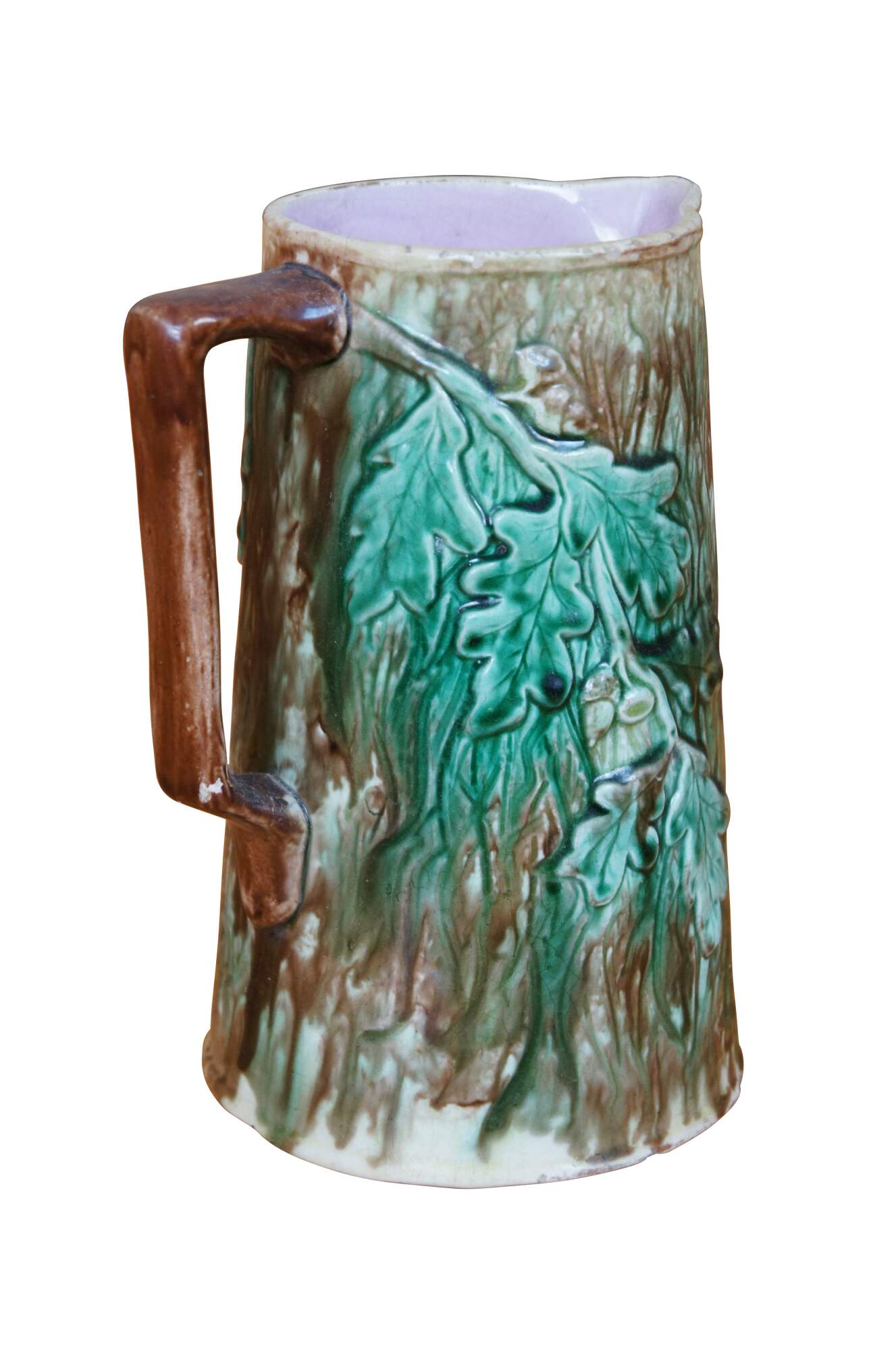 Antique Majolica creamer pitcher / jug featuring a tree bark, oak leaf and acorn nut theme with branch handle, purple lavender interior.