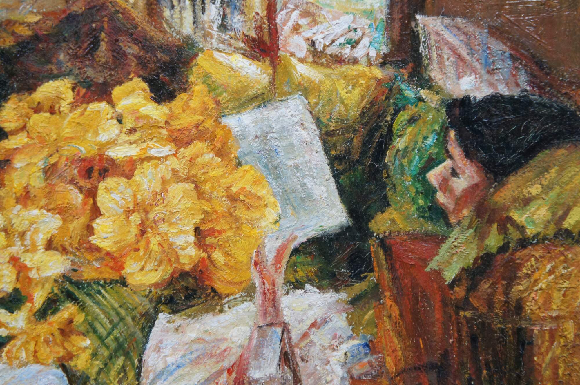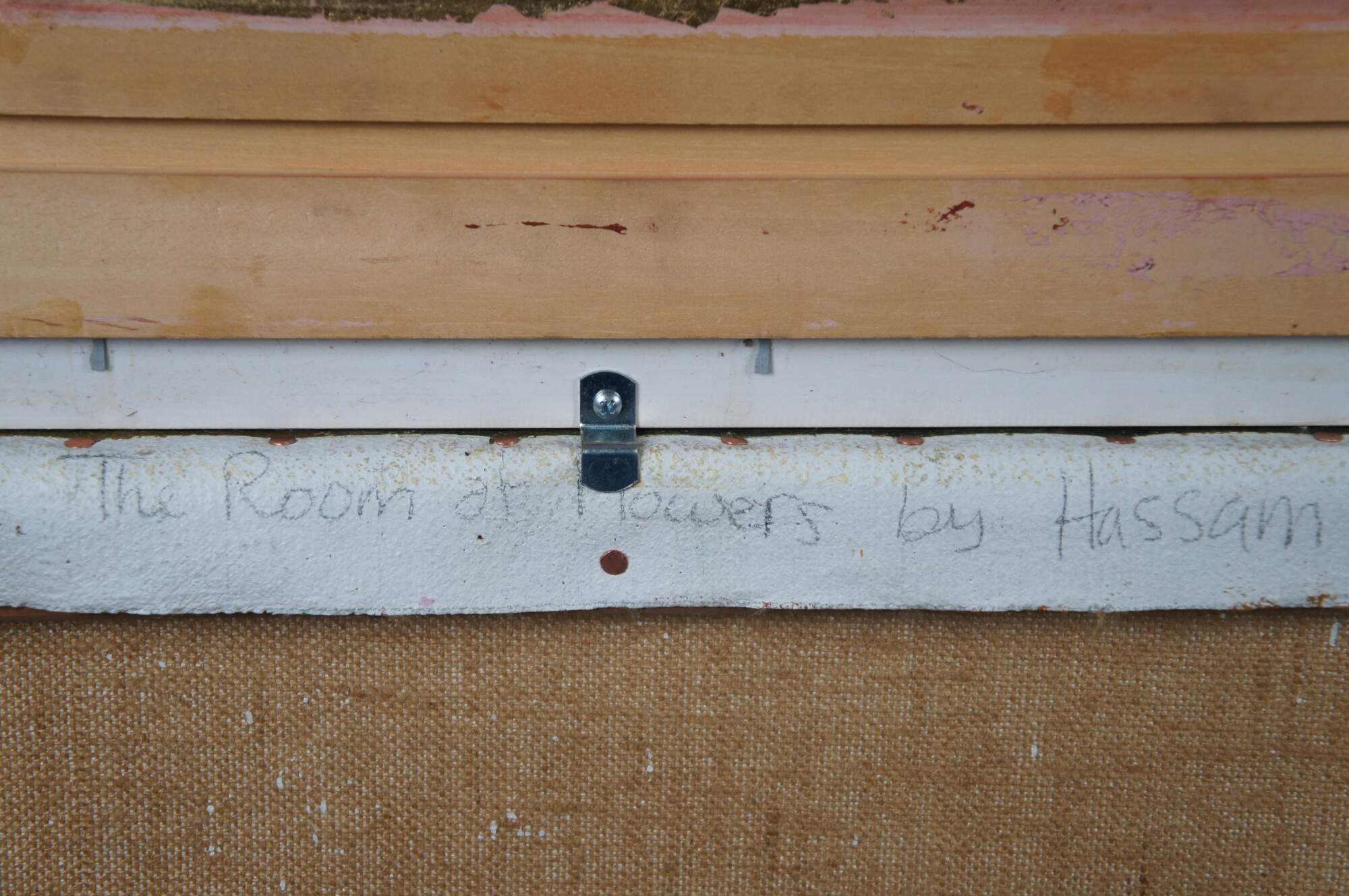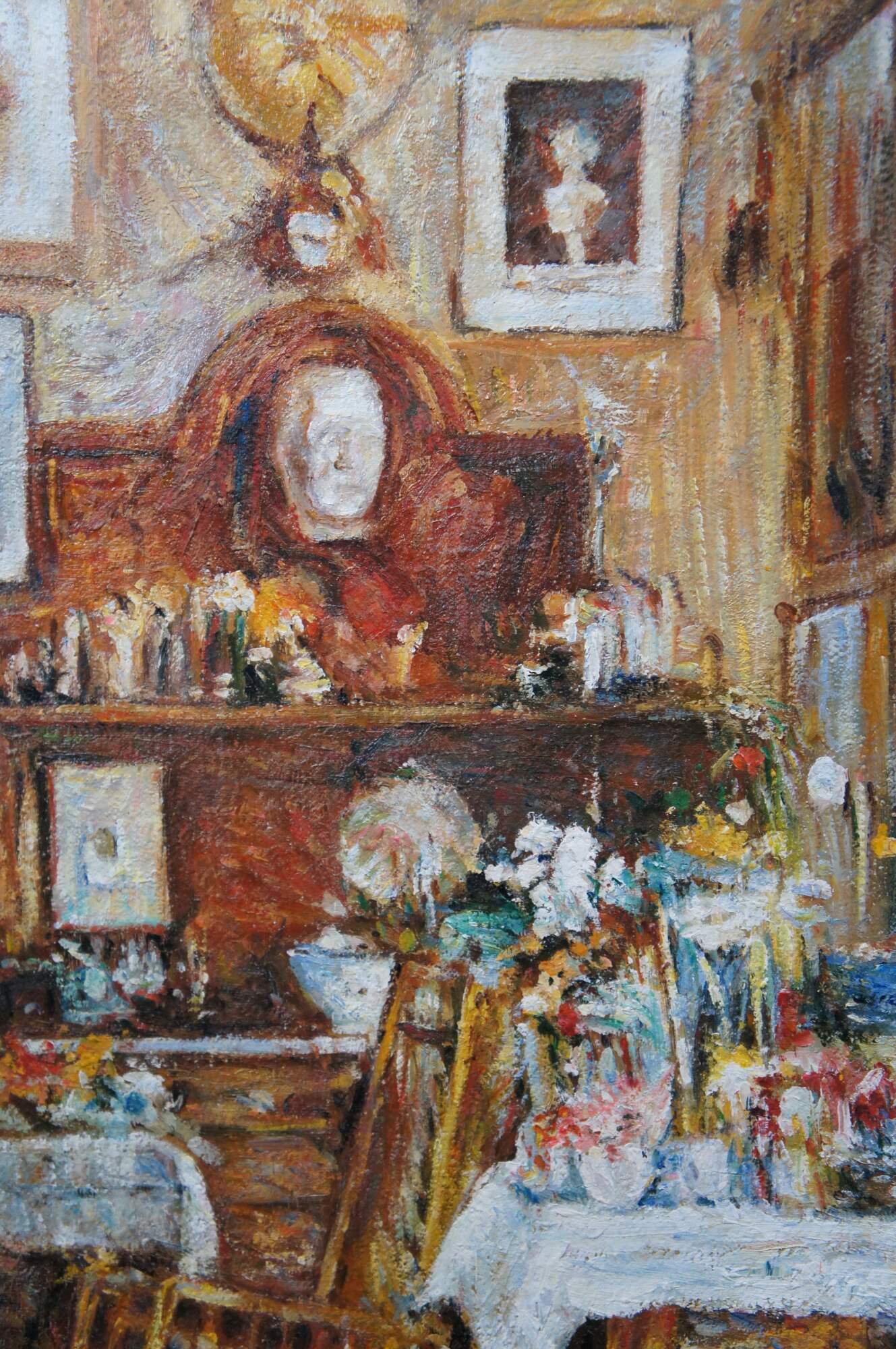Late 20th century oil on canvas painting after "The Room of Flowers" by Frederick Childe Hassam (first painted in 1894). Depicts an impressionist-style interior view of a cozy looking parlor room cluttered with flowers and art. Beveled giltwood frame with rope twist detail; white linen mat.