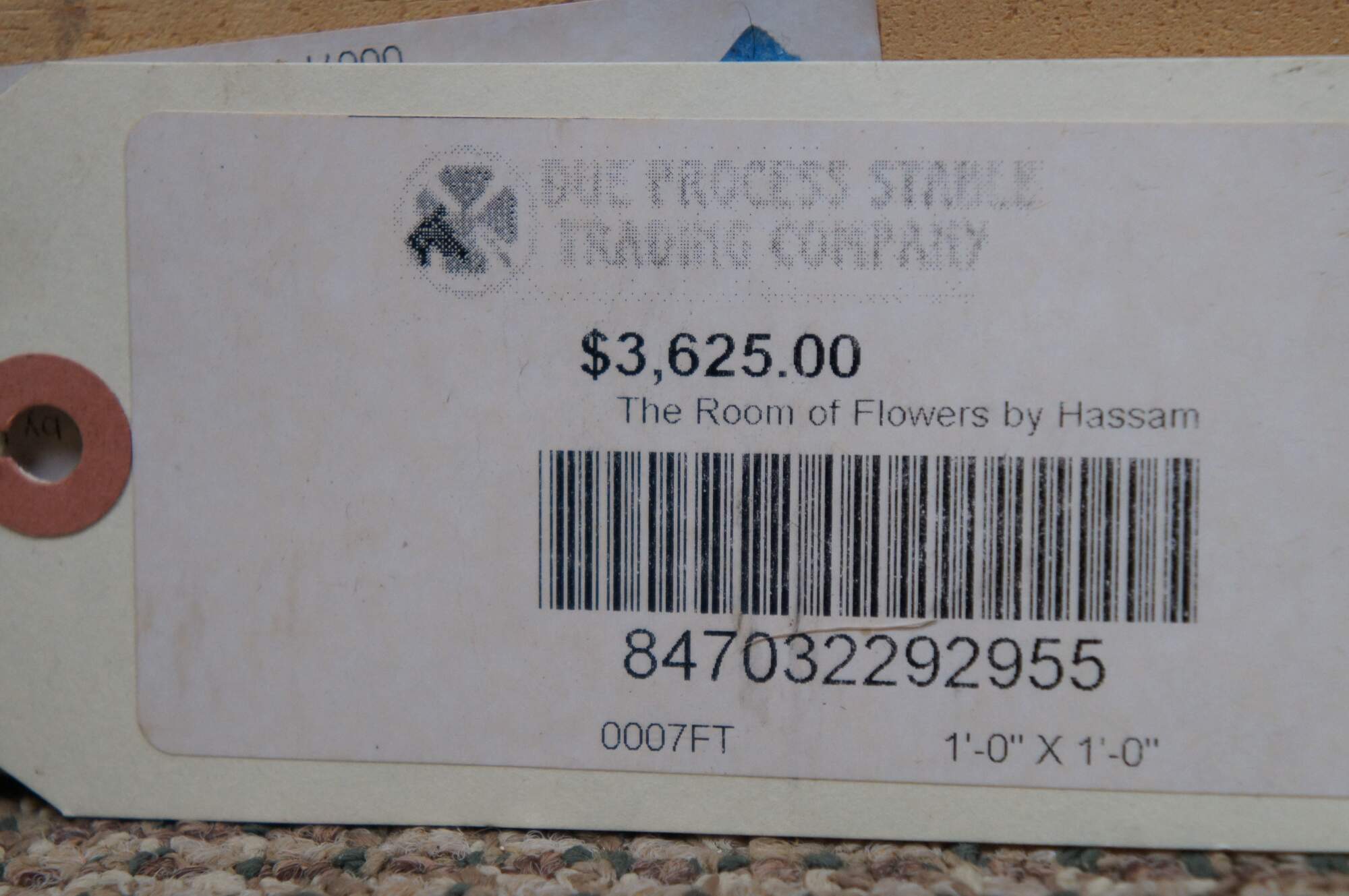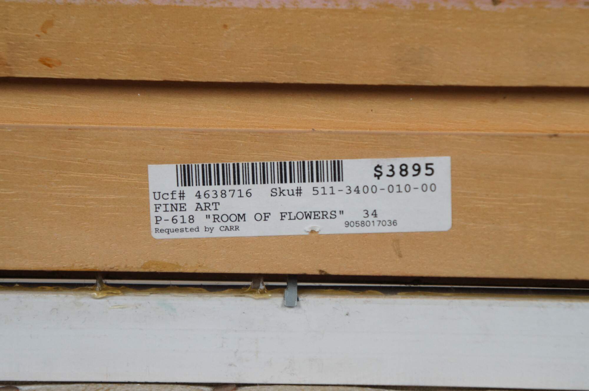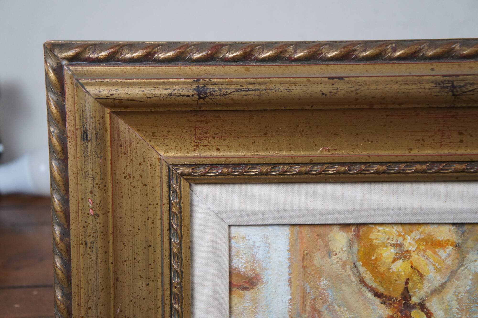 Late 20th century oil on canvas painting after "The Room of Flowers" by Frederick Childe Hassam (first painted in 1894). Depicts an impressionist-style interior view of a cozy looking parlor room cluttered with flowers and art. Beveled giltwood frame with rope twist detail; white linen mat.
