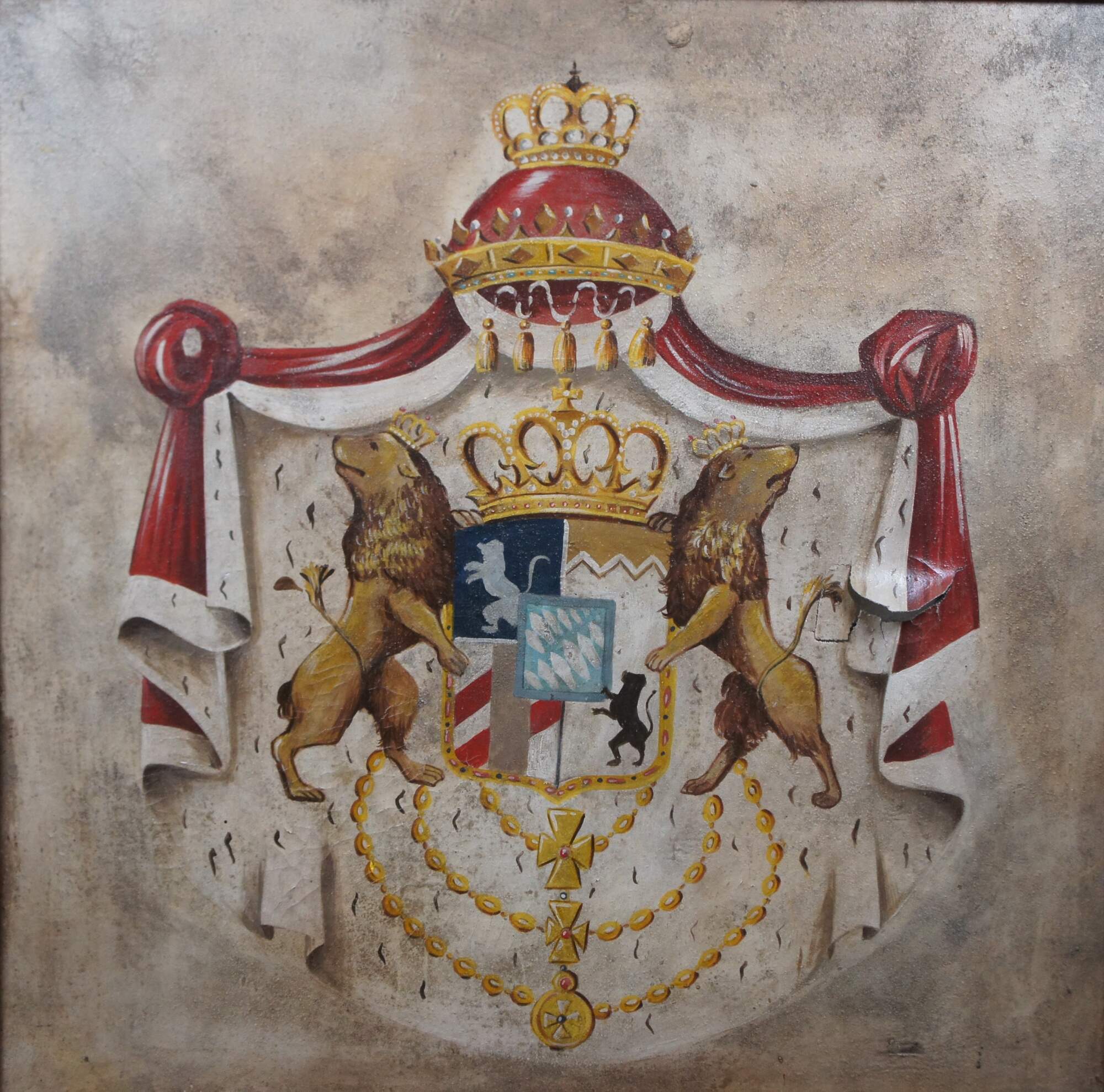 Late 20th century Kingdom of Bavaria stemma / coat of arms / heraldic crest oil painting on canvas. Antiqued coloration. Beveled wood frame. Produced by Artigianato Artistico Italiano (Handicrafts in Italy) and the Trevor James Company.