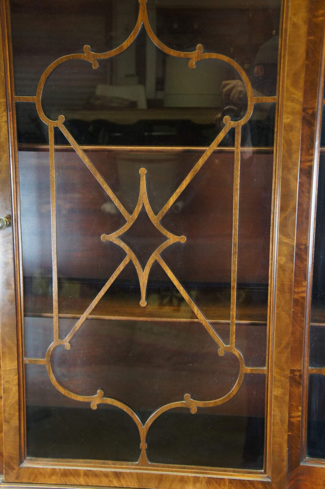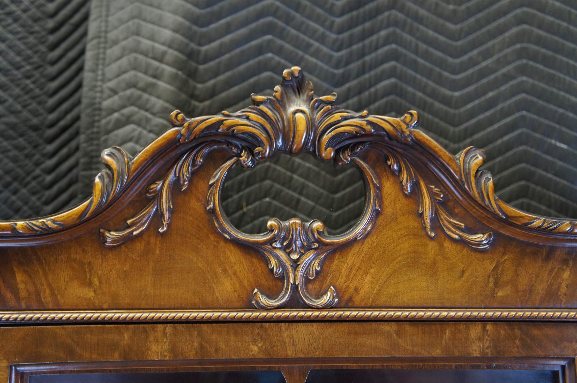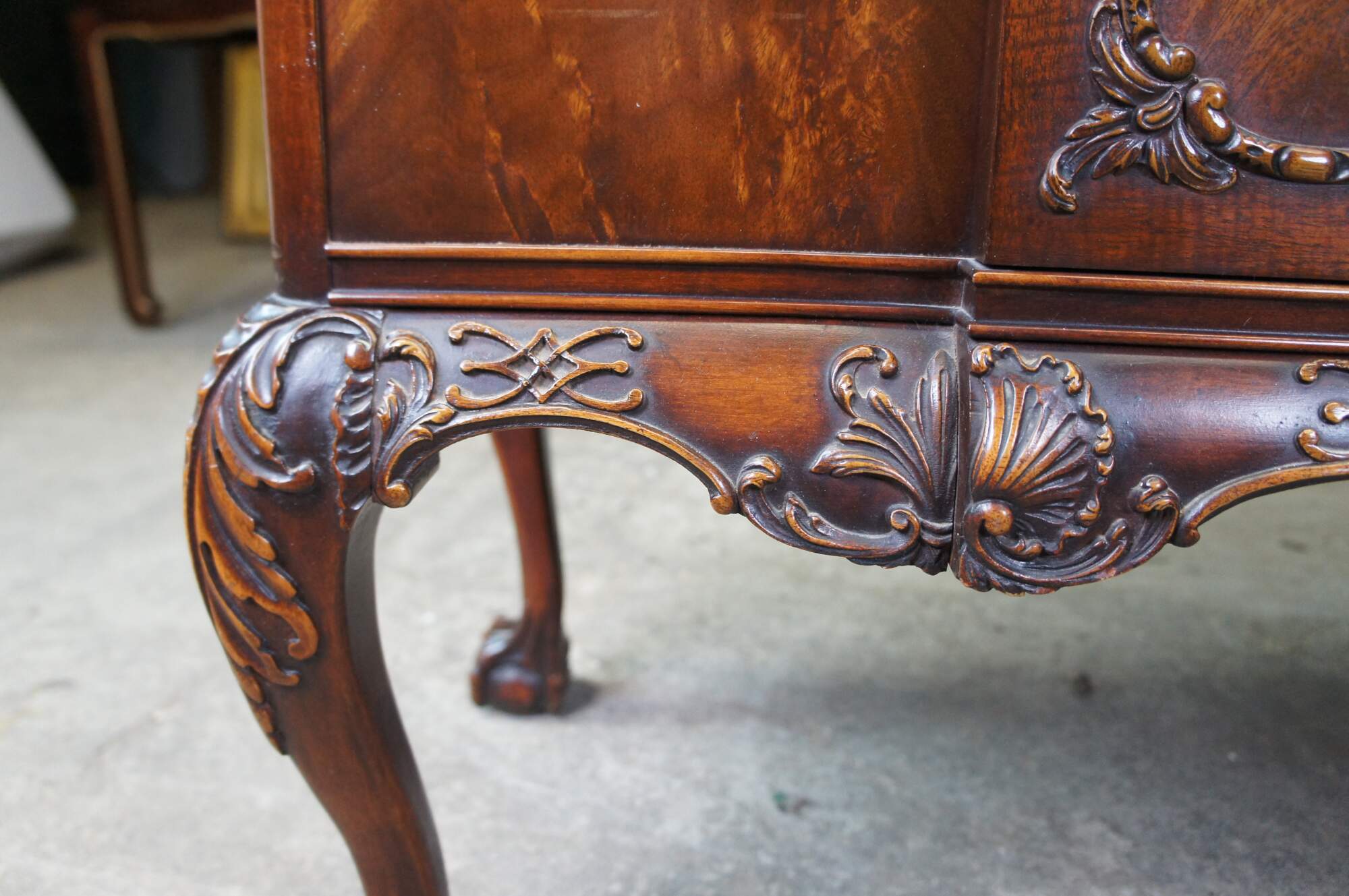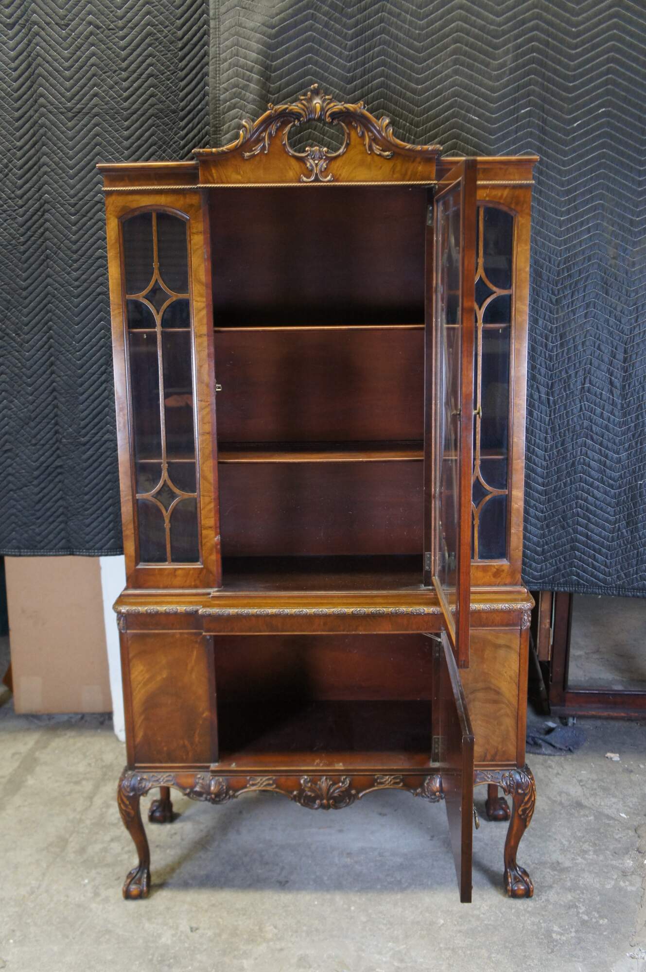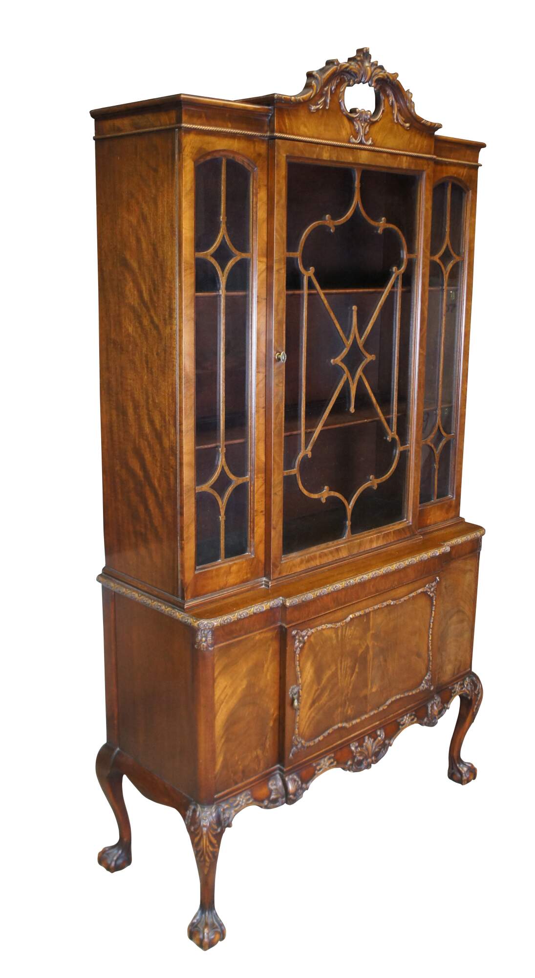 Early 20th Century English Chippendale / Georgian style China Hutch / Curio / Display Cabinet by Romweber Industries. Circa 1920s. Made from crotch mahogany with a graceful breakfront form featuring carved and scalloped aprons. The cabinet is supported by cabriole legs with acanthus carved knees over ball and claw feet. Upper hutch has two shelves with plate grooves while lower buffet portion opens to a large area for storage of china or collectibles. The crown showcases an oppen cartouche with foliate and canthus carved detail.