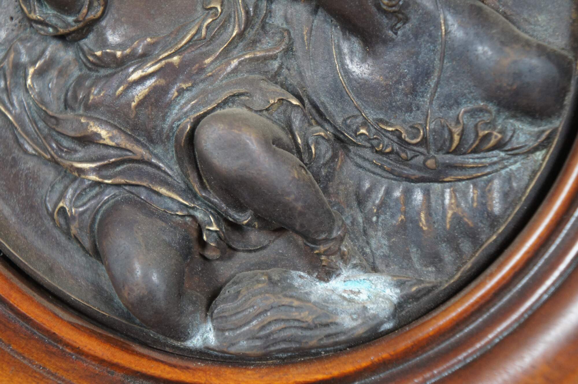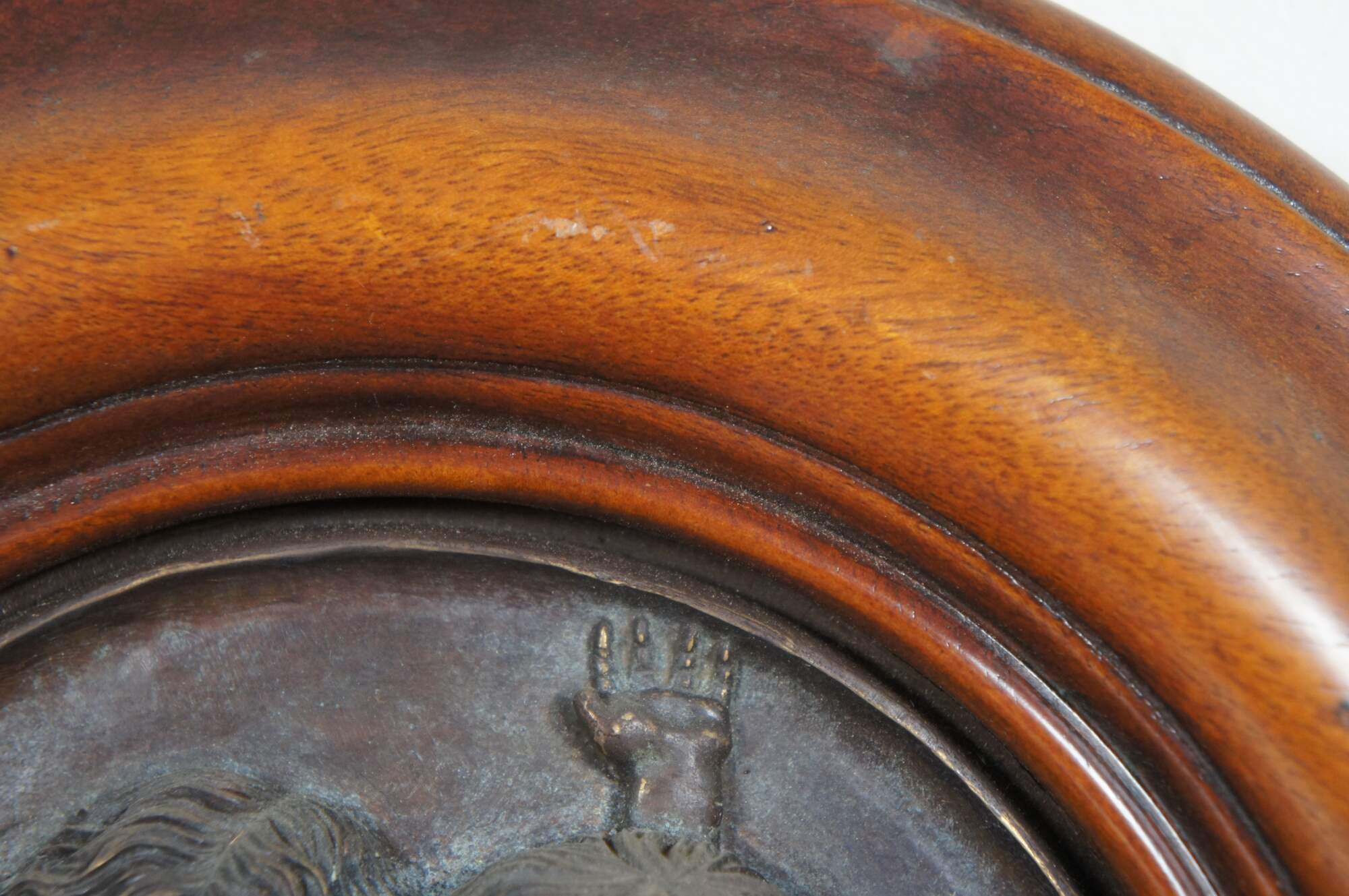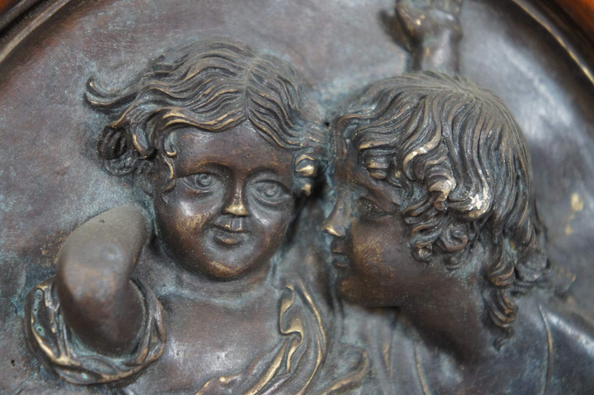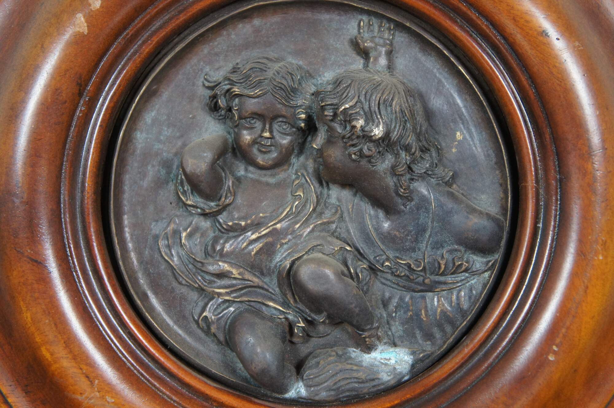Vintage Theodore Alexander wall hanging plaque framed in walnut around a bas relief in bronze of "The Calmady Children," by Edward William Wyon - after the painting by Sir Thomas Lawrence.