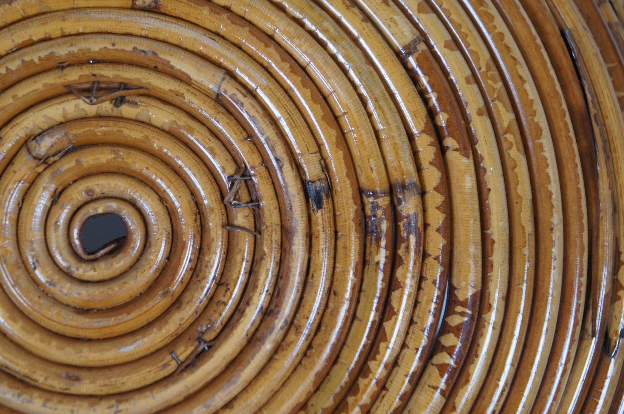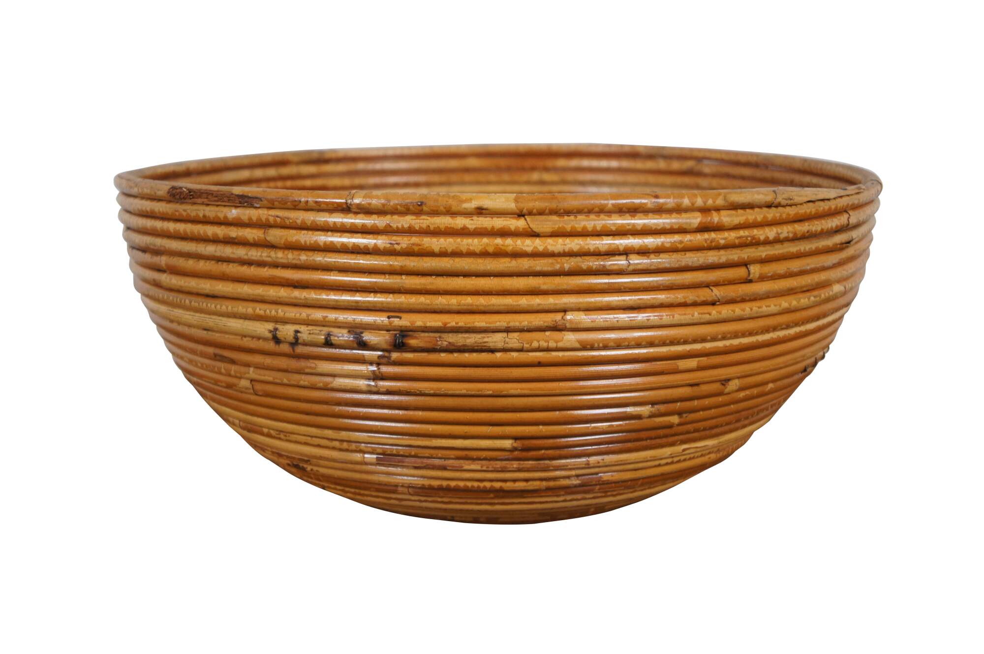 Very nice example of a large Italian mid-century modern pencil reed farmhouse centerpiece bowl or planter. Made of tightly coiled stalks of bamboo, rattan, or reed with a lightly distressed two-tone finish.