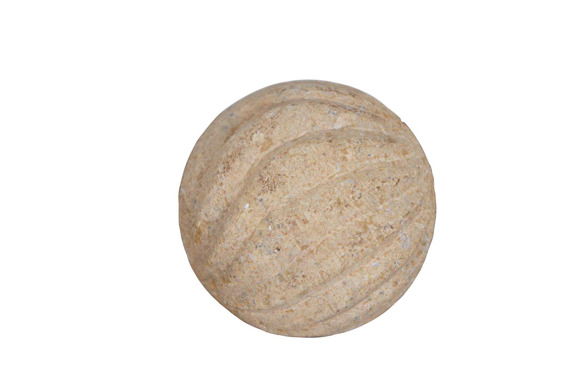 Set of three decorative, unpolished light brown stone balls / spheres / orbs, carved with slightly swirling ridges. Garden, Paperweight.