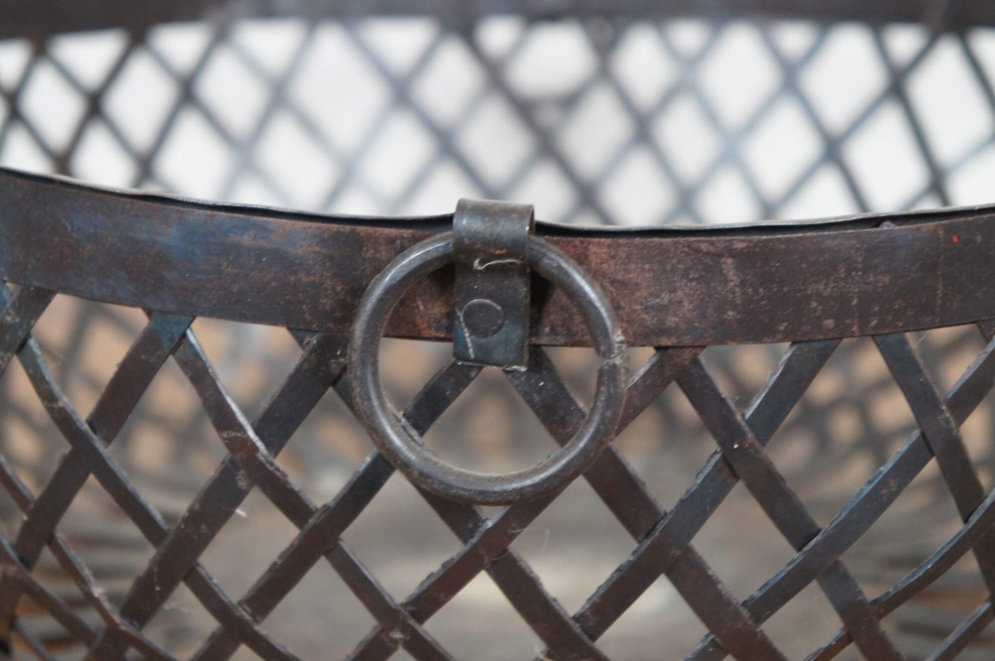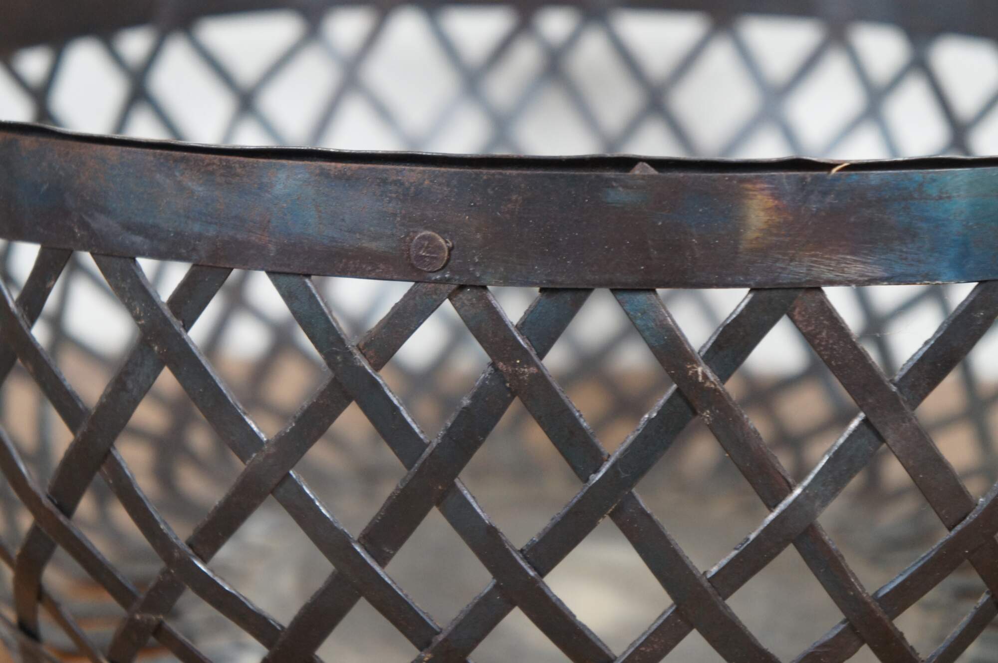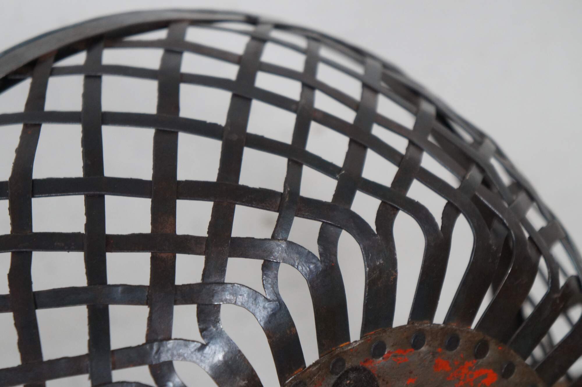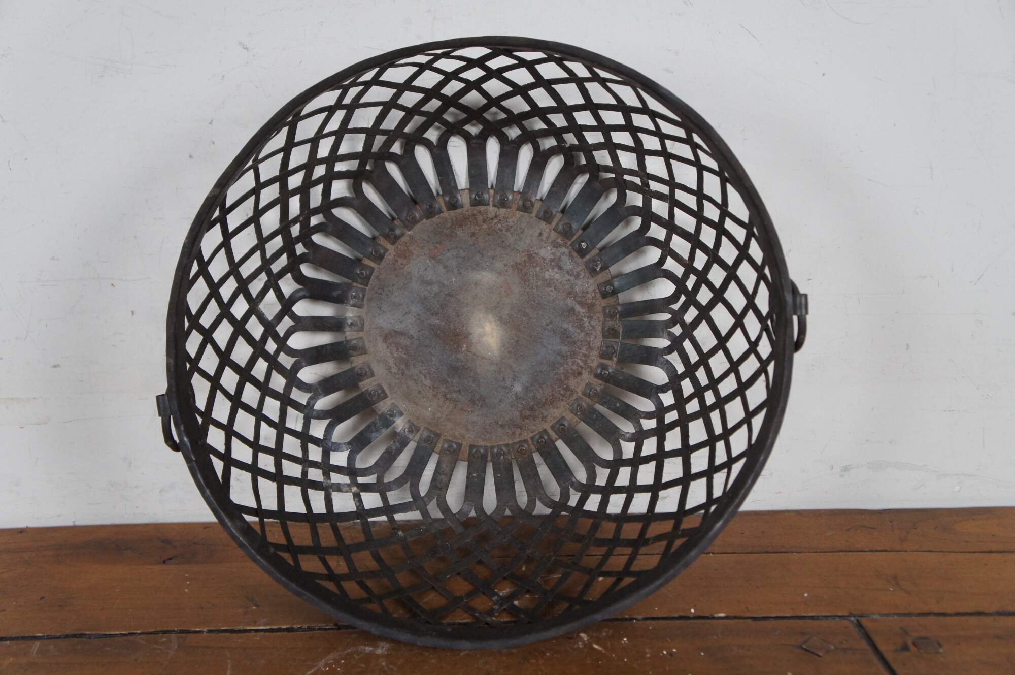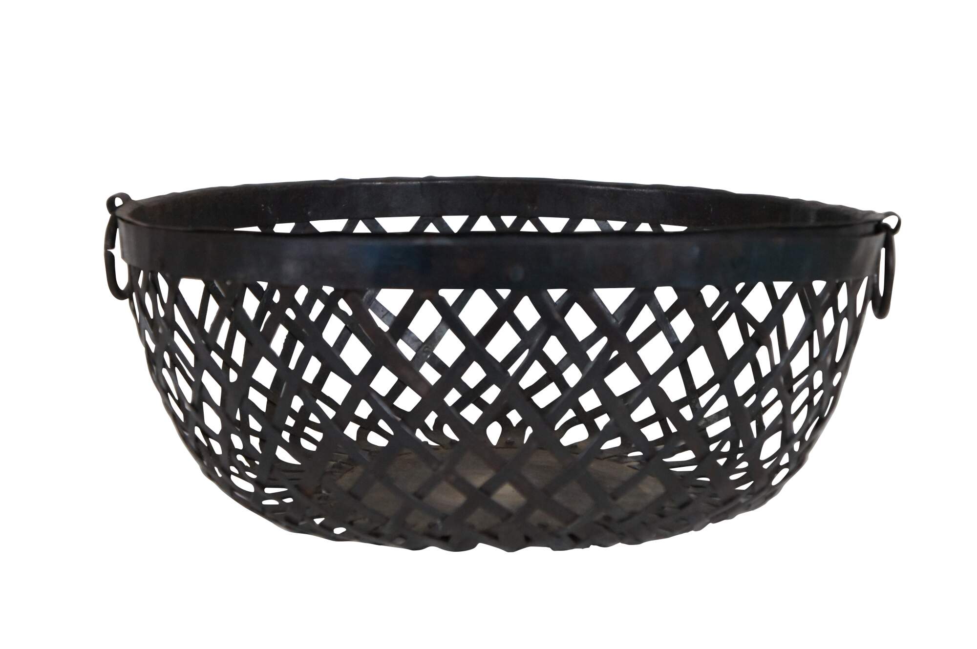 Late 20th century woven metal / iron centerpiece or fruit basket. Round Brutalist form with flat base and two hanging rings / handles on either side. Made in India.