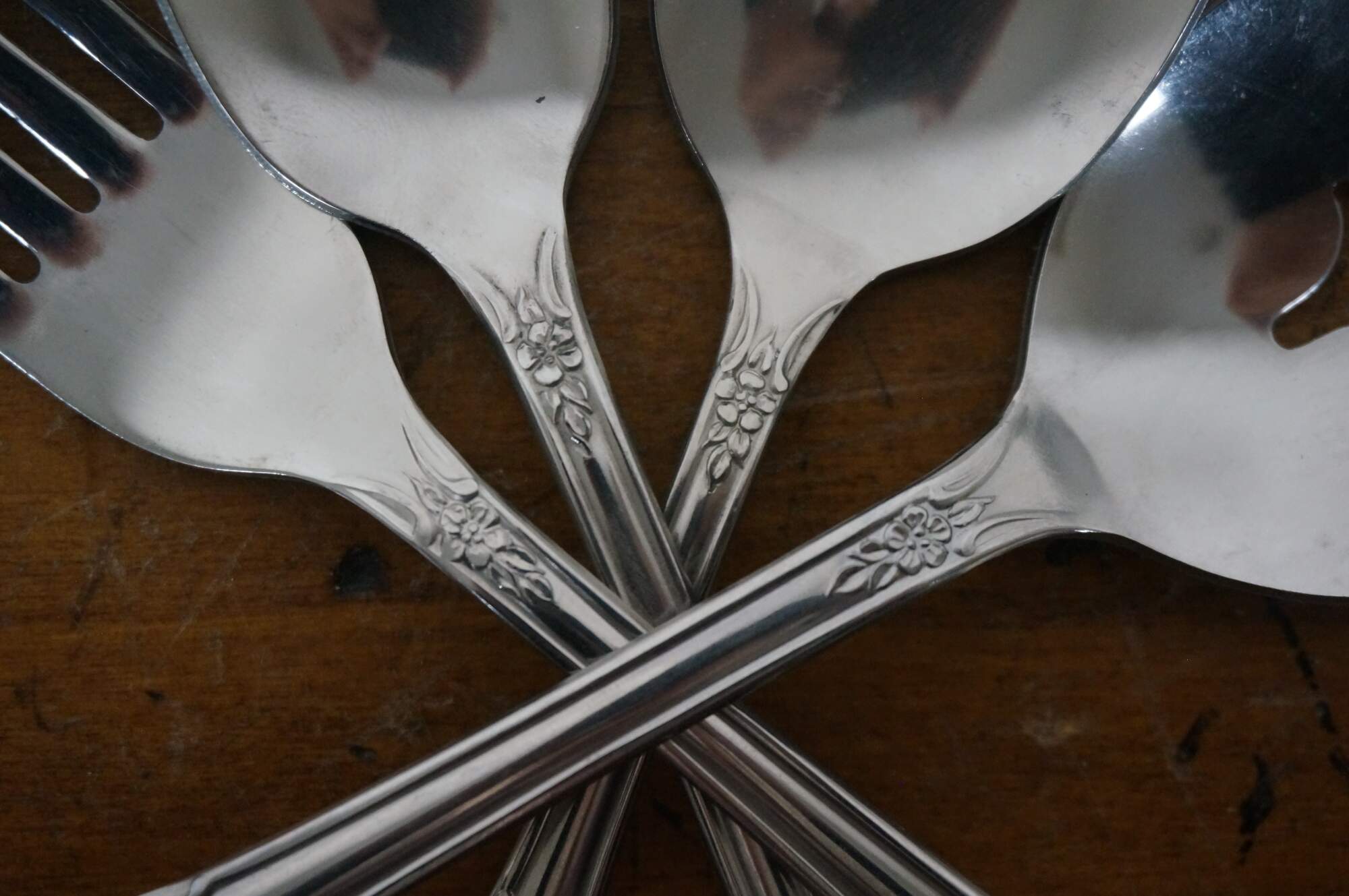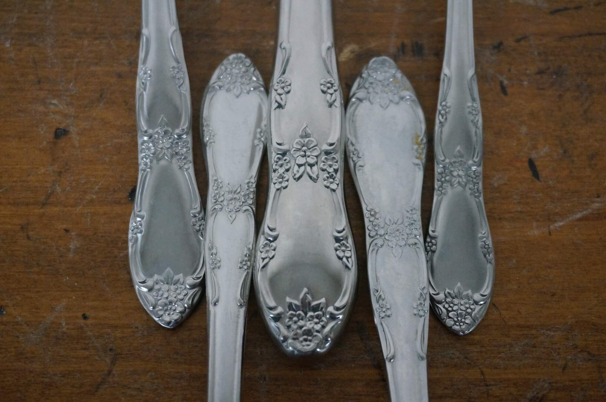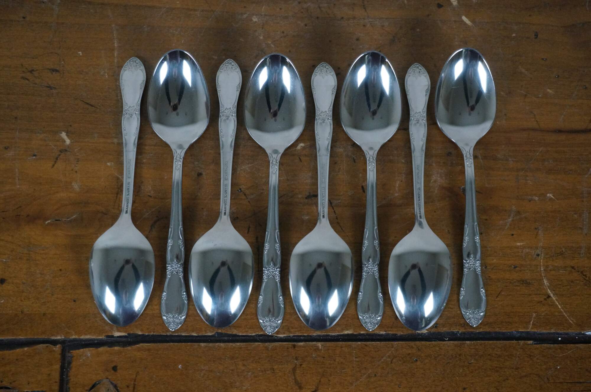 Vintage 48 piece set of Wm. A. Rogers / Oneida Ltd stainless steel flatware / utensils in the Fenway Daydream pattern. Originally a set of 62 pieces. Set currently includes: 16 Teaspoons, 1 Dinner Fork, 1 Iced Tea Spoon, 8 Salad Forks, 1 Cold Meat Fork, 8 Soup (Table) Spoons, 1 Butter Knife, 1 Sugar Spoon, 2 Table (Serving) Spoons, 1 Pierced Table (Serving) Spoon, 8 Dinner Knives.
