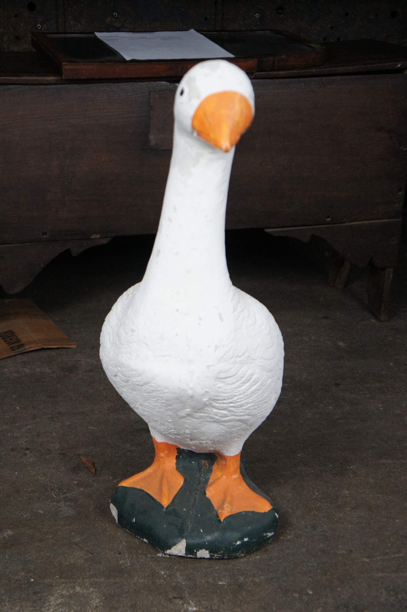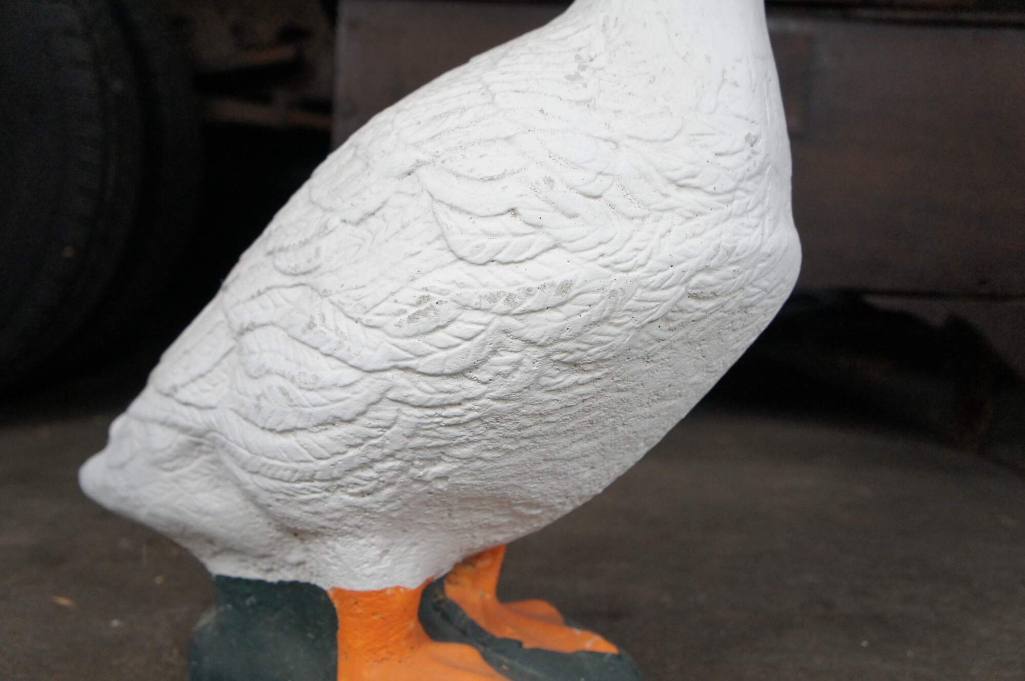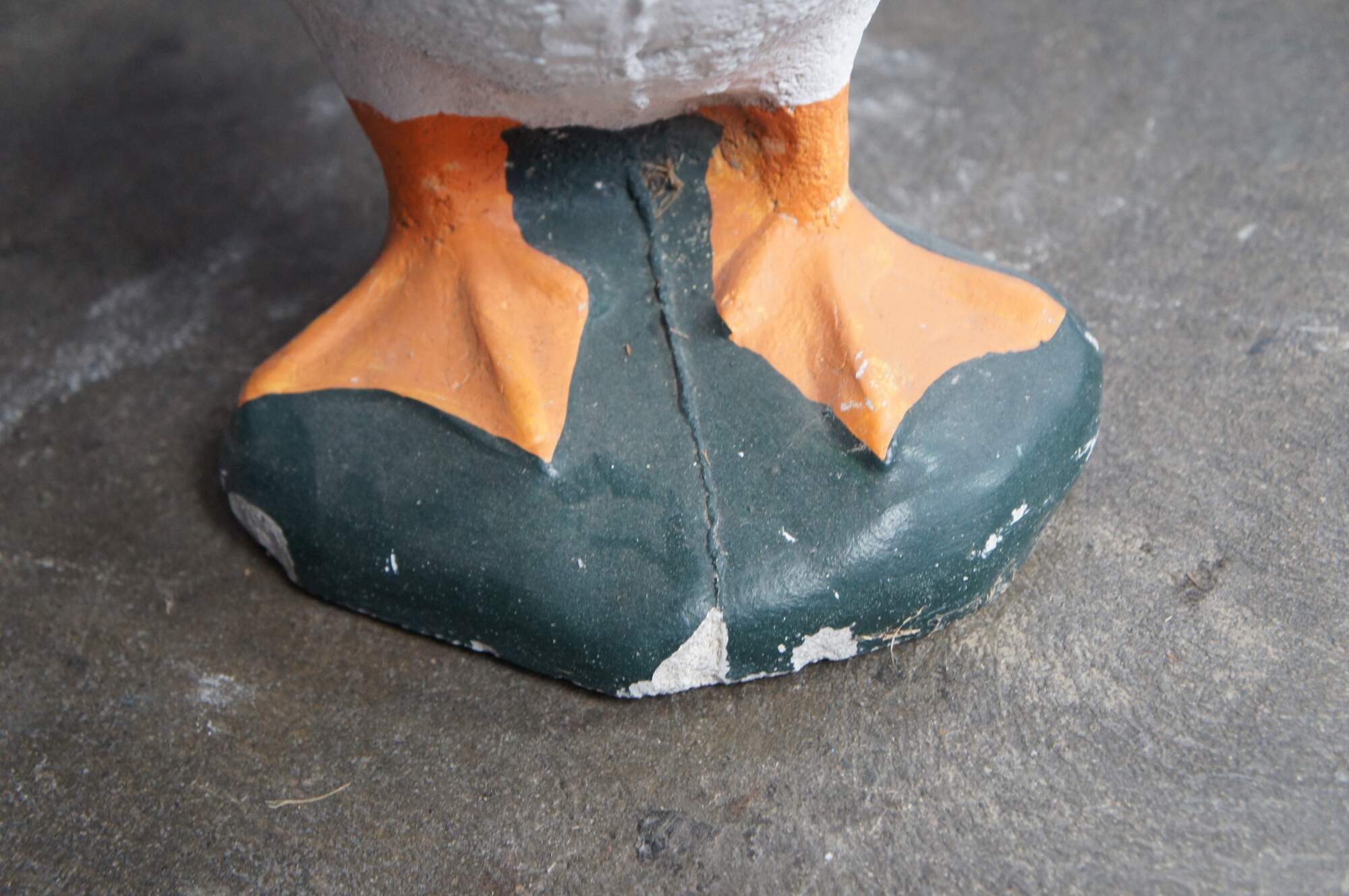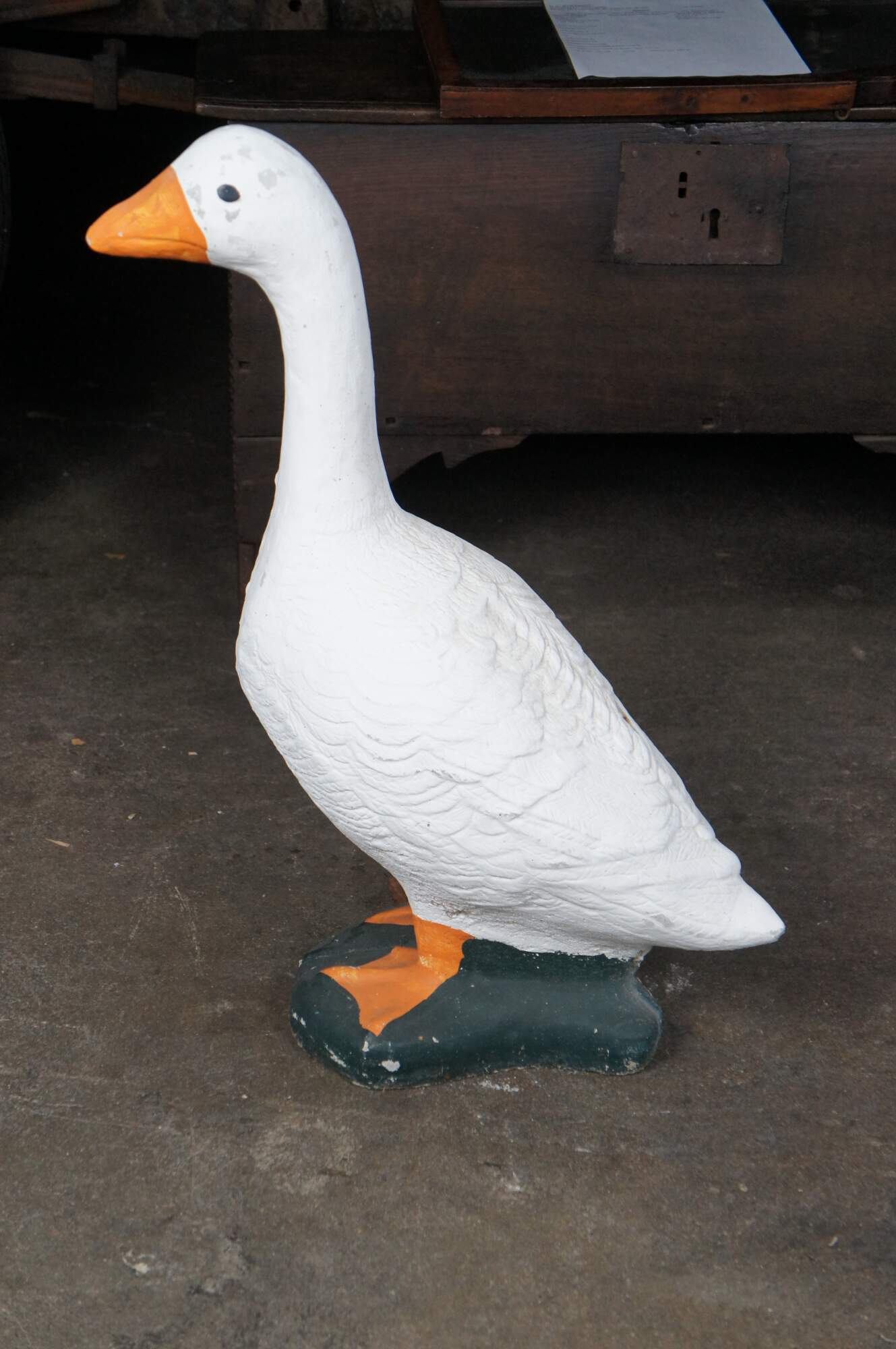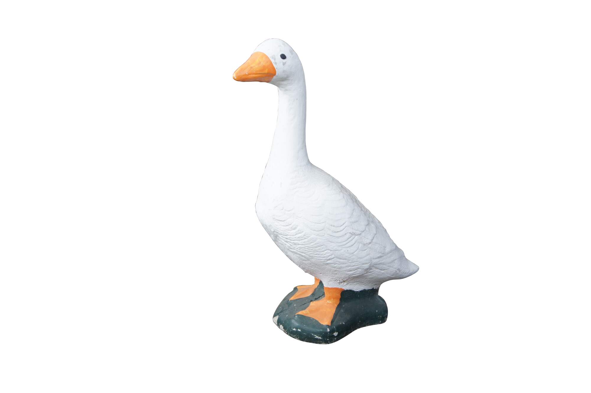 A fun cast concrete goose from the last quarter of the 20th century. It features a traditional hand-painted motif.