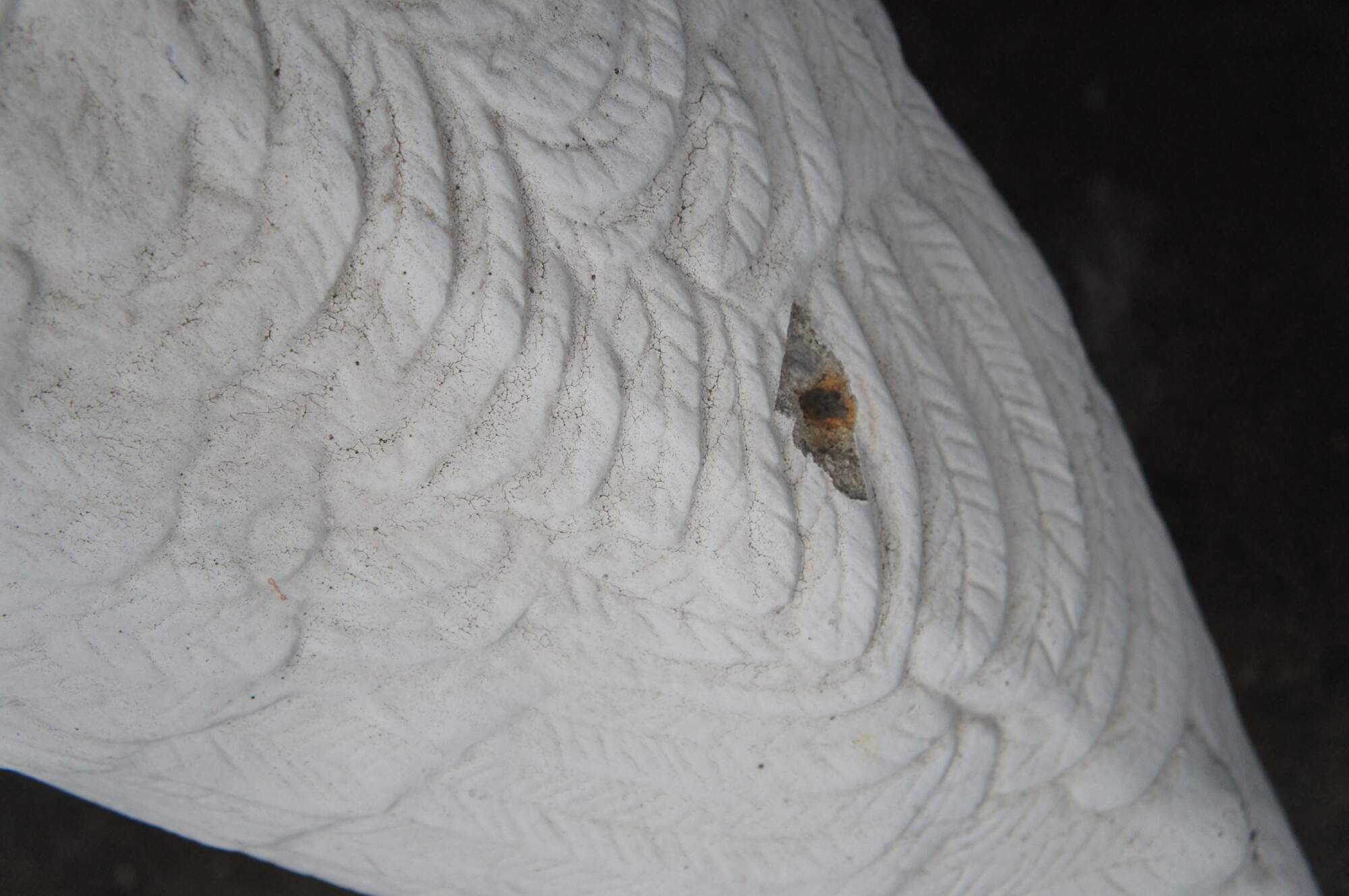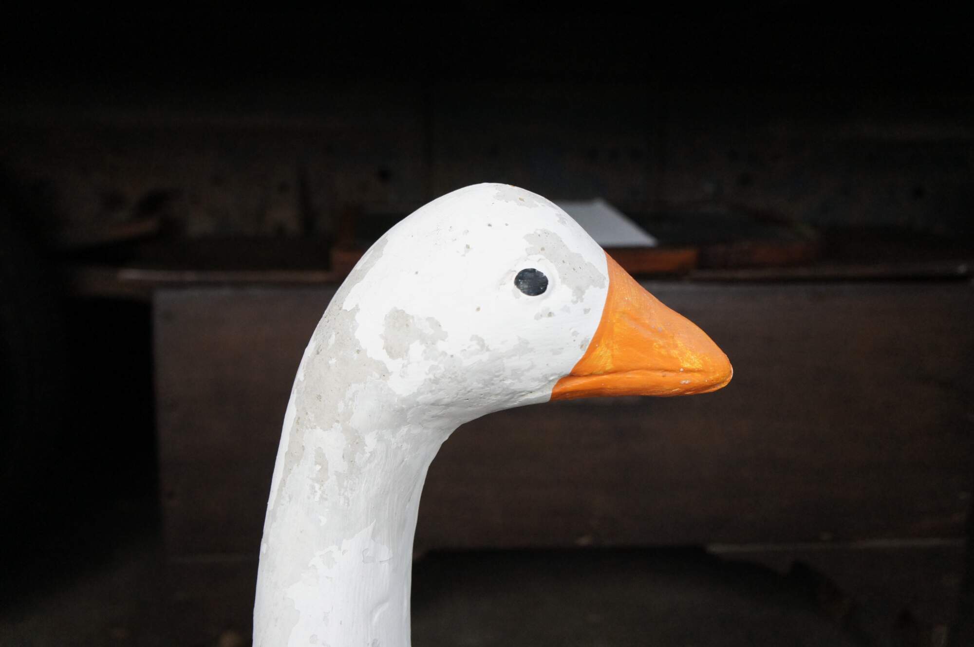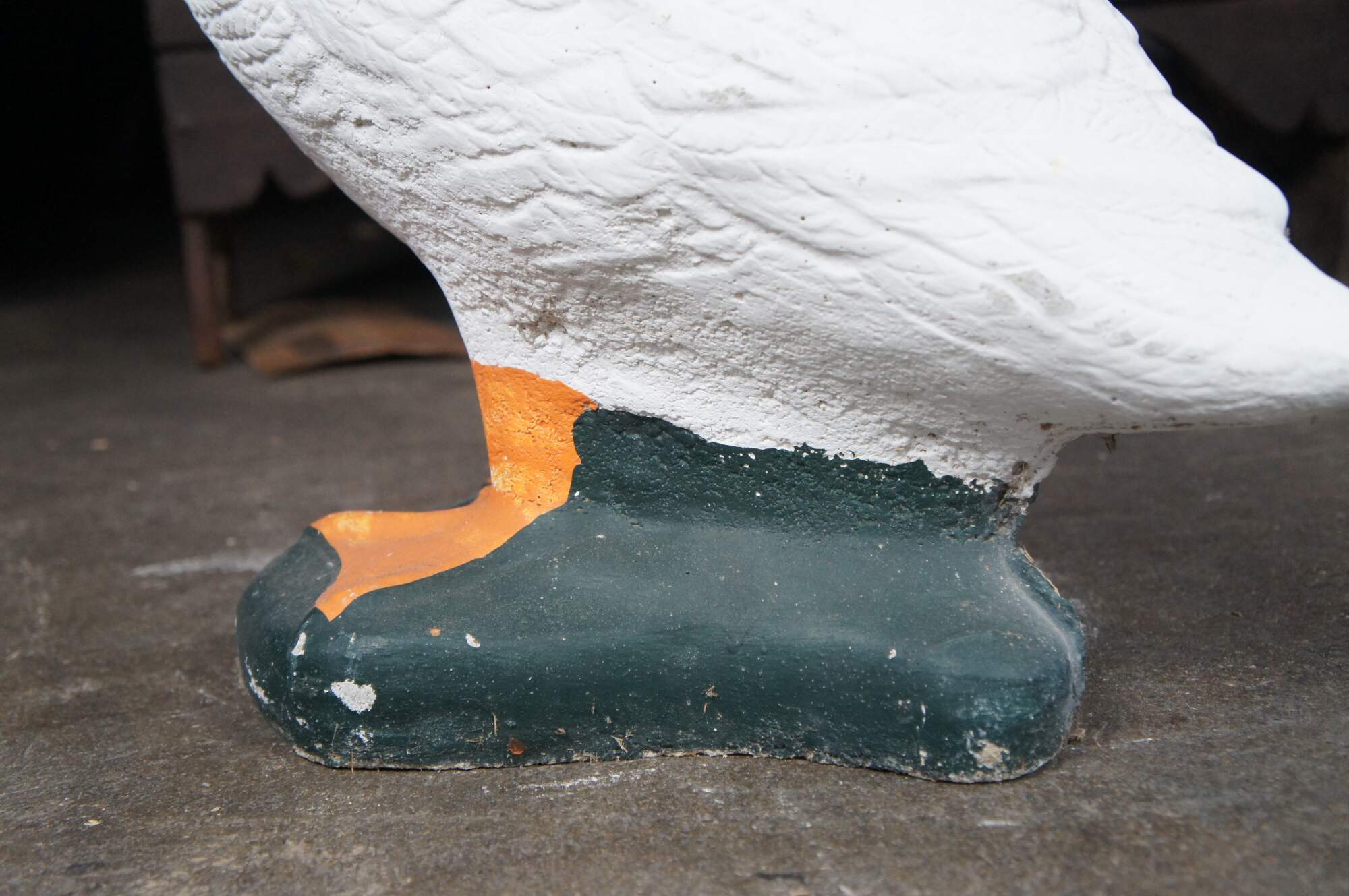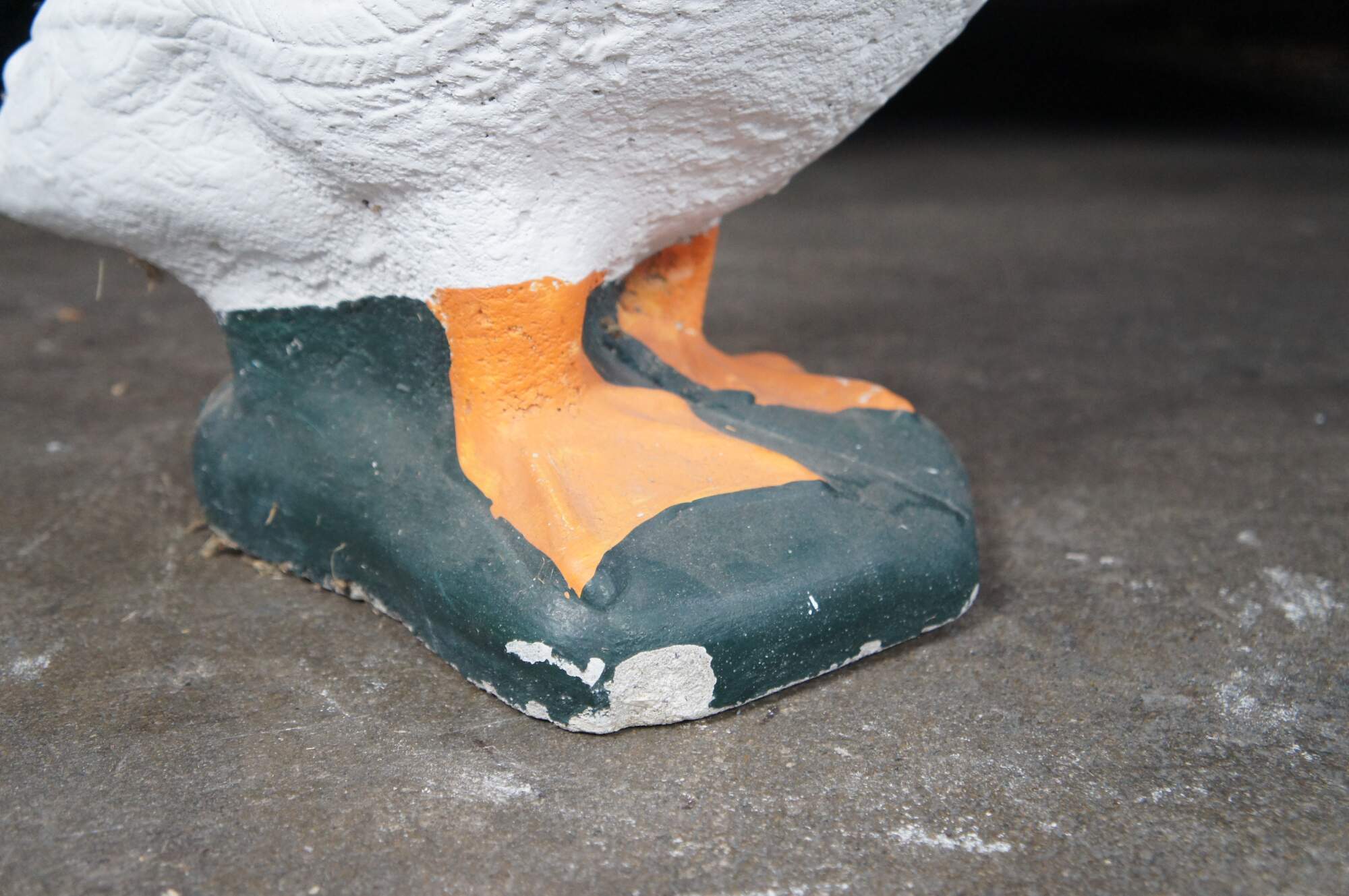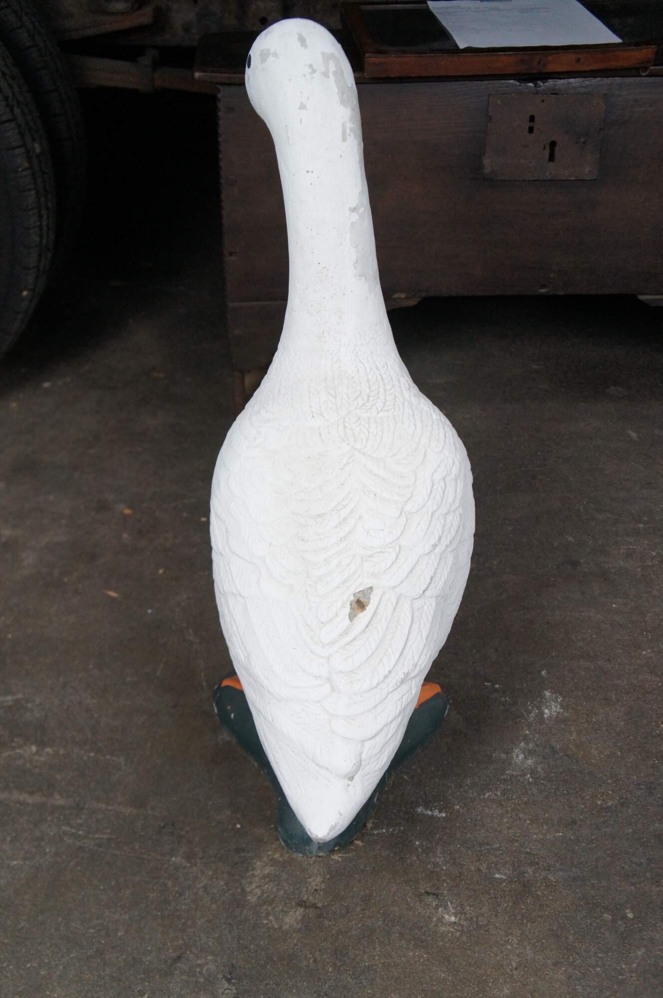 A fun cast concrete goose from the last quarter of the 20th century. It features a traditional hand-painted motif.