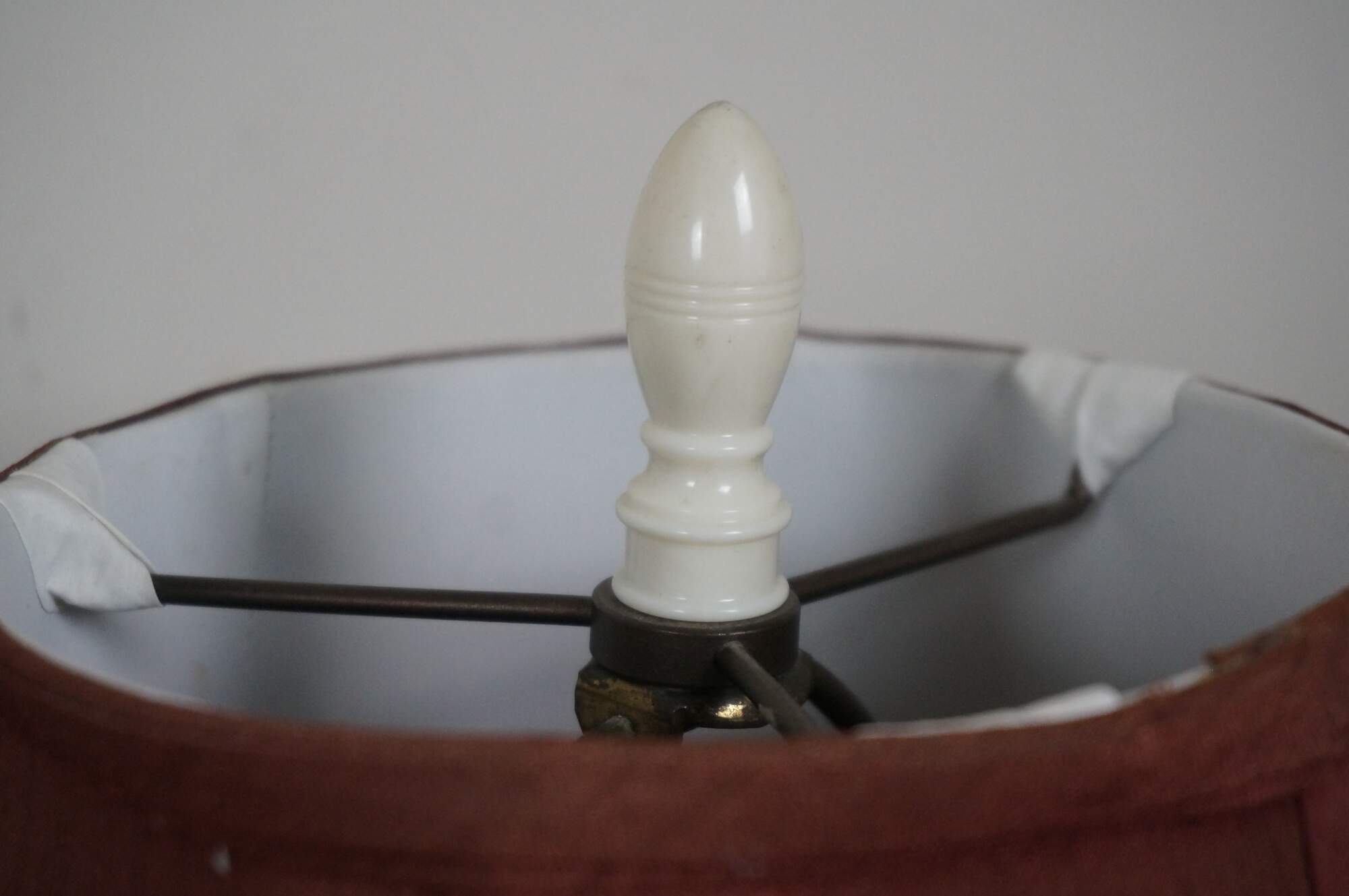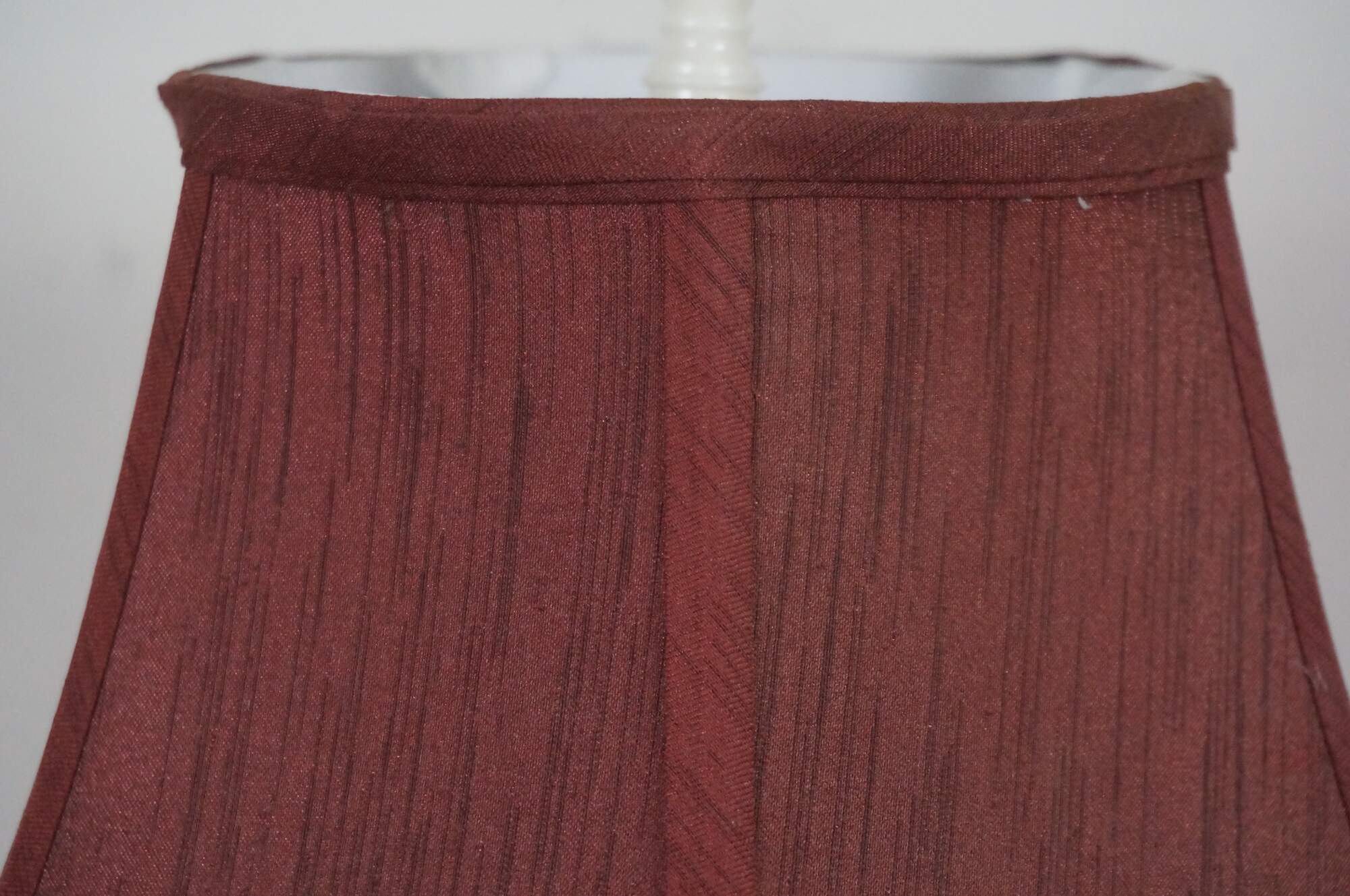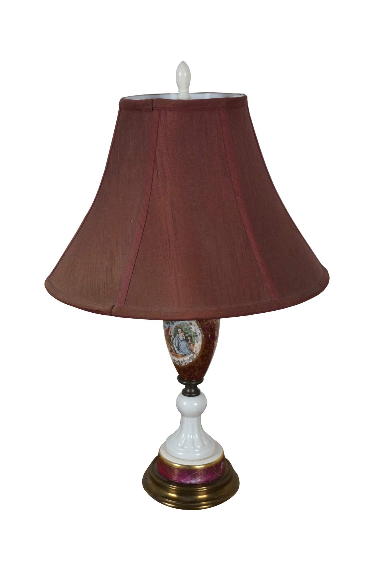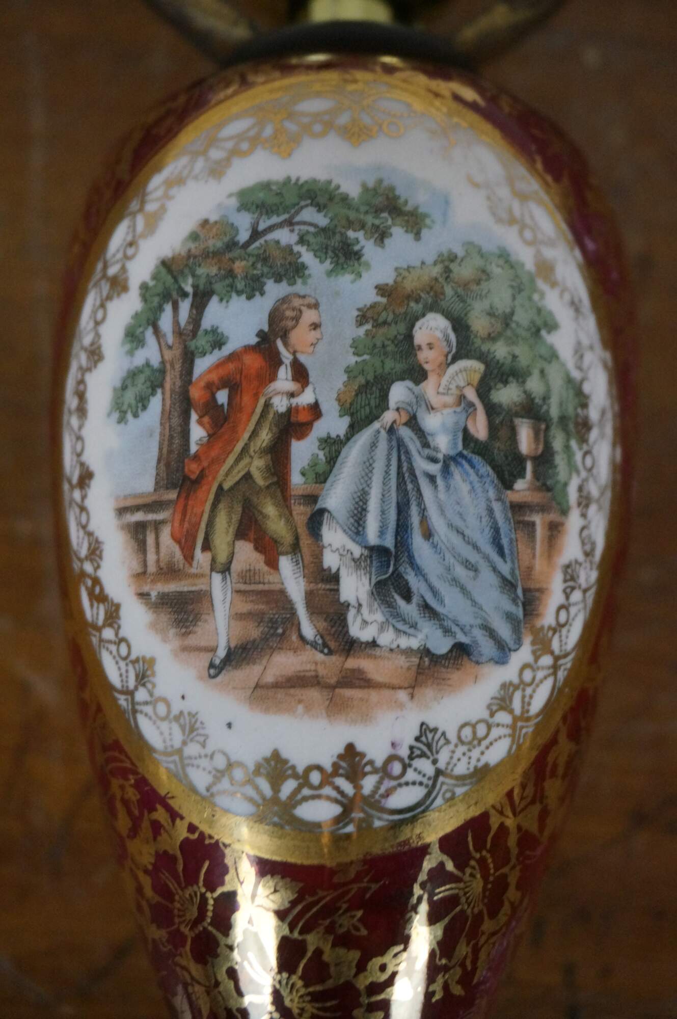Mid century Sevres style porcelain table / vanity / boudoire mantel urn lamp with brass base, painted in burgundy overlaid with a gilt floral pattern surrounding an image of a French Provinical / Neoclassical couple on a stone veranda. Includes harp, white plastic finial, and burgundy fabric shade.