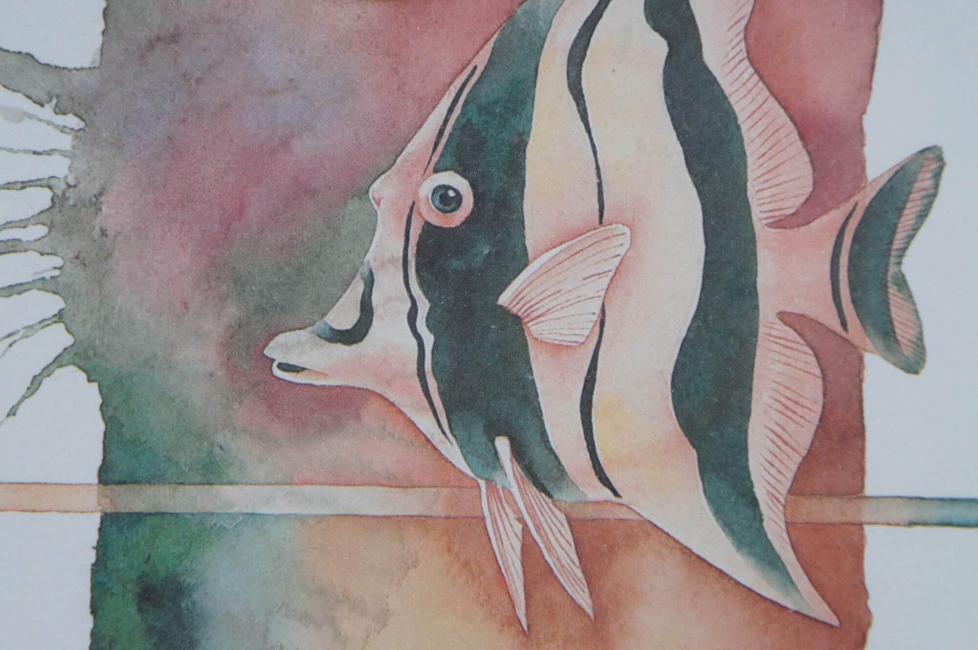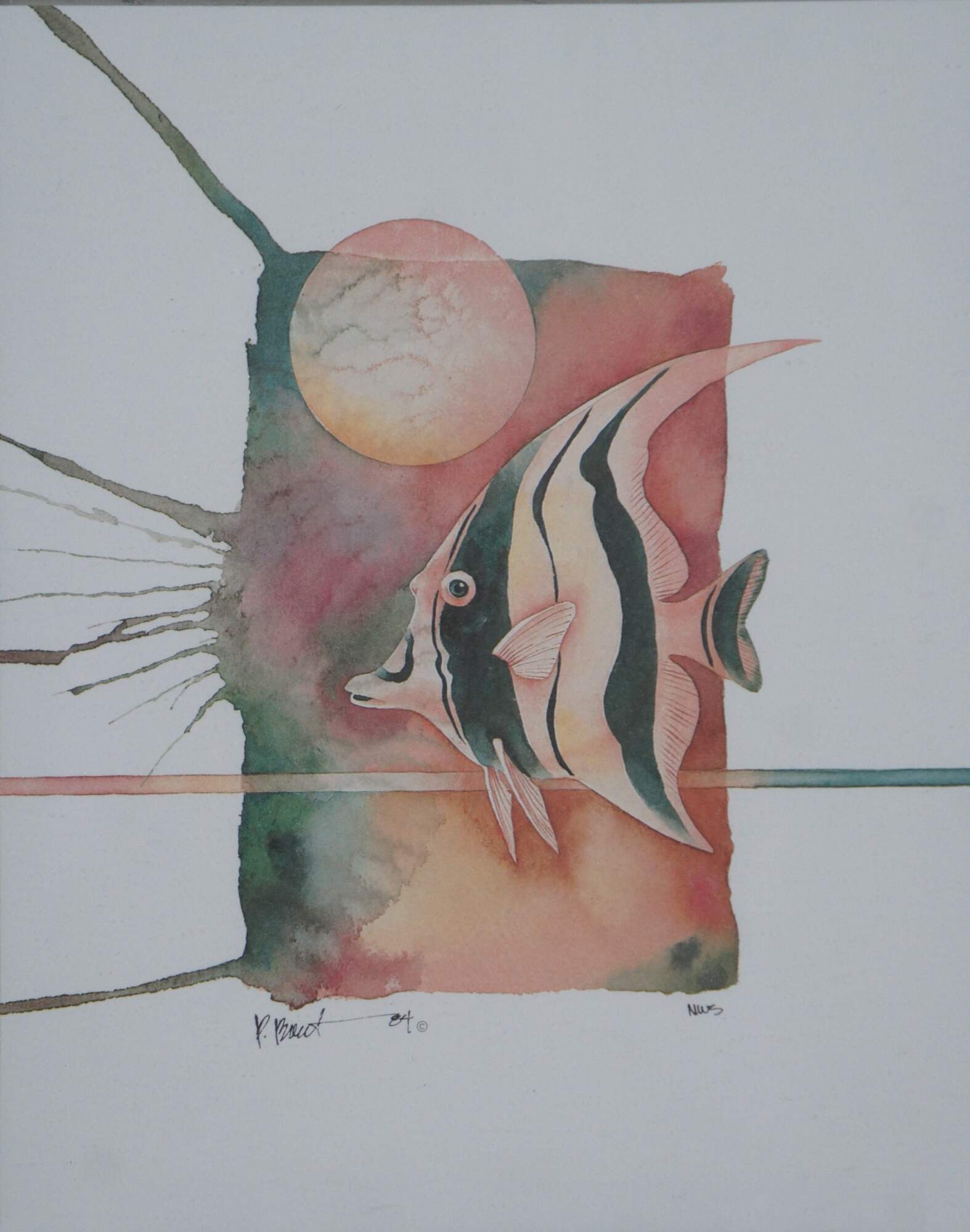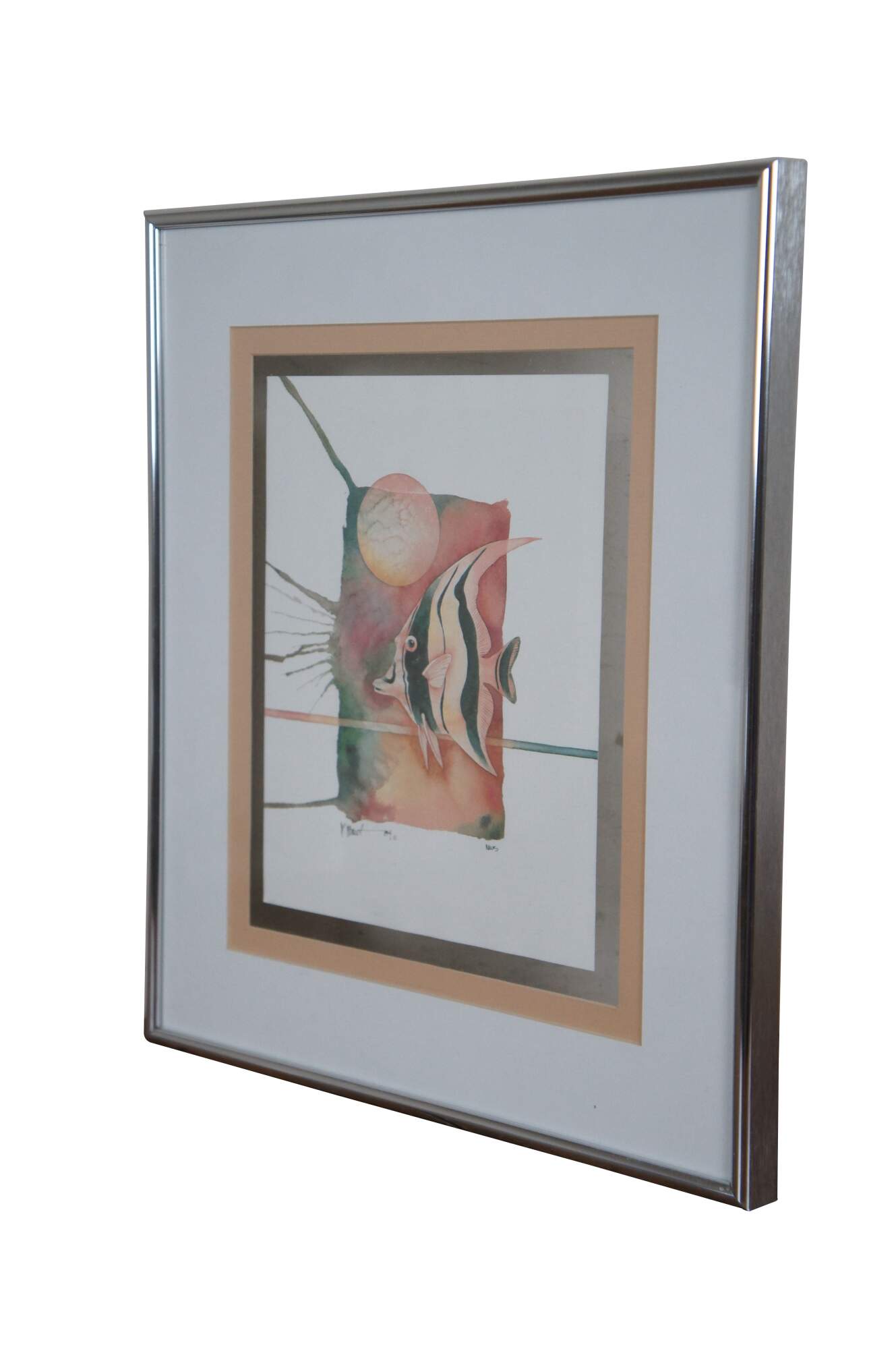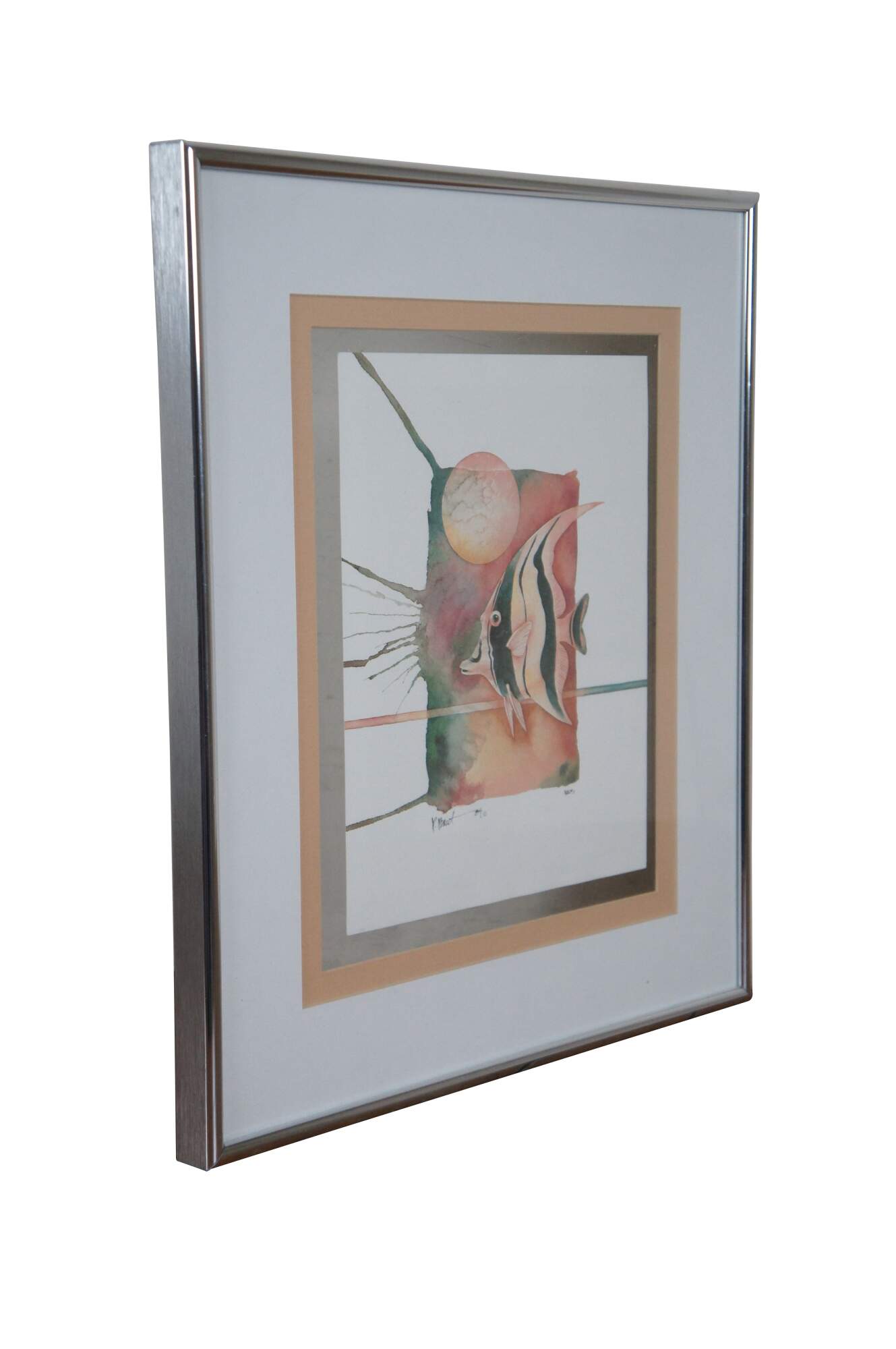 Vintage circa 1980's Paul Brent lithograph print depicting a striped angel fish on a splash of green, pink and orange. Signed in plate. Silver tone metal floating frame; white and beige layered mat. Edward Art Products, Style 6975.