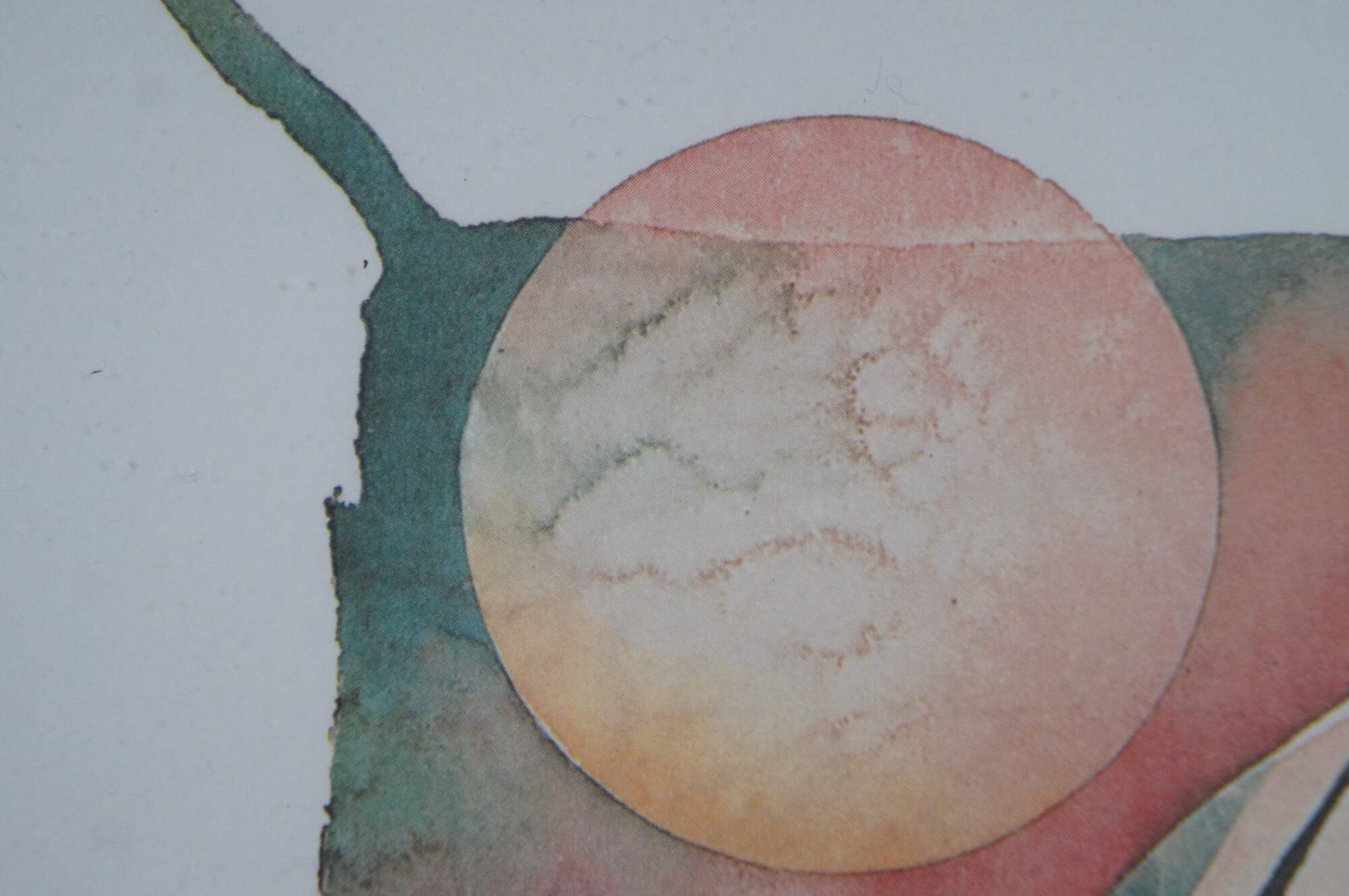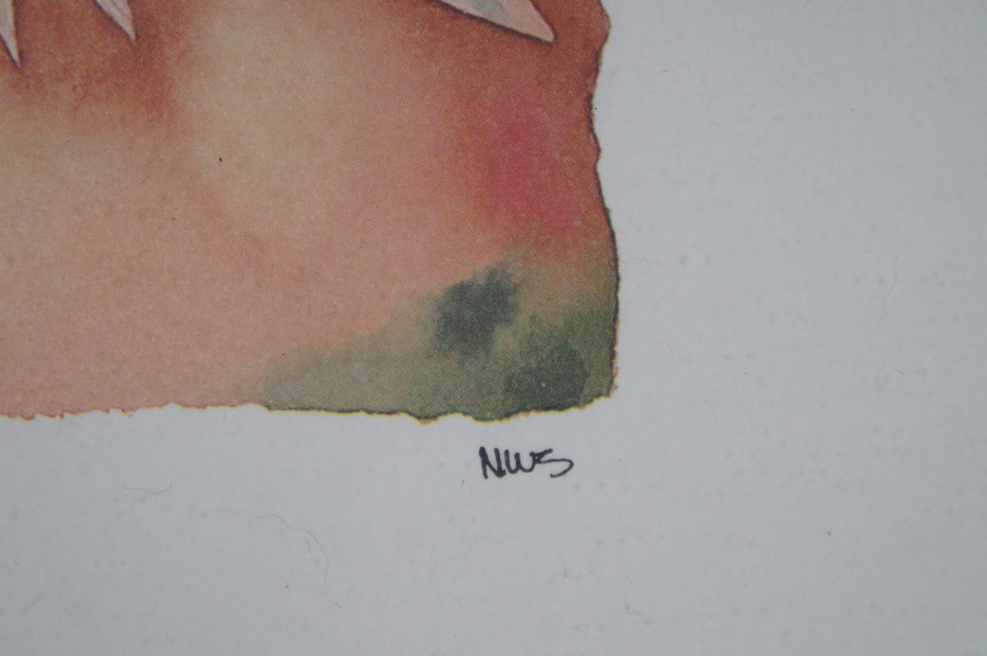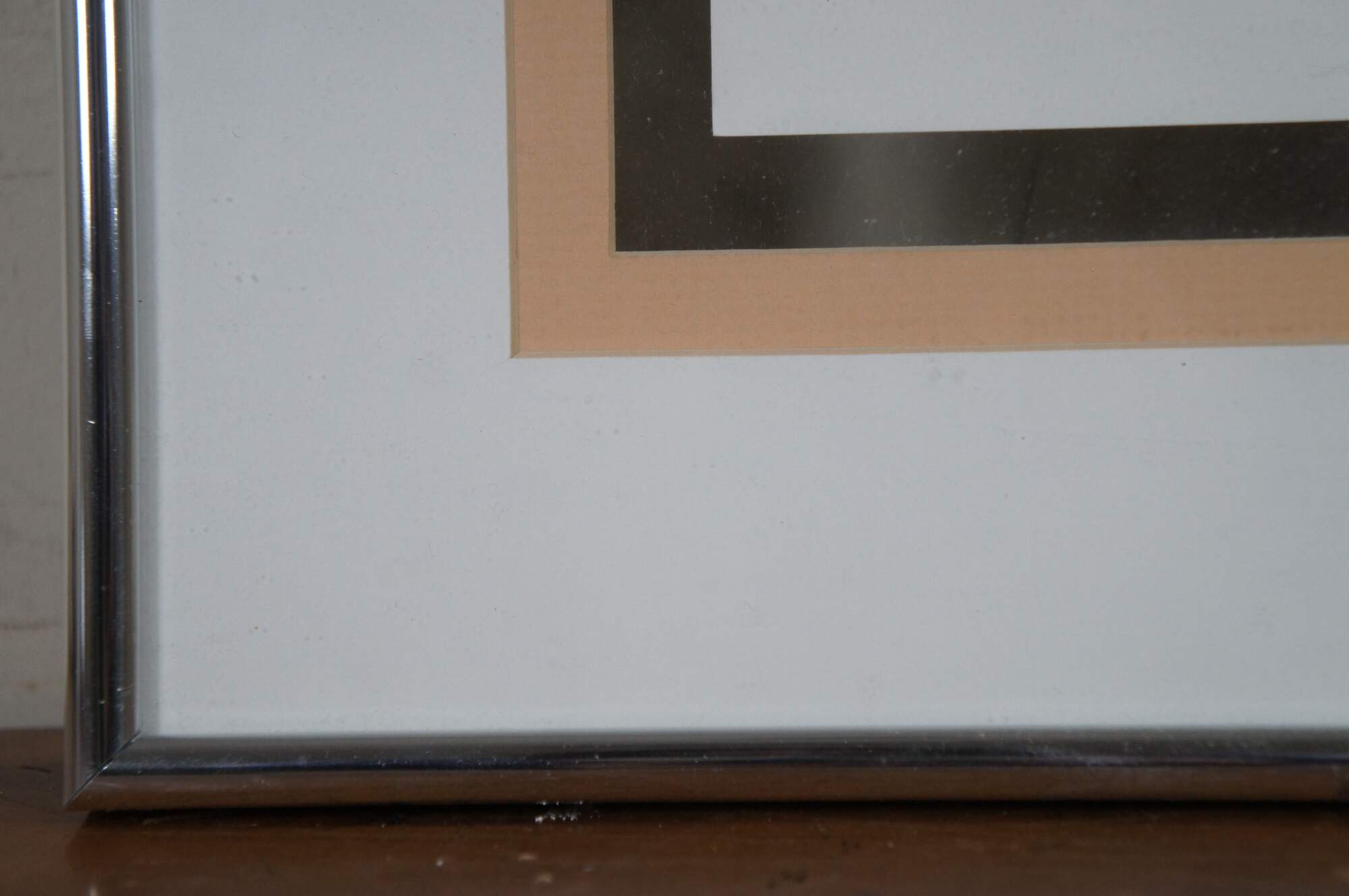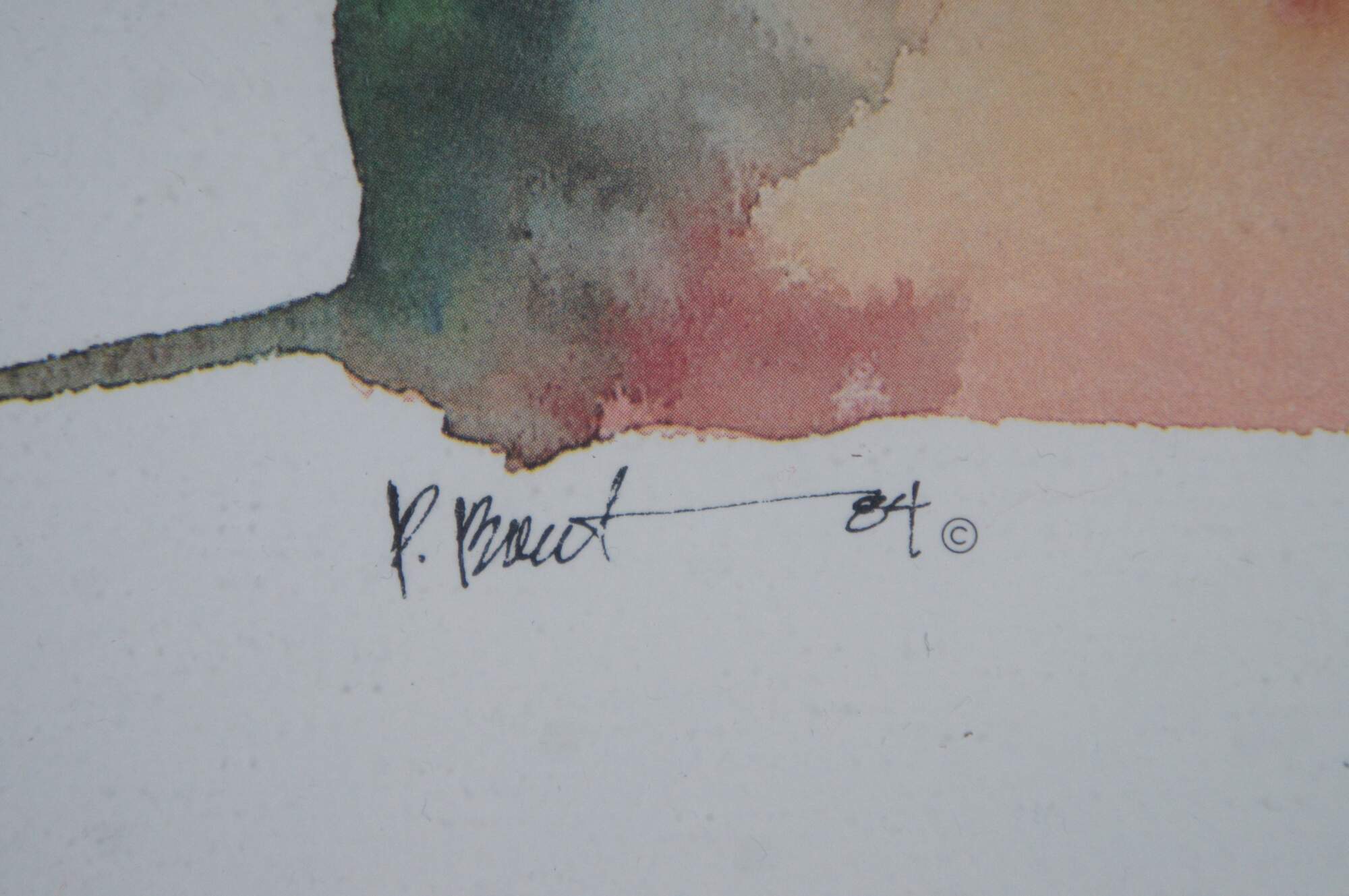 Vintage circa 1980's Paul Brent lithograph print depicting a striped angel fish on a splash of green, pink and orange. Signed in plate. Silver tone metal floating frame; white and beige layered mat. Edward Art Products, Style 6975.