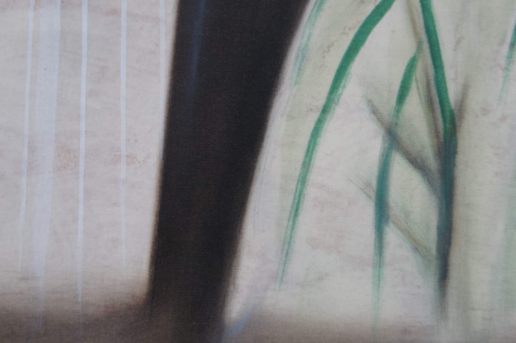 Late 19th to early 20th century pastel and watercolor portrait of a man and wife in Victorian era black suit jacket and green and white striped dress with an ottoman background. Identified by previous owner as Sam & Nancy Jourson, parents of Mrs Willie Moody, grandparents of Chalus Green. Foliate carved brown painted wood frame.