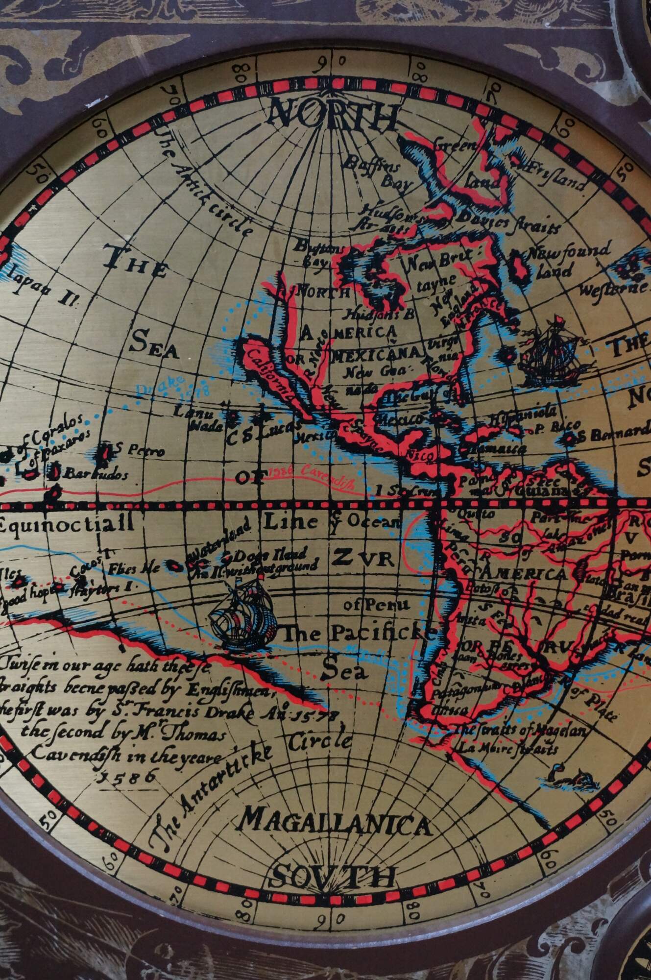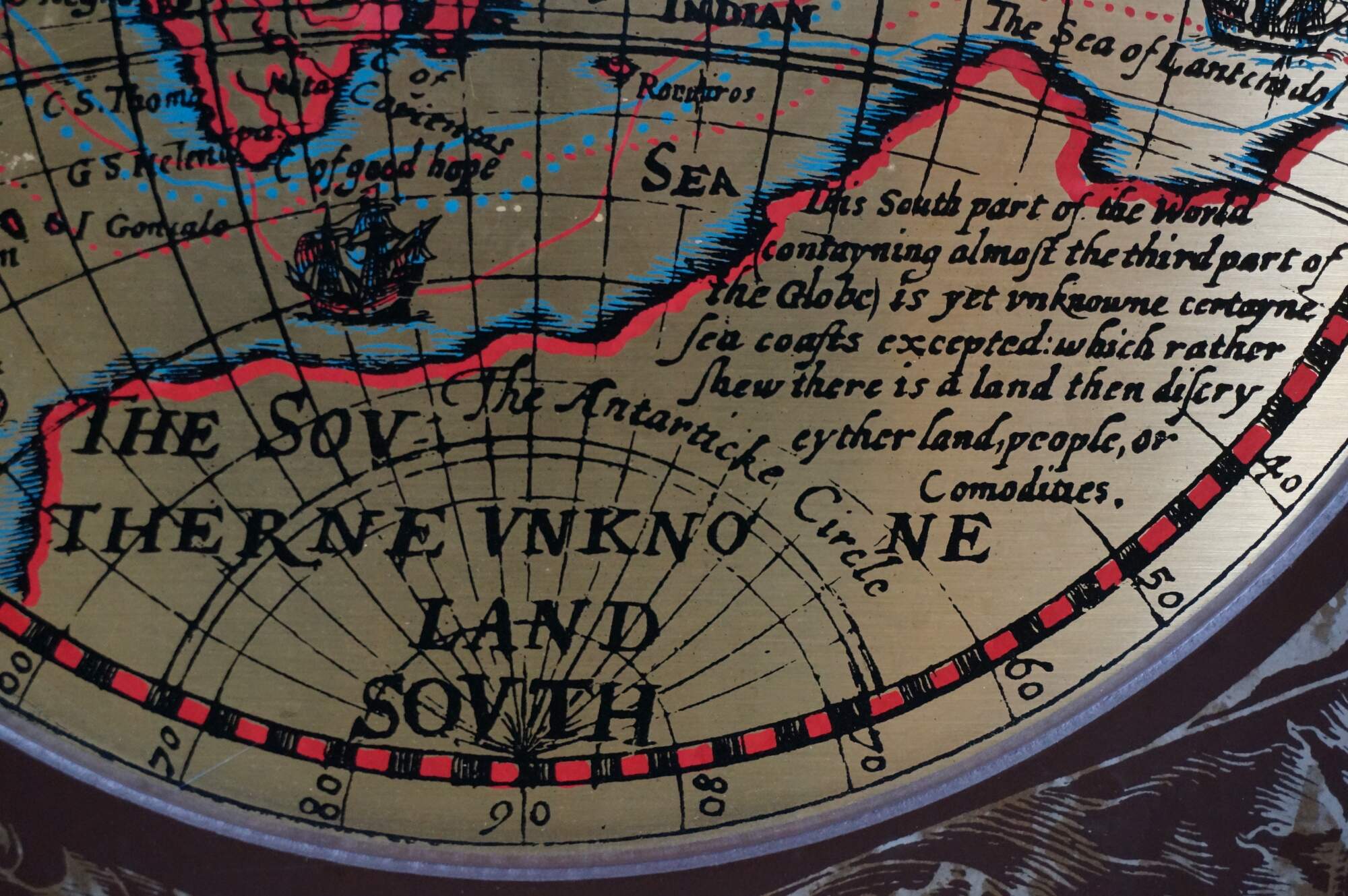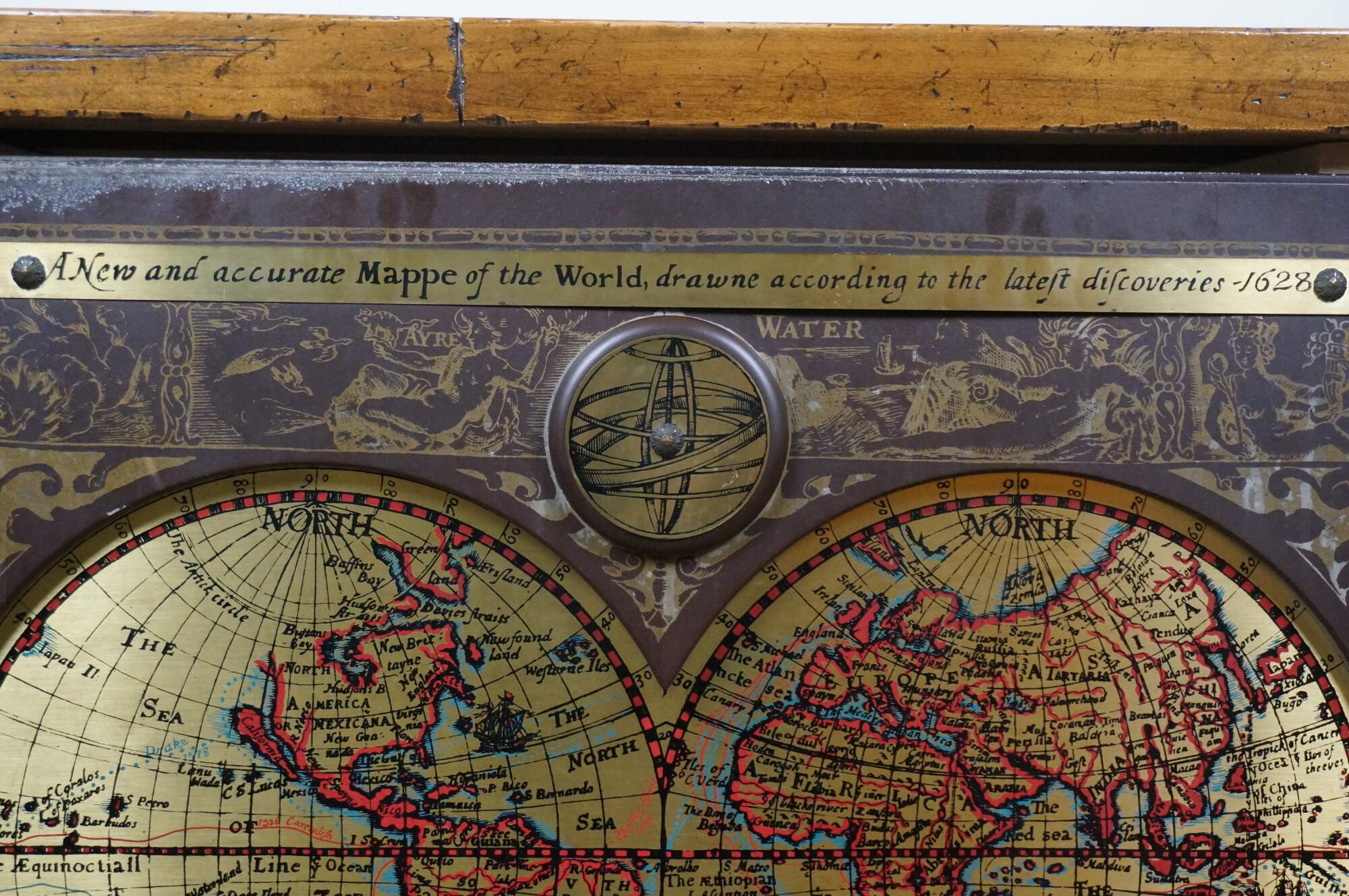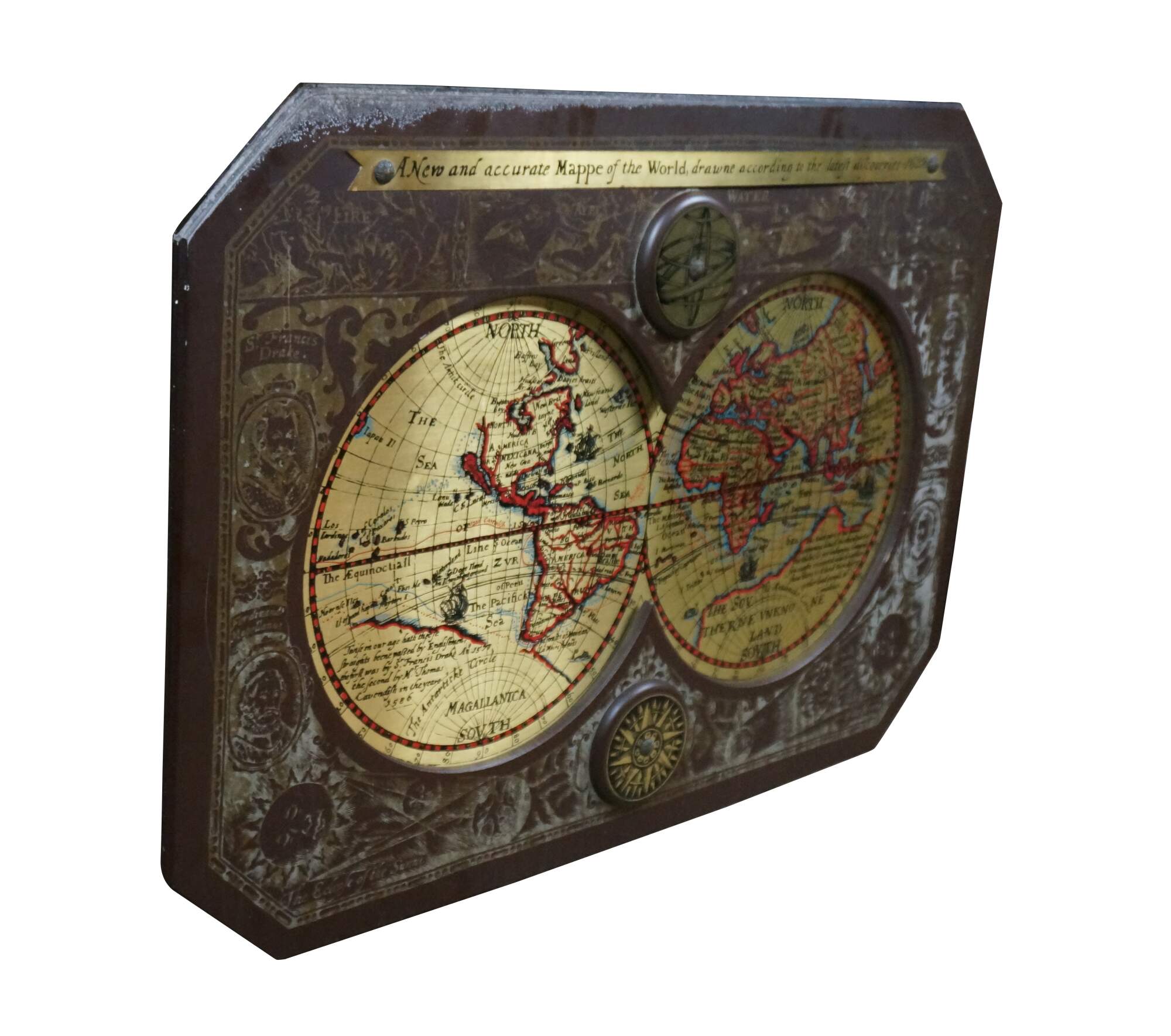 Vintage 1964 wood and brass wall hanging produced by Masketeers Inc depicting "A New and accurate Mappe of the world, drawne according to the latest discoveries - 1628." Features a wood frame with clipped corners, painted brown with gilt portraits of old english explorers and privateers among elemental and astrological accents, and a painted brass world map at the center. Two brass and iron rings on the back for wall hanging.