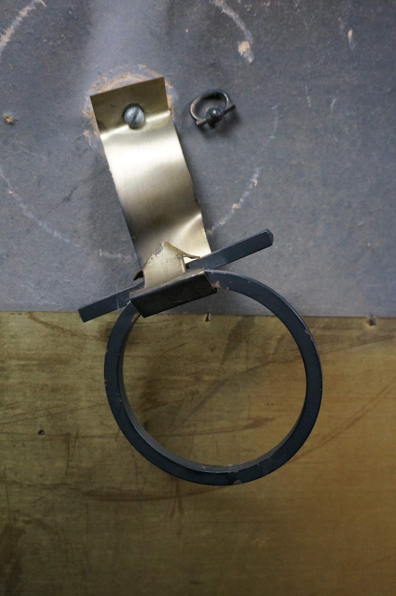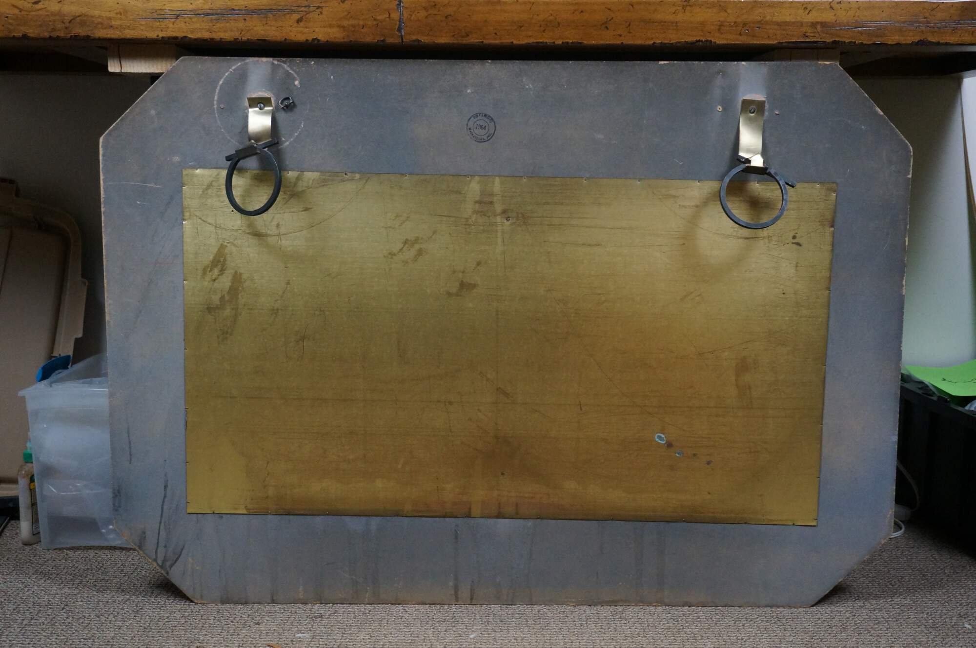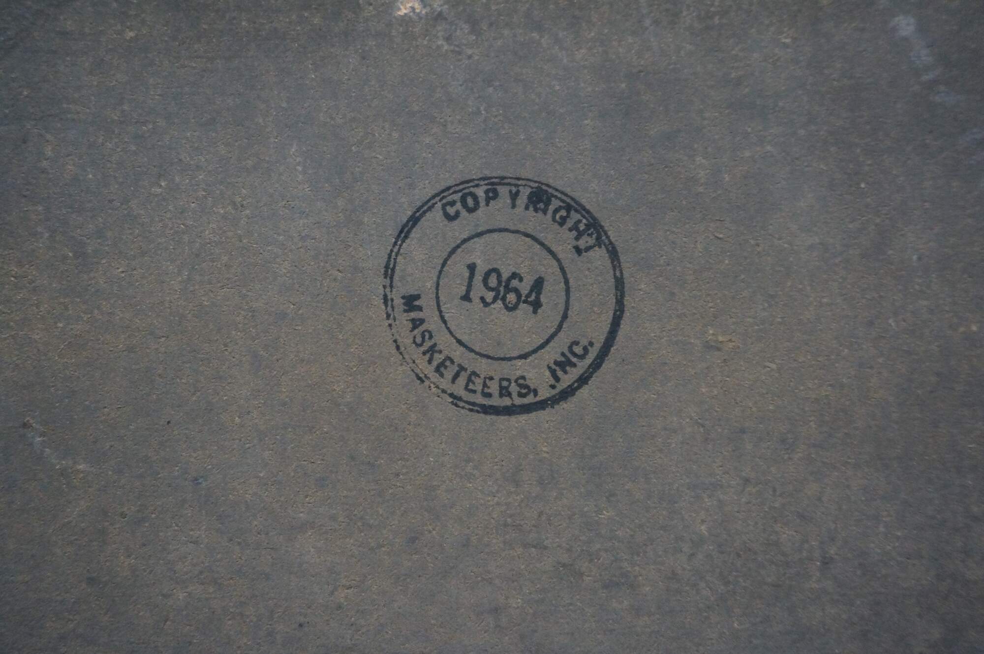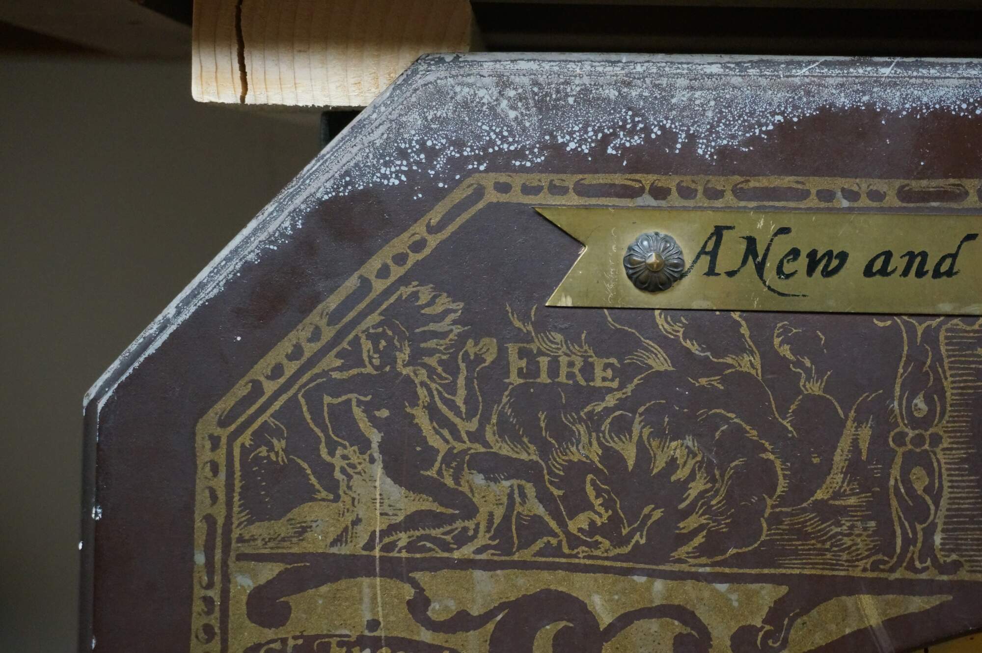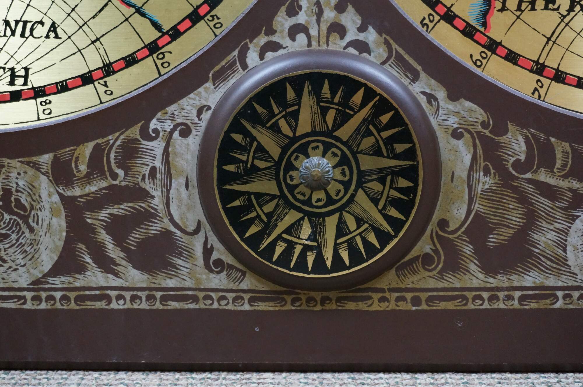 Vintage 1964 wood and brass wall hanging produced by Masketeers Inc depicting "A New and accurate Mappe of the world, drawne according to the latest discoveries - 1628." Features a wood frame with clipped corners, painted brown with gilt portraits of old english explorers and privateers among elemental and astrological accents, and a painted brass world map at the center. Two brass and iron rings on the back for wall hanging.