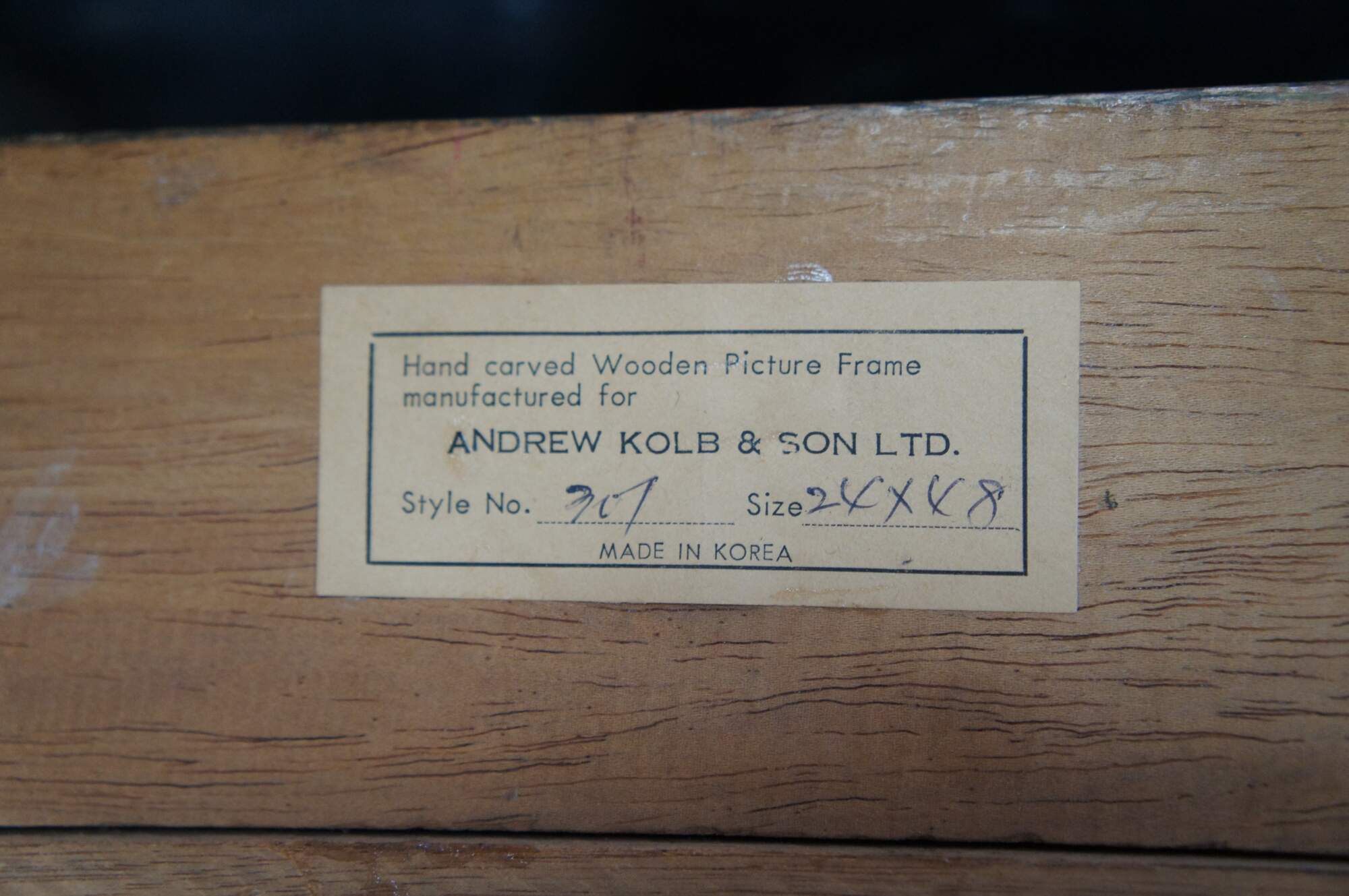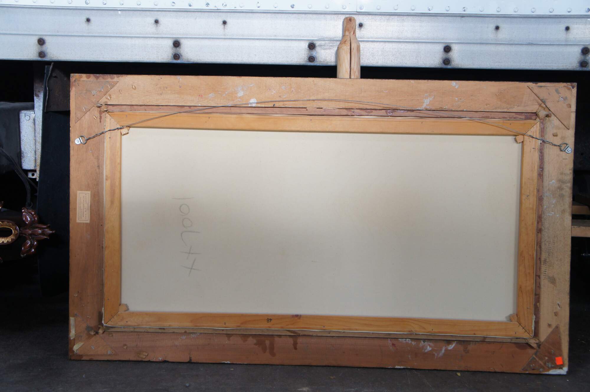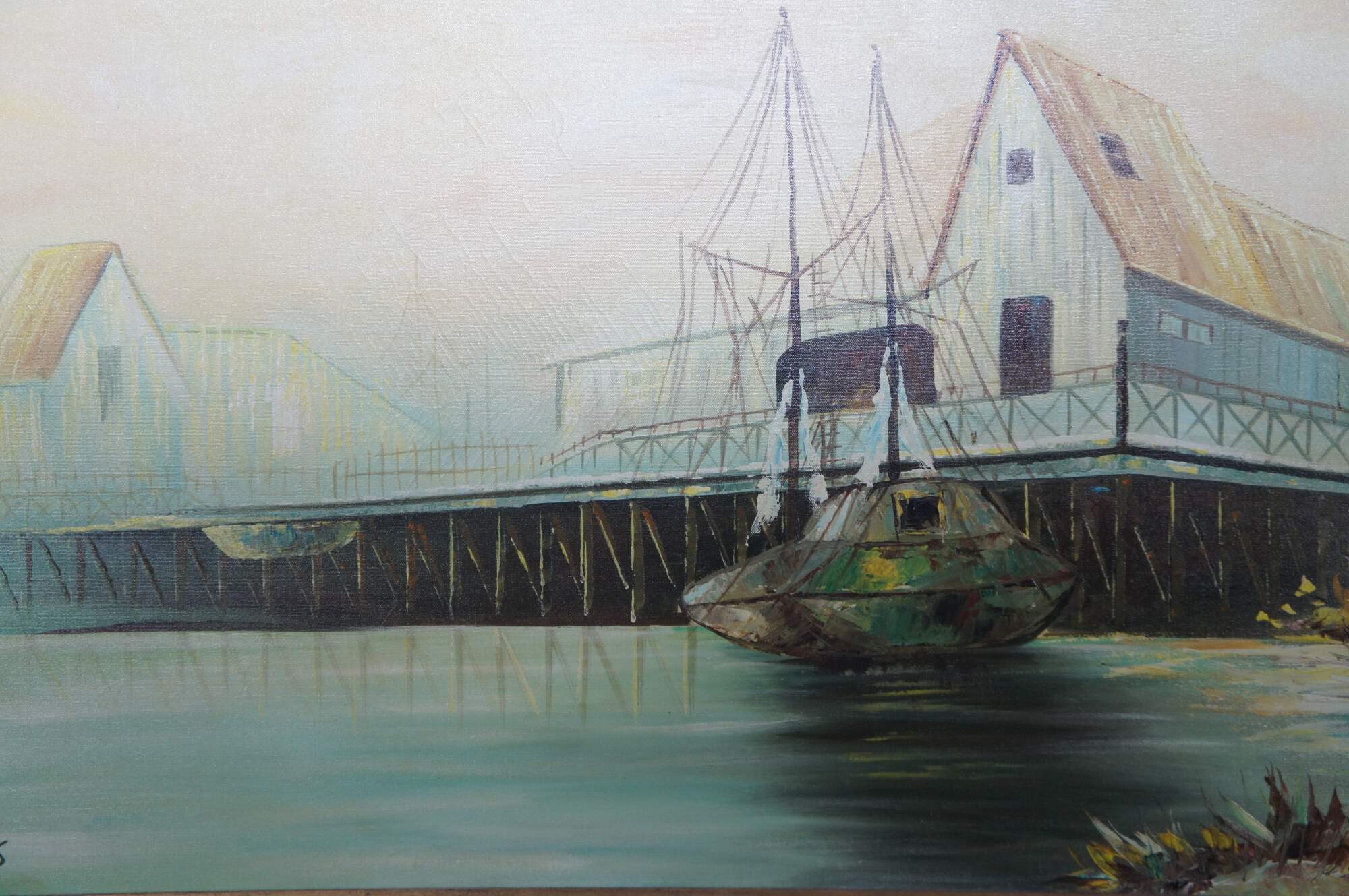 1970s oil painting on canvas, signed Stevens. Features a harbow dock view with buildings and a sailboat. Signed Stevens on the lower left. The painting is framed in wood by Andrew Kolb & Son Ltd.