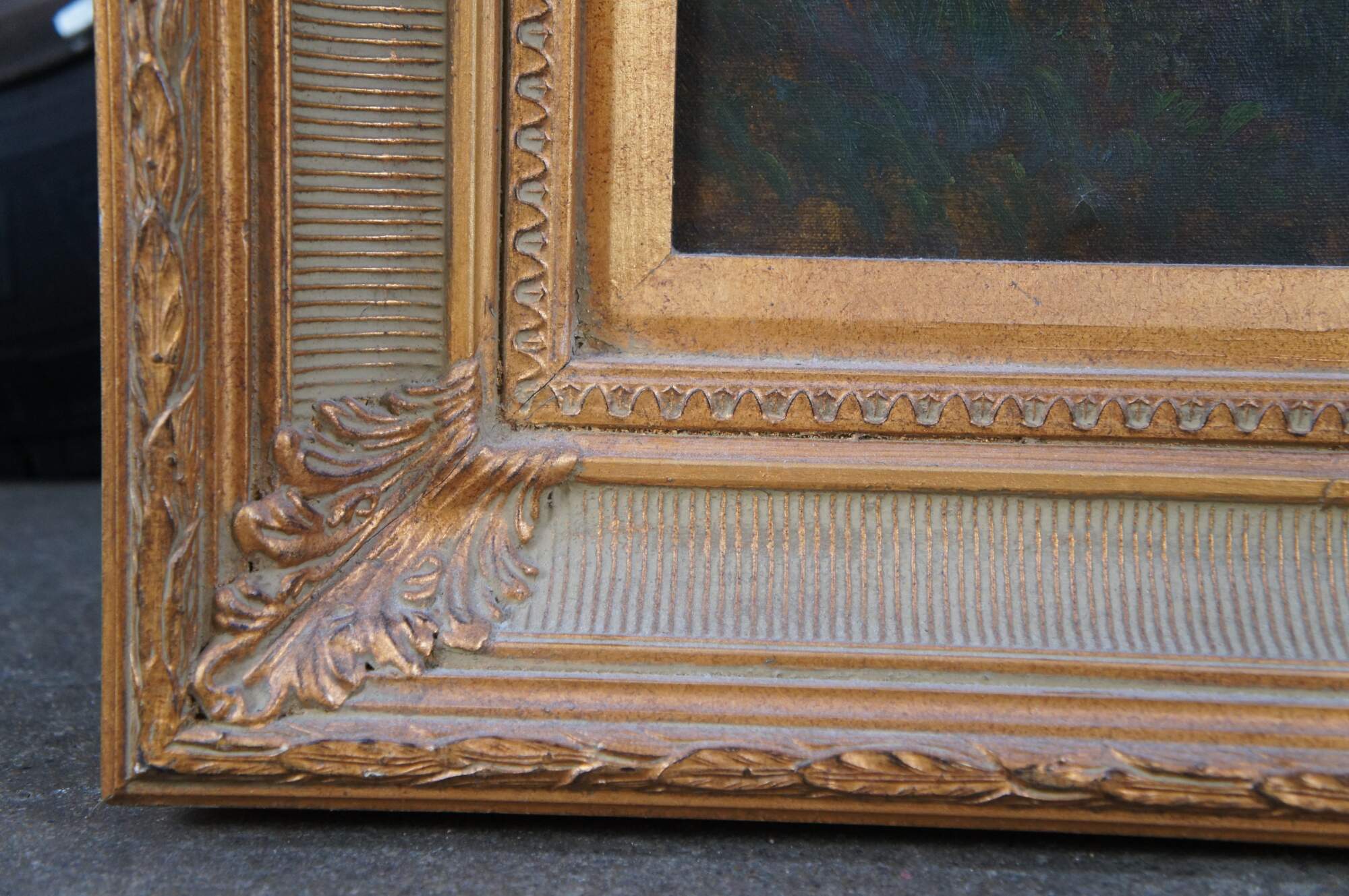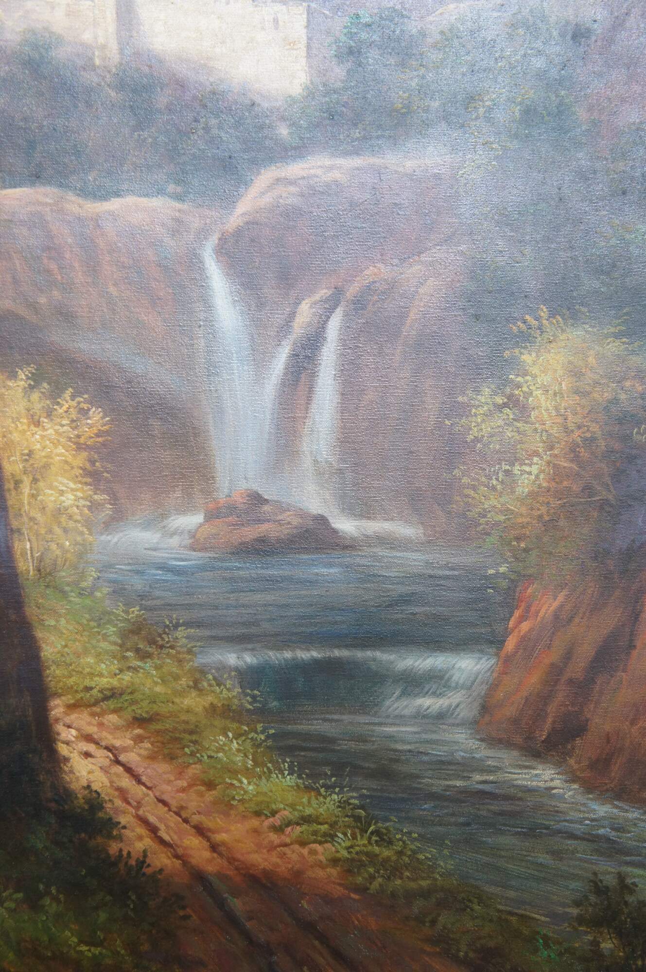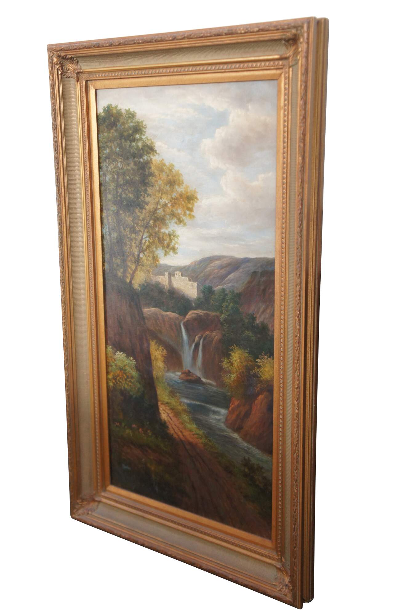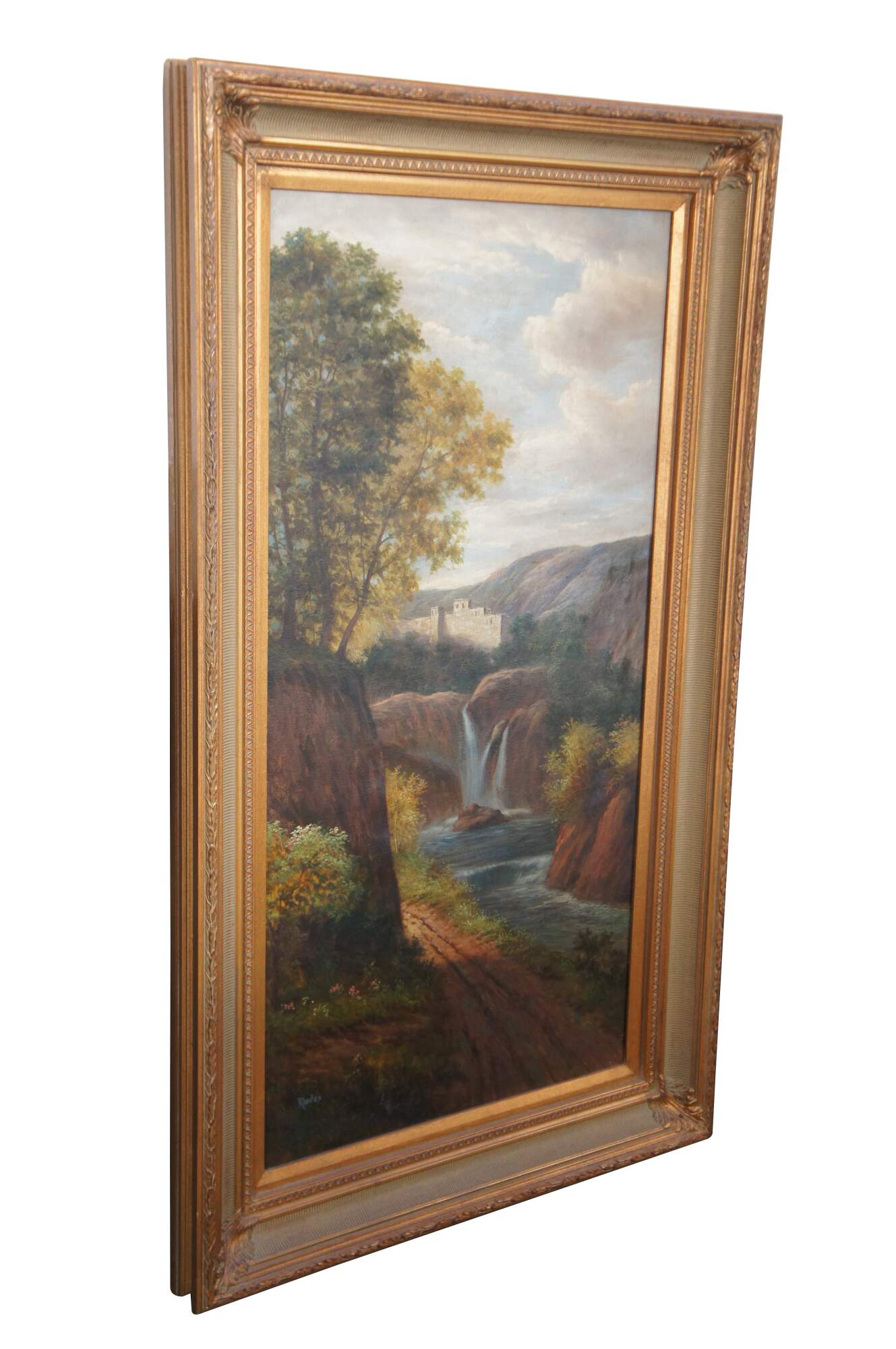 A beautiful vintage european landscape oil painting, circa 1970s. Features a castle perched on the hillside with a waterfall below. A trail to the castle can be seen towards the left with tire tracks leading up to it. The painting is framed in wood with a gold finish. Signed rhodes lower left.