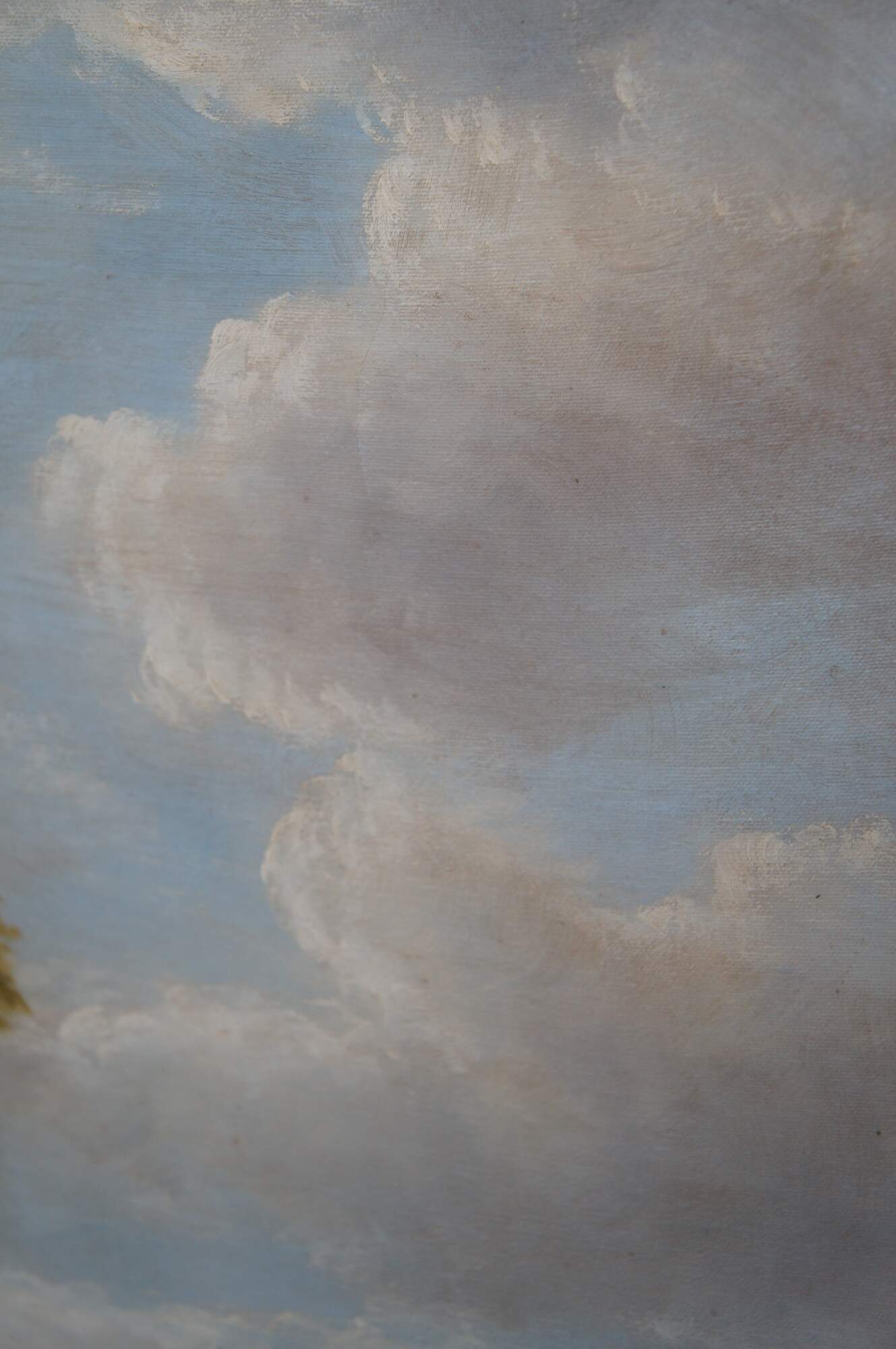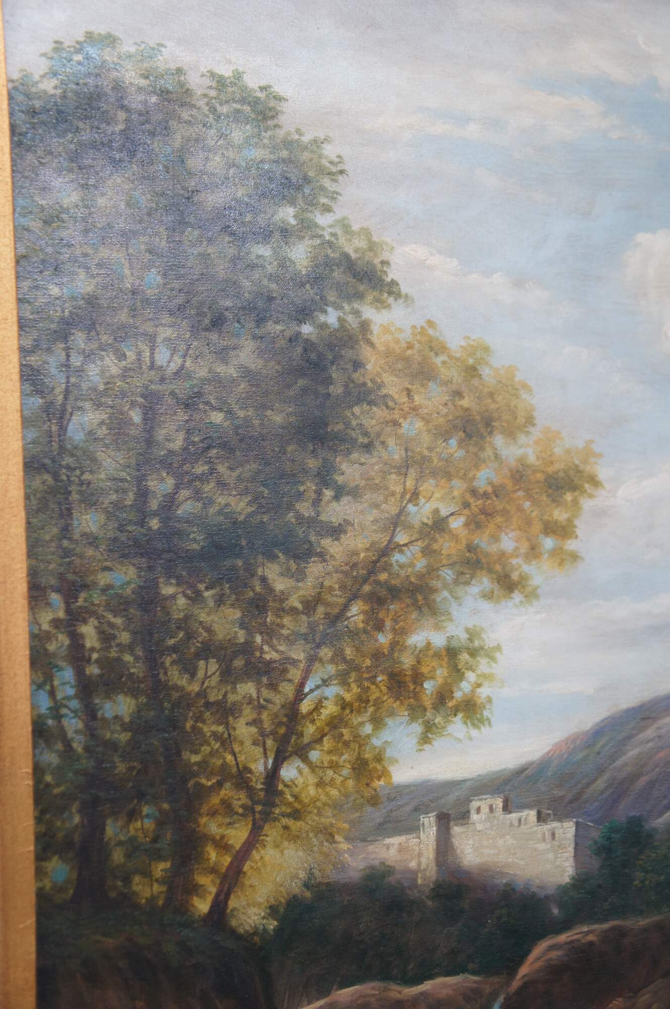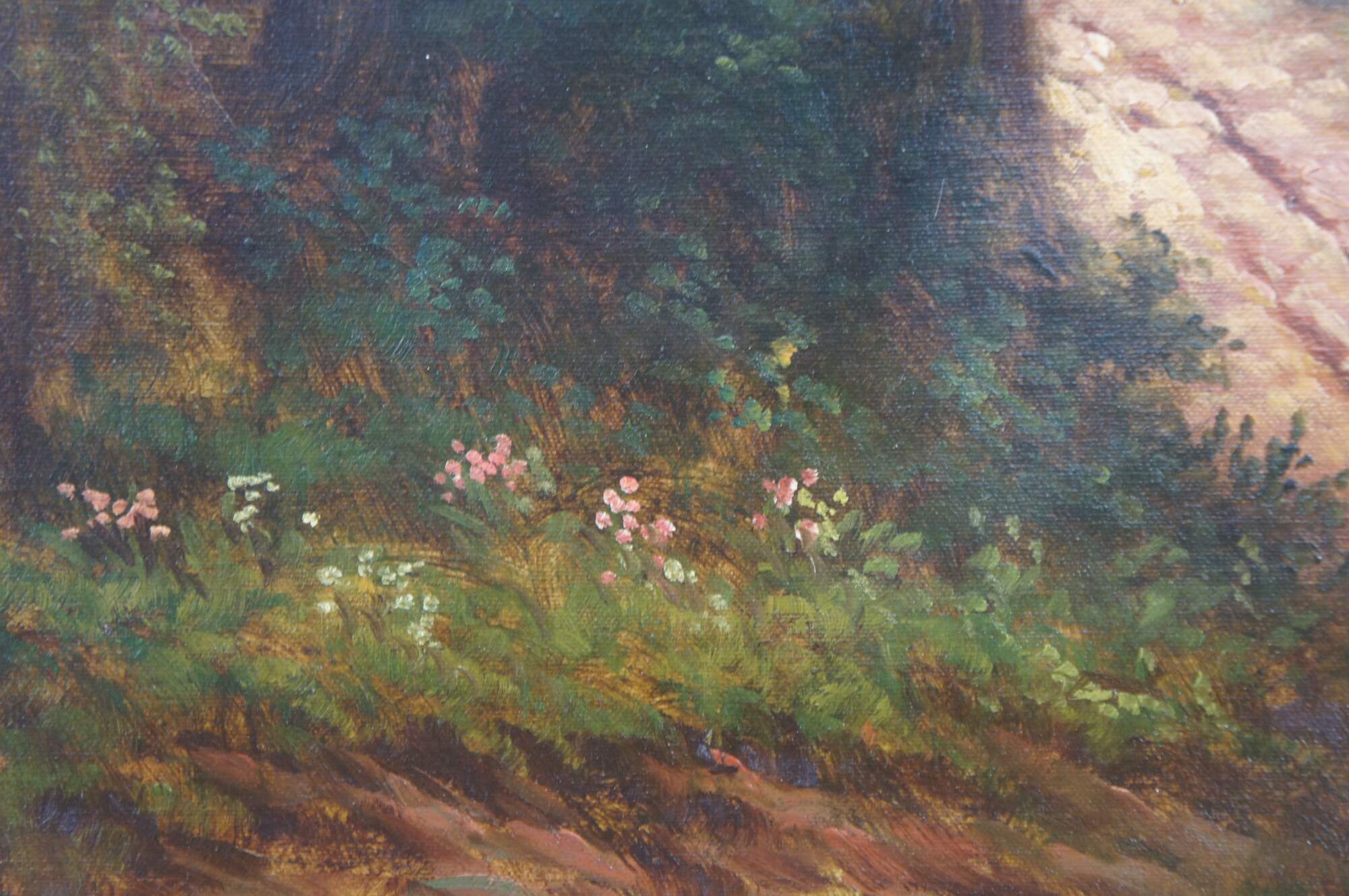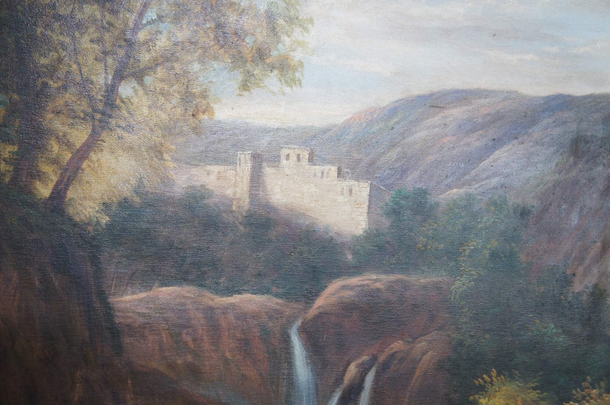 A beautiful vintage european landscape oil painting, circa 1970s. Features a castle perched on the hillside with a waterfall below. A trail to the castle can be seen towards the left with tire tracks leading up to it. The painting is framed in wood with a gold finish. Signed rhodes lower left.