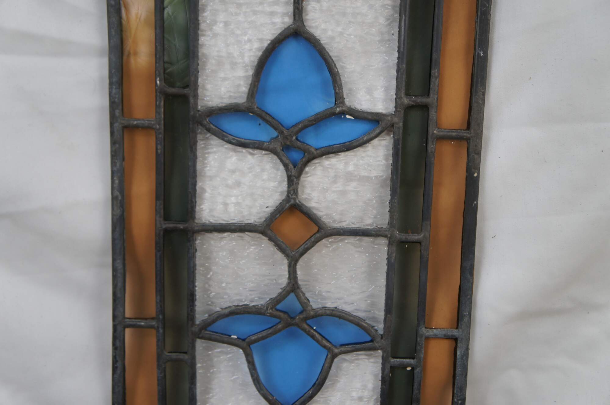 Antique reclaimed leaded stained glass window panel. Features a diamond at the center offset by two blue roses. The window is framed with an amber border outside of a green tinted border.