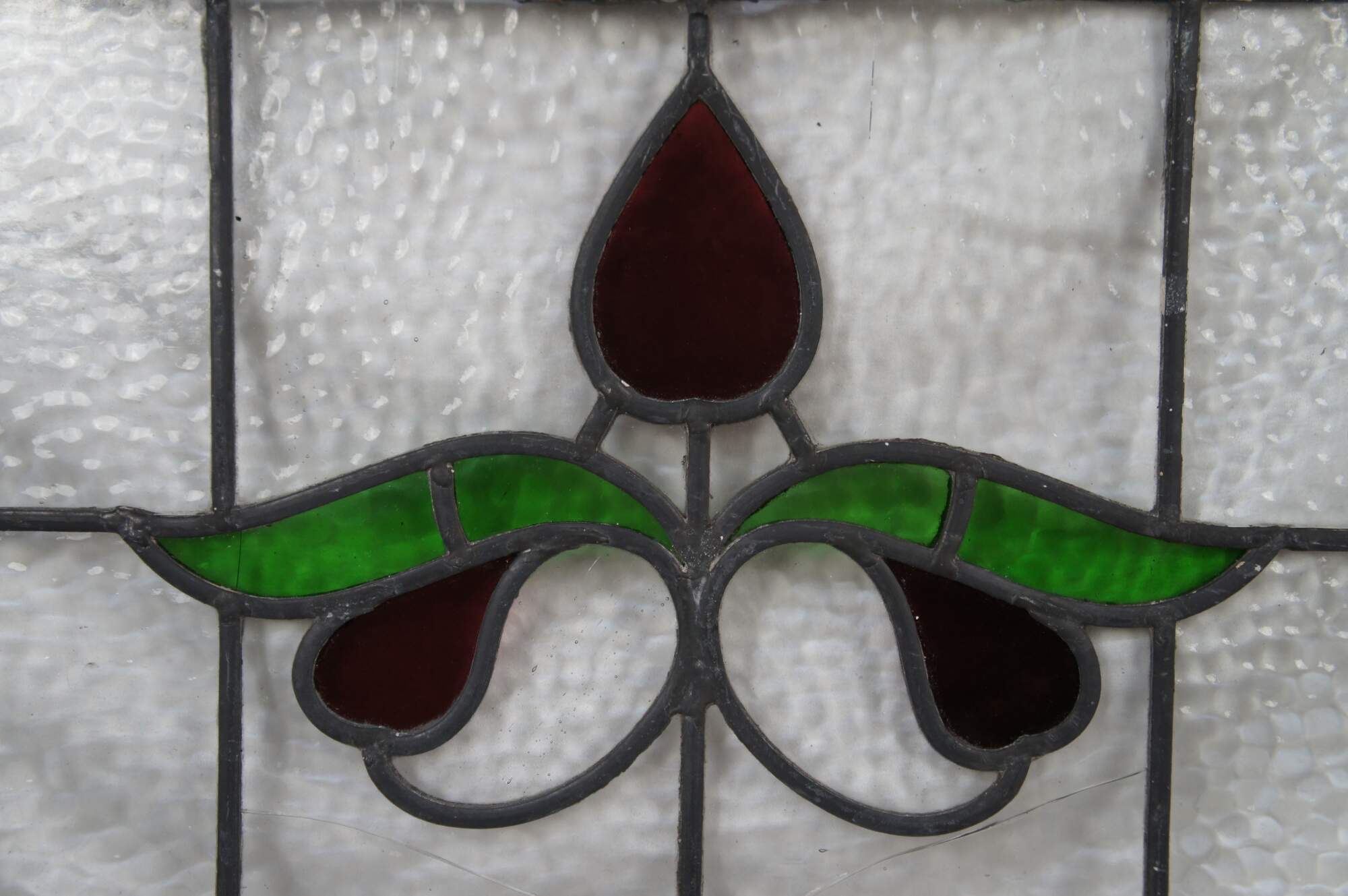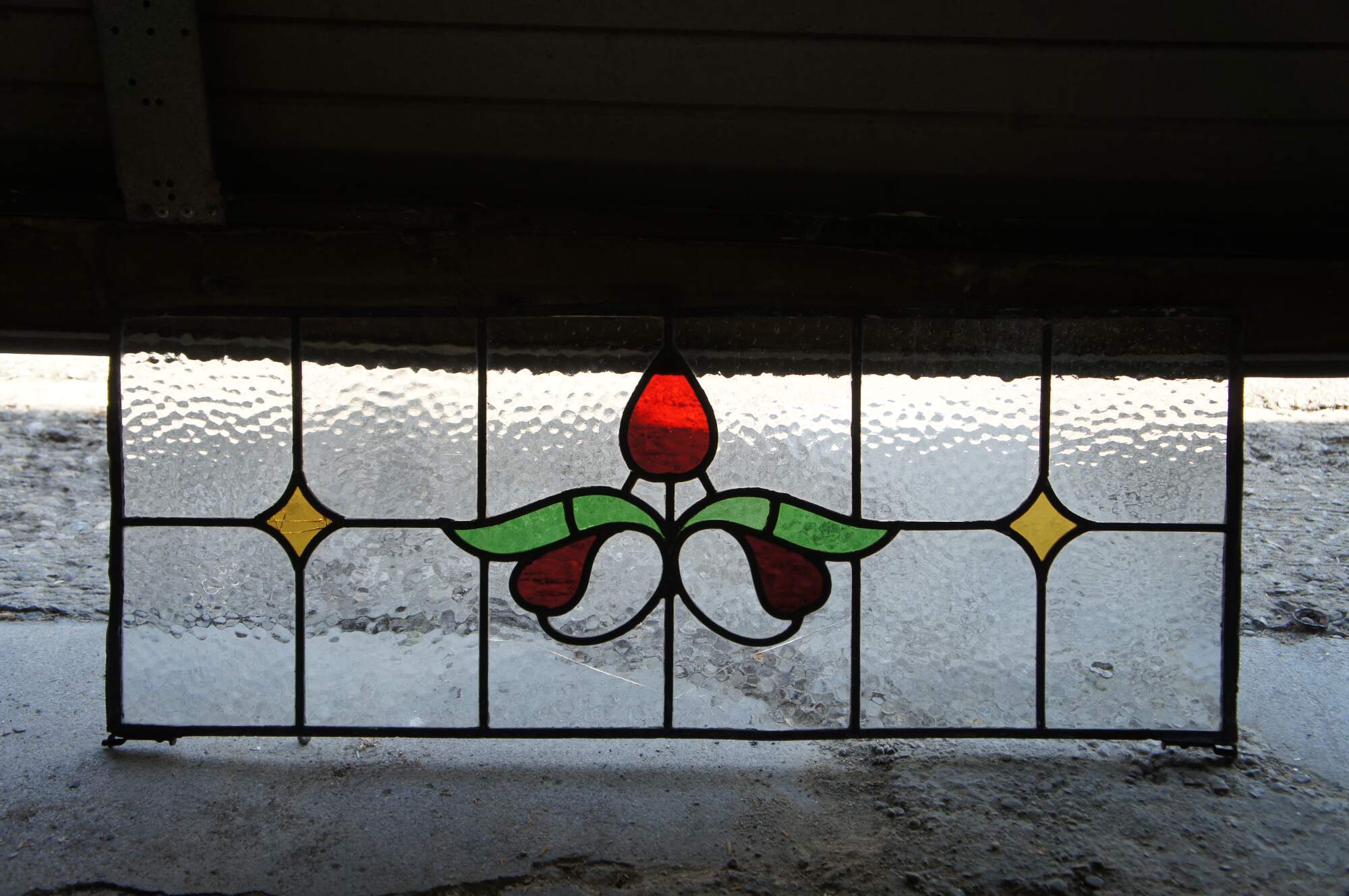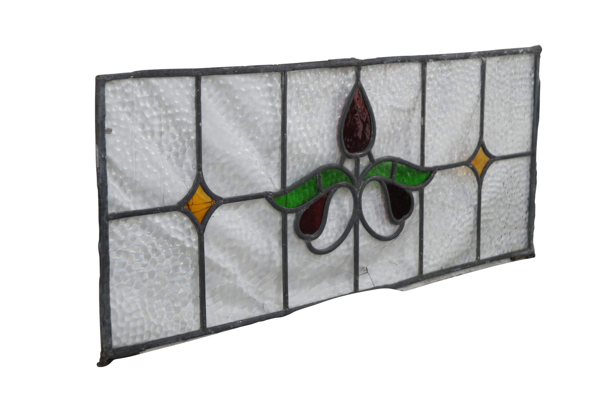 Beautiful antique leaded stained glass Art Nouveau transom window. Features a floral design at the center in a ruby tone with green leaves flanked by amber colored diamonds and a pebbled glass foreground. Perfect for use over a doorway.