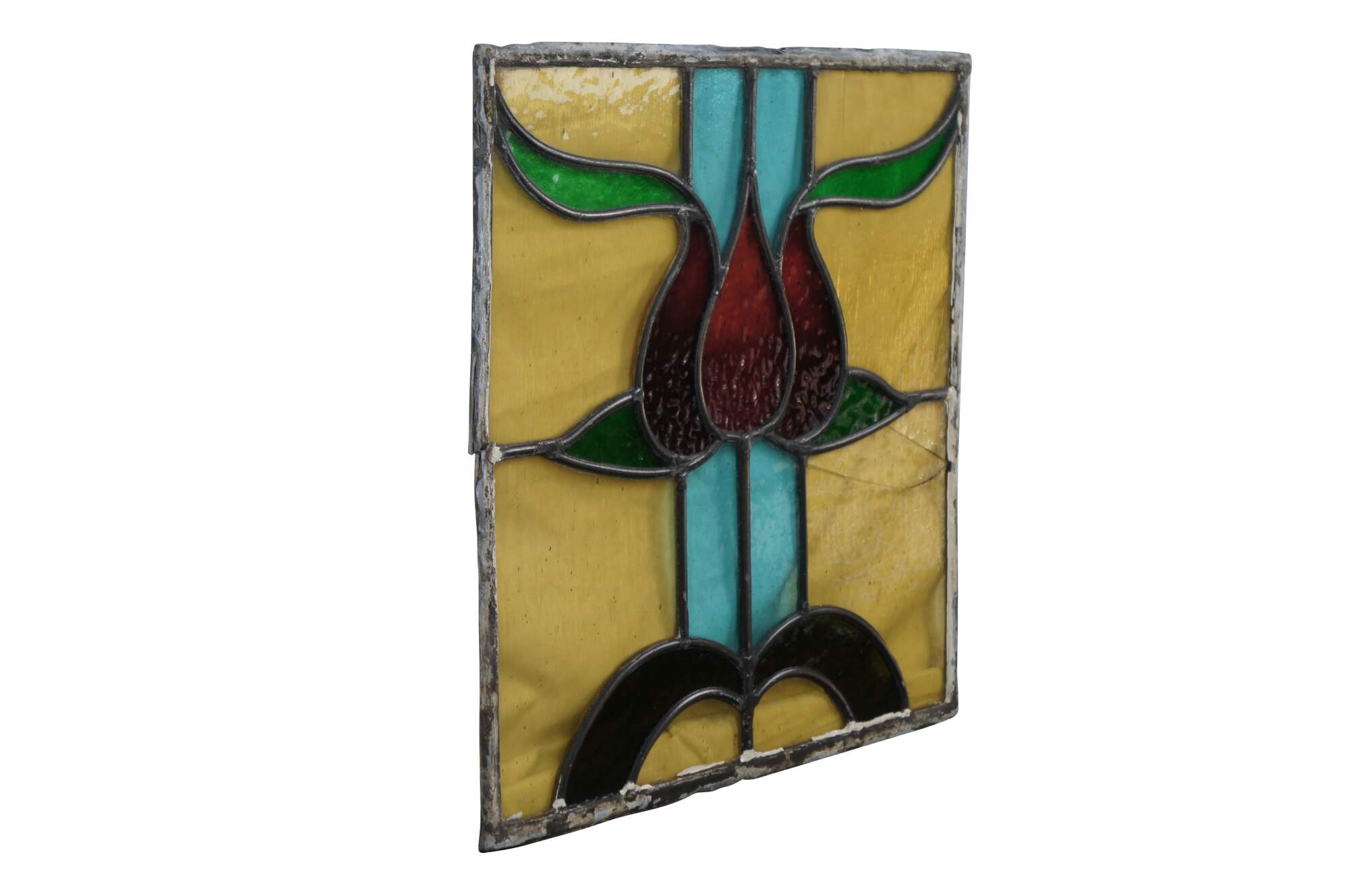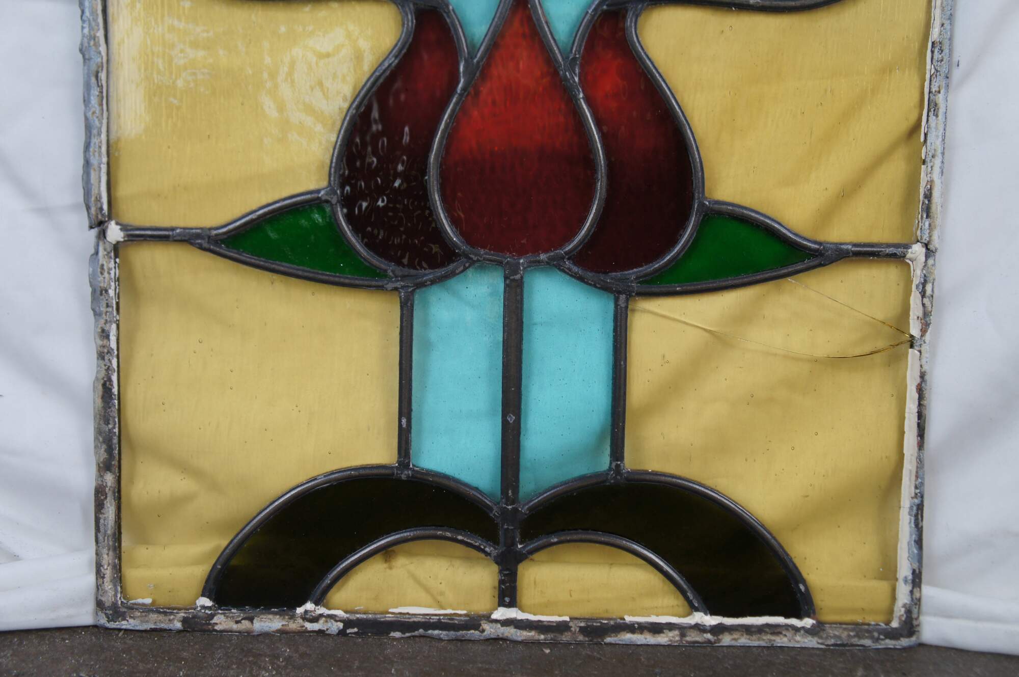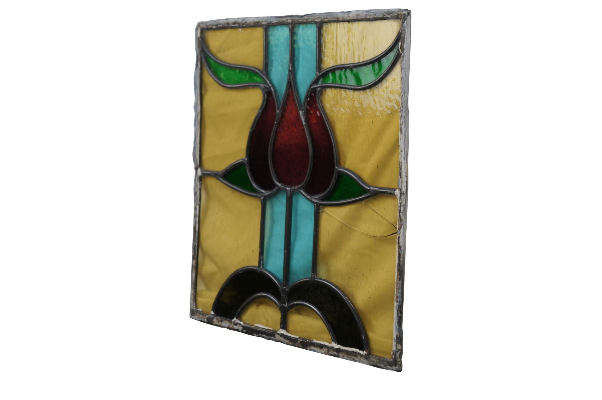 An antique stained glass window panel featuring a triple rose flanked by leaves over a background of blue and yellow / gold