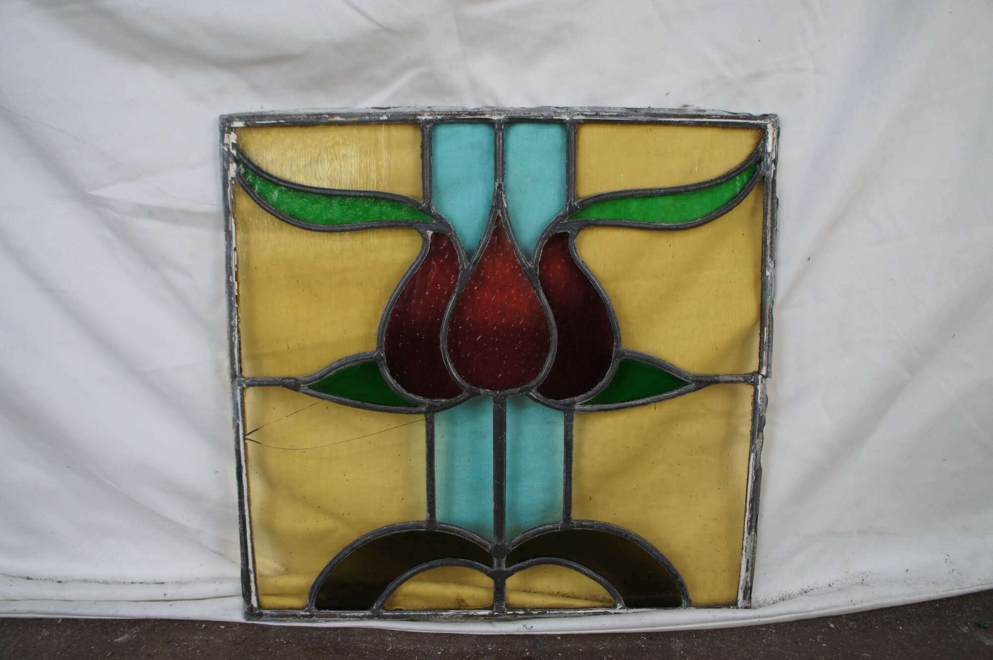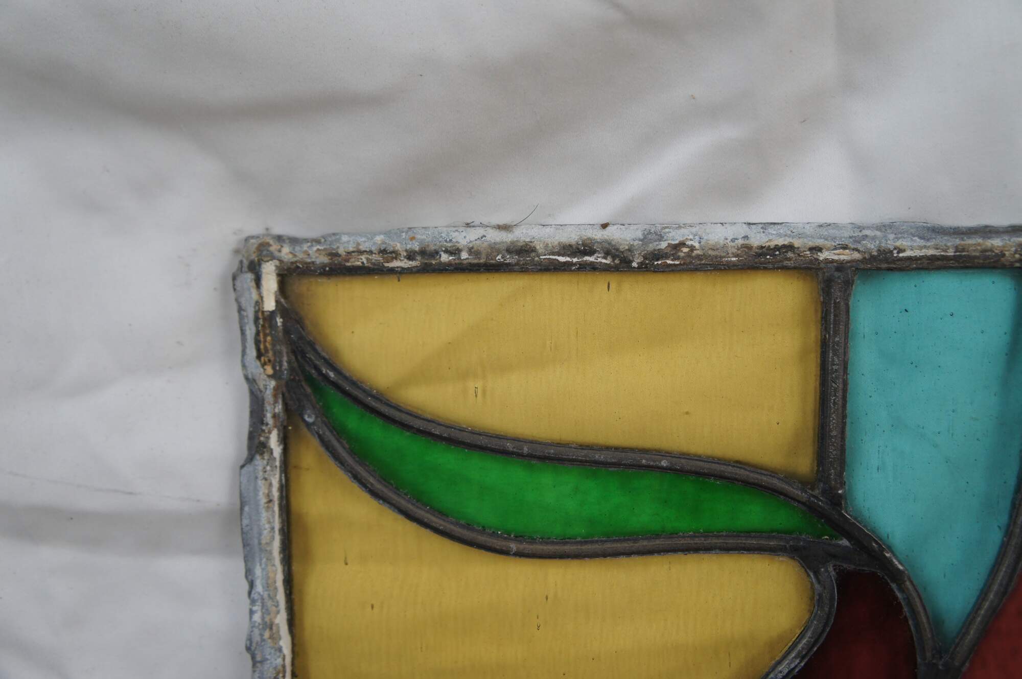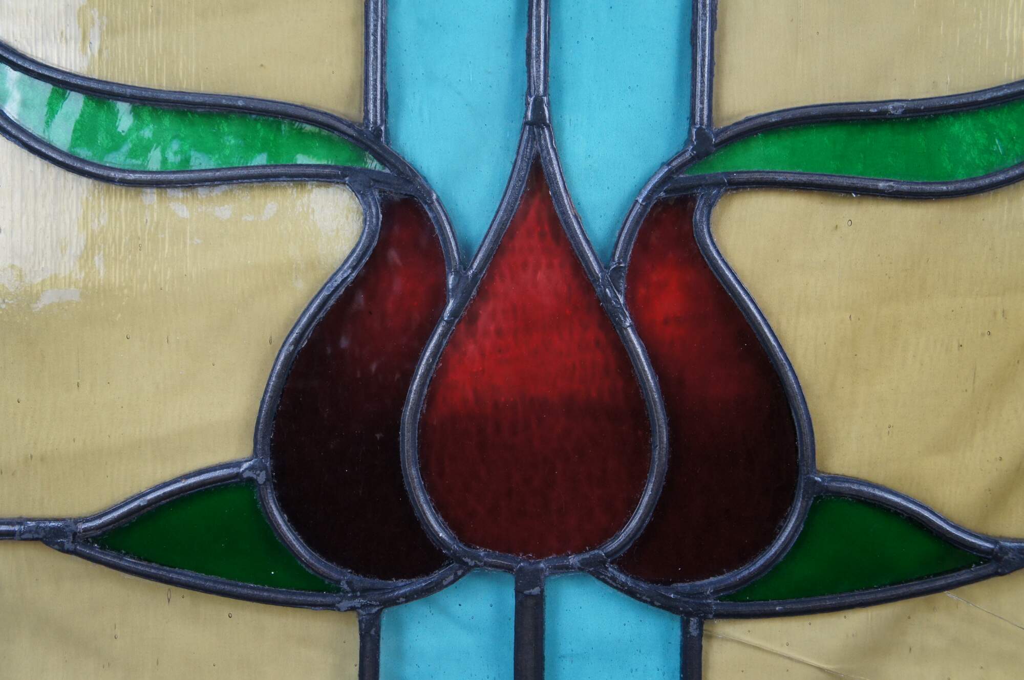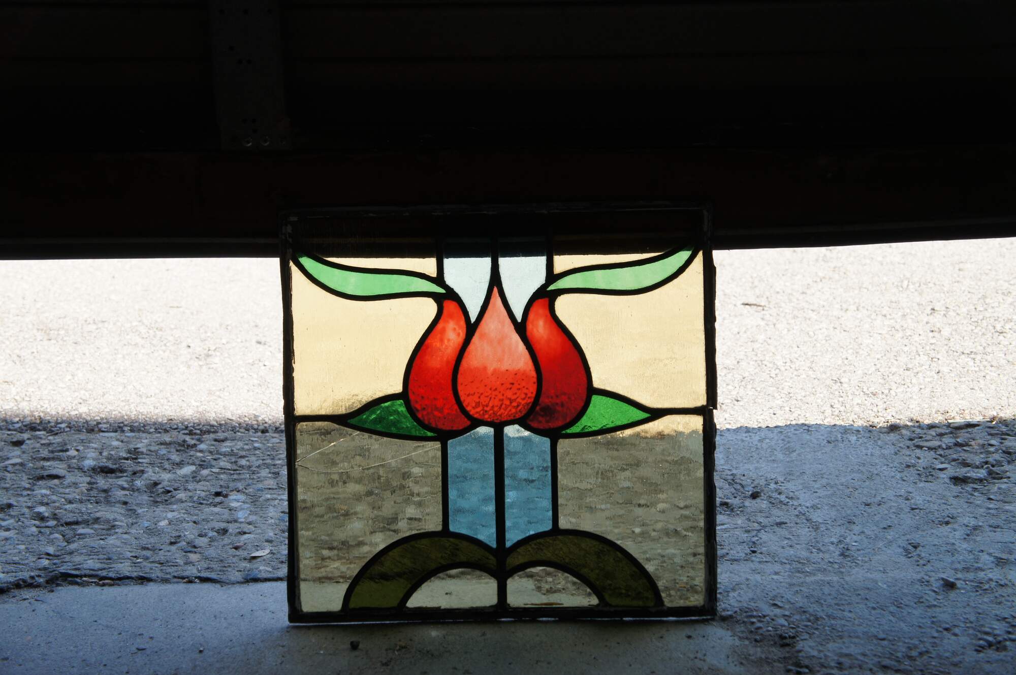An antique stained glass window panel featuring a triple rose flanked by leaves over a background of blue and yellow / gold