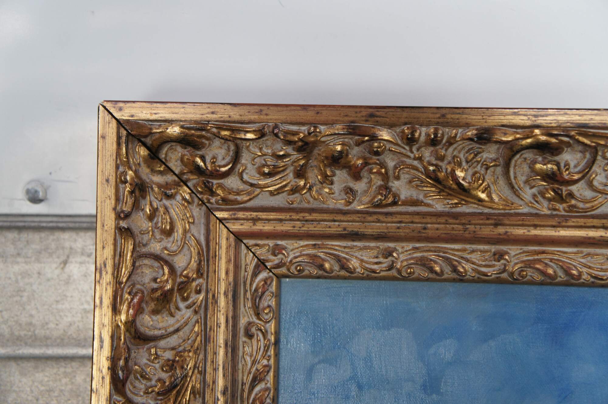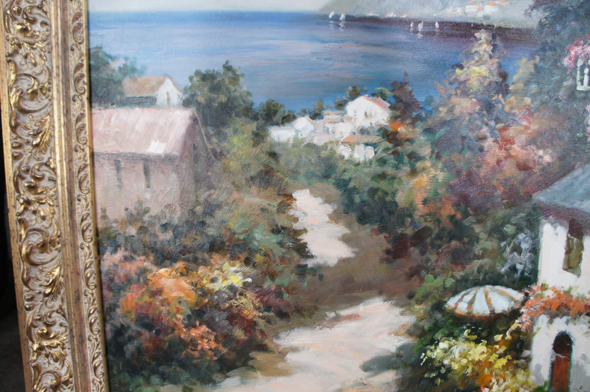 A large impressionist seascape or harbor view in Tuscany. Signed Shirley, cira late 20th century. The oil painting is on canvas and features a view down the hillside on a crisp afternoon with floral sprays amidst houses with a view towards the water. The painting is framed in with with gold finish and foliate relief.