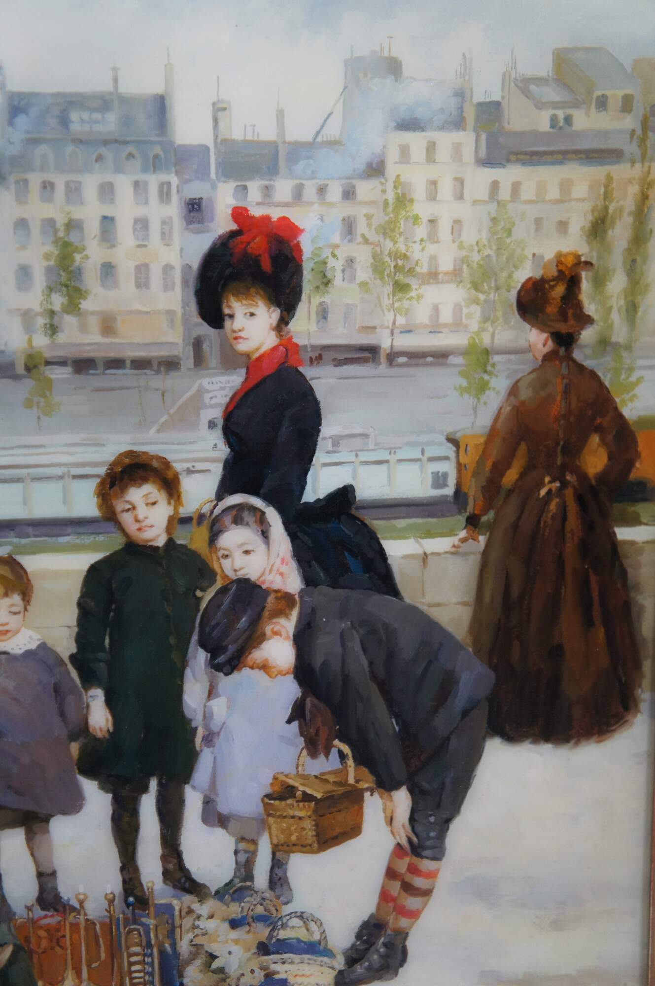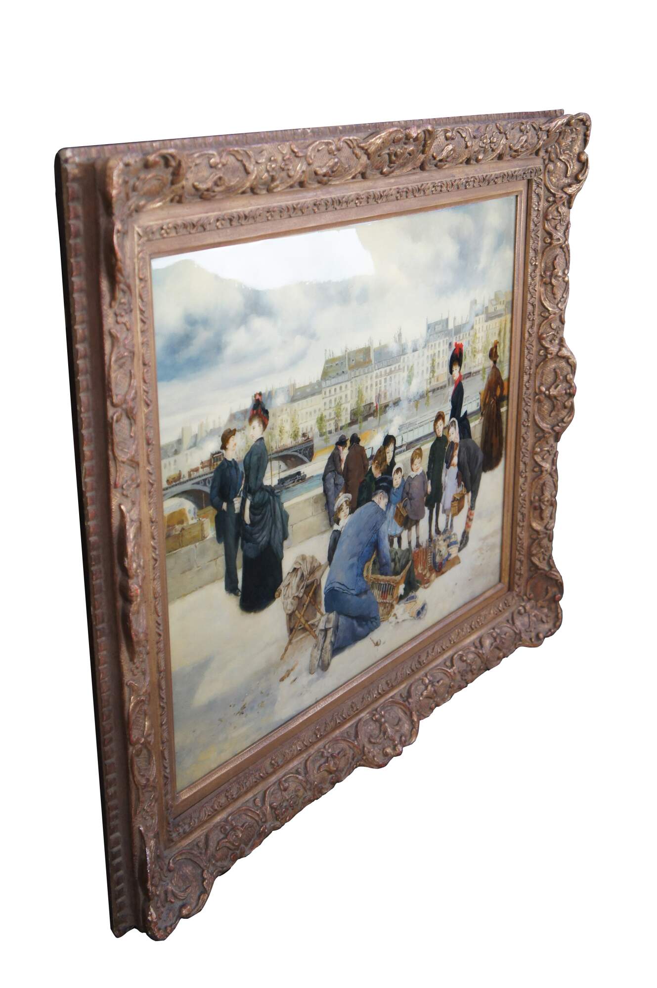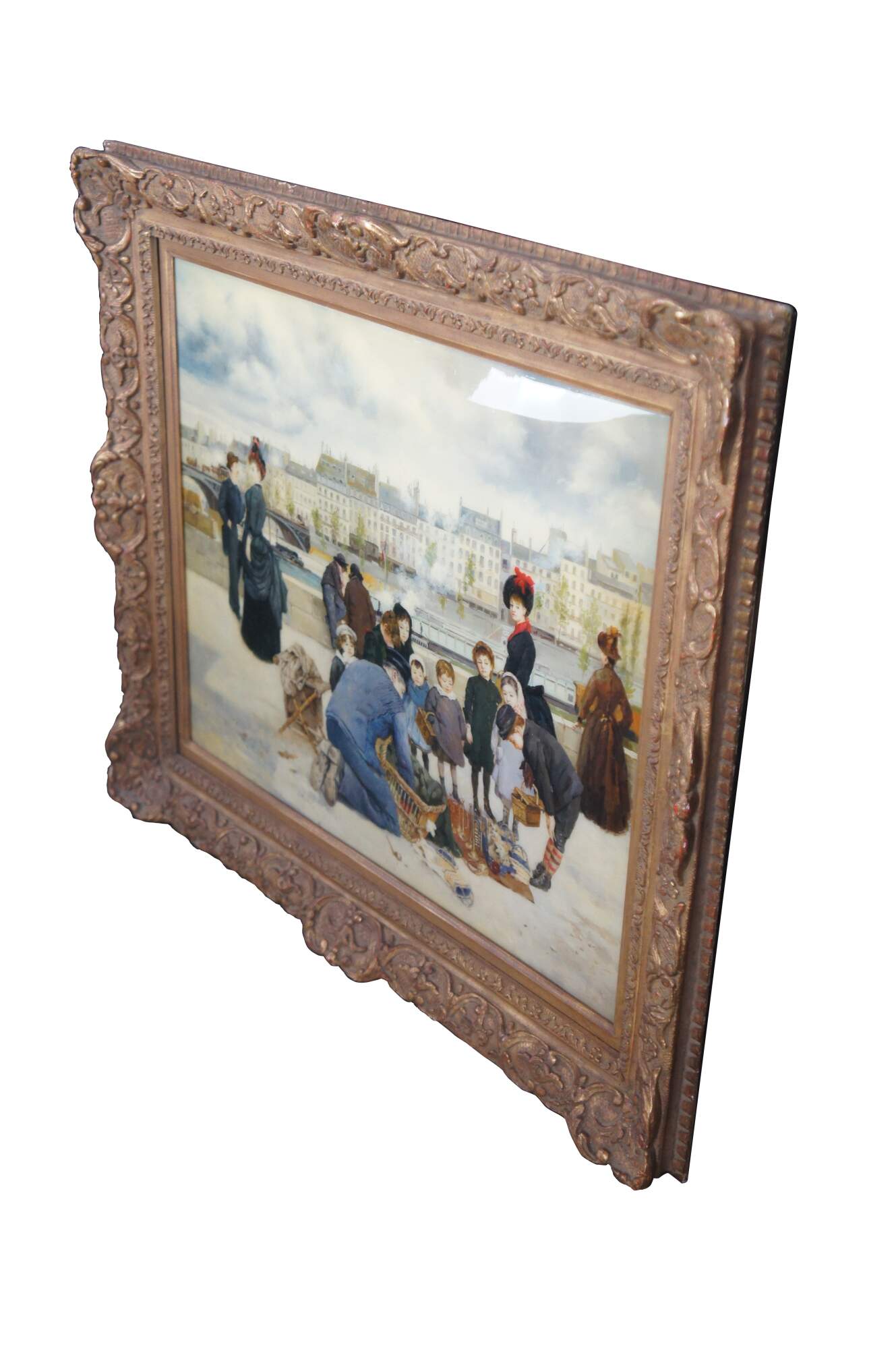 Children with a toy seller on the Quai du Louvre, after Jean Béraud. Oil painting sealed with resin giving a high gloss finish. This beautiful painting after Jean Beraud showcases the hustle and bustle of the famous thoroughfare (Quai du Louvre) with a neat mix of interesting figures amongst the unique architectural backdrop across the river. Circa last quarter 20th century. Framed in Baroque manner