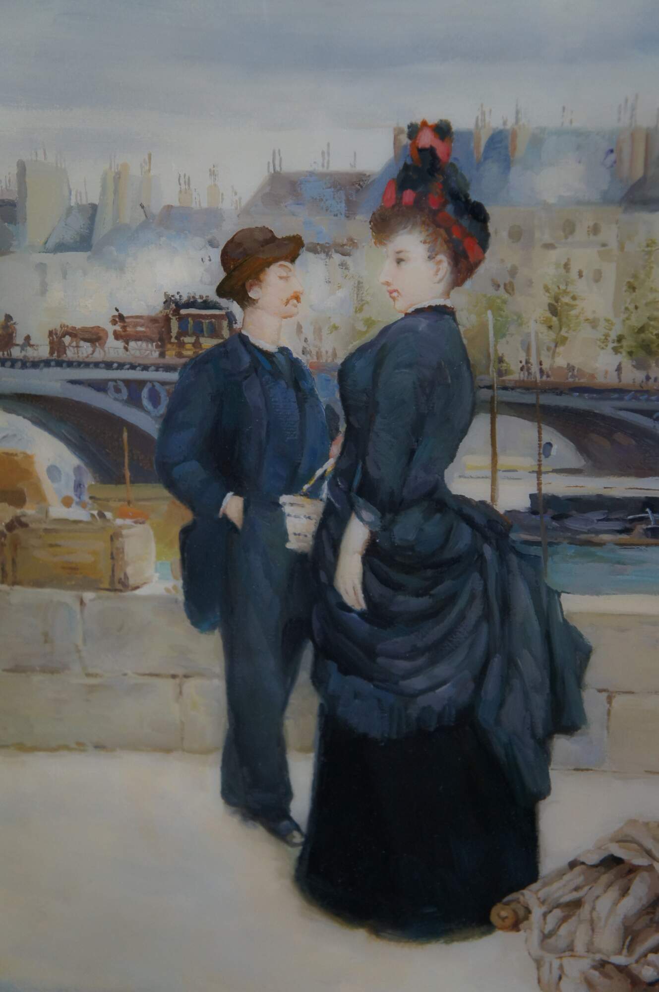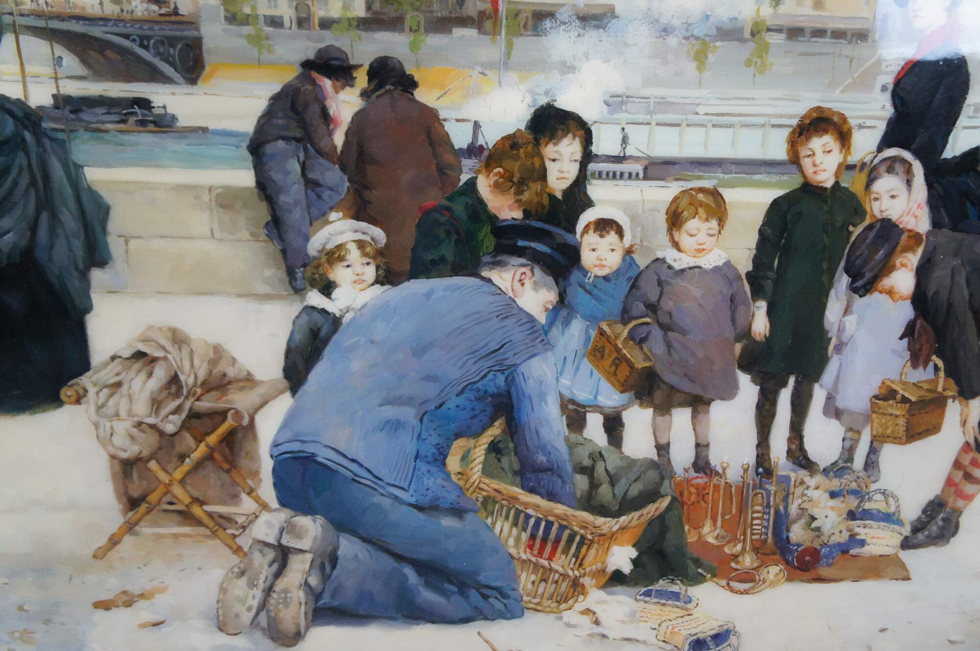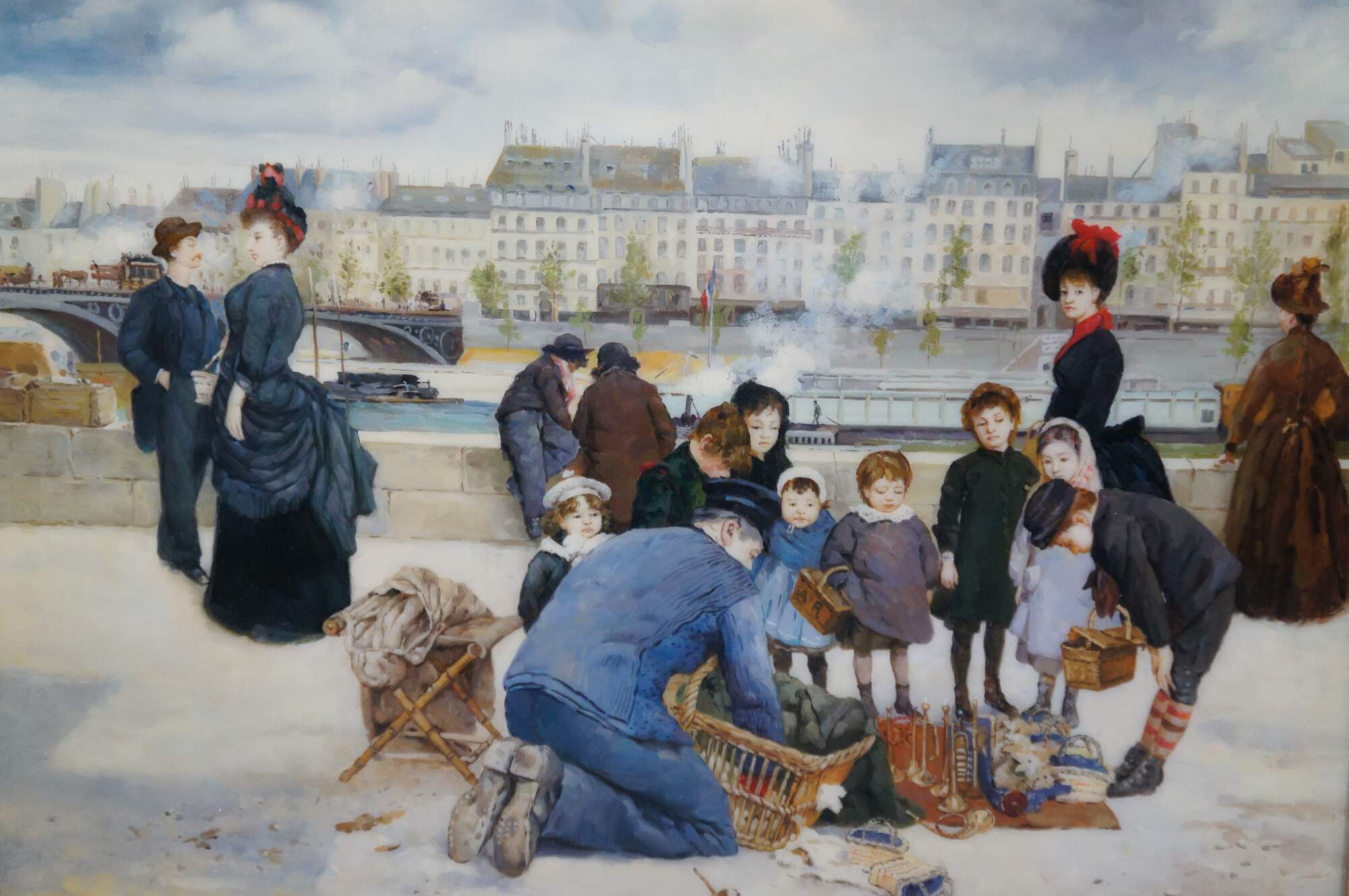 Children with a toy seller on the Quai du Louvre, after Jean Béraud. Oil painting sealed with resin giving a high gloss finish. This beautiful painting after Jean Beraud showcases the hustle and bustle of the famous thoroughfare (Quai du Louvre) with a neat mix of interesting figures amongst the unique architectural backdrop across the river. Circa last quarter 20th century. Framed in Baroque manner