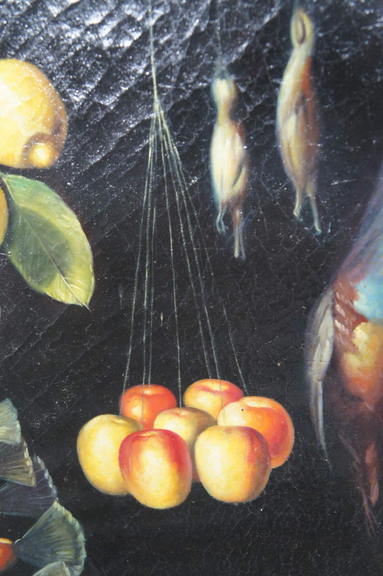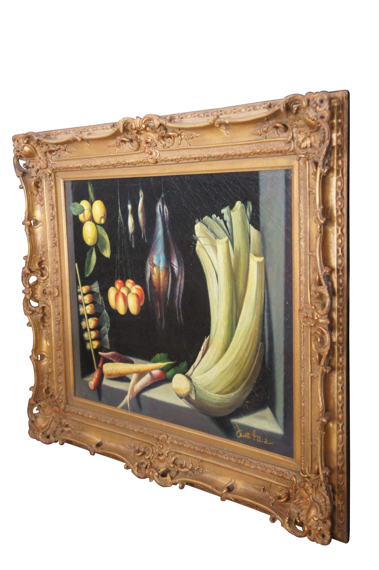 Late 20th century still life featuring watefowl, fruit and vegetables. An oil on craquelure canvas. Ornately framed in Baroque manner