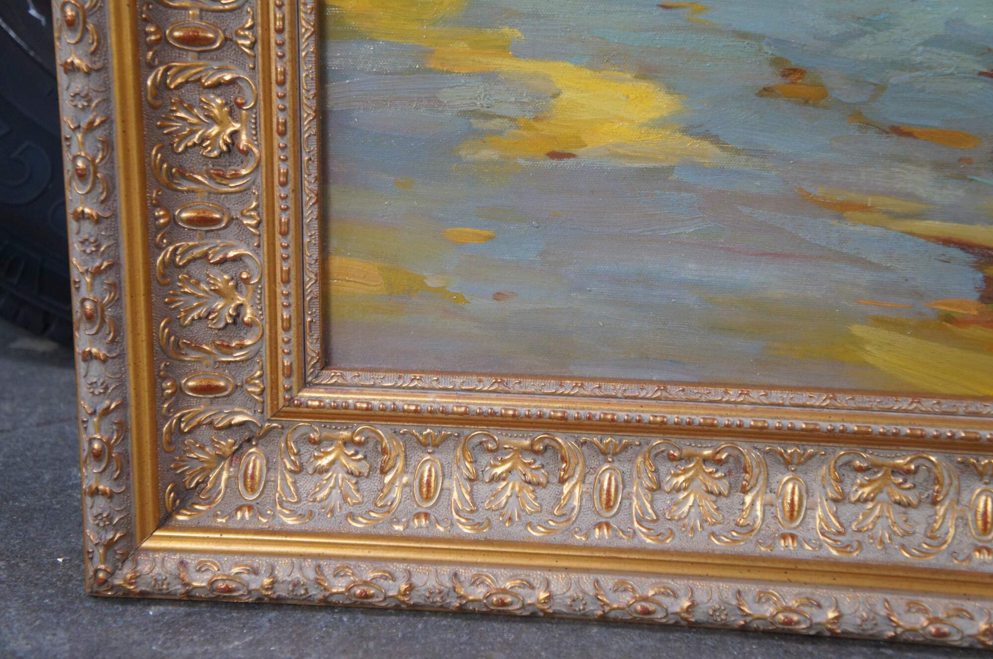 A large Impresionist original oil painting Titled Ring Around The Rosie, After Edward Potthast, circa late 20th century. The oil painting is on canvas and features three girls playing ring around the rosie on the beach in front of crashing ocean waves. The painting is framed in wood with gold finish.