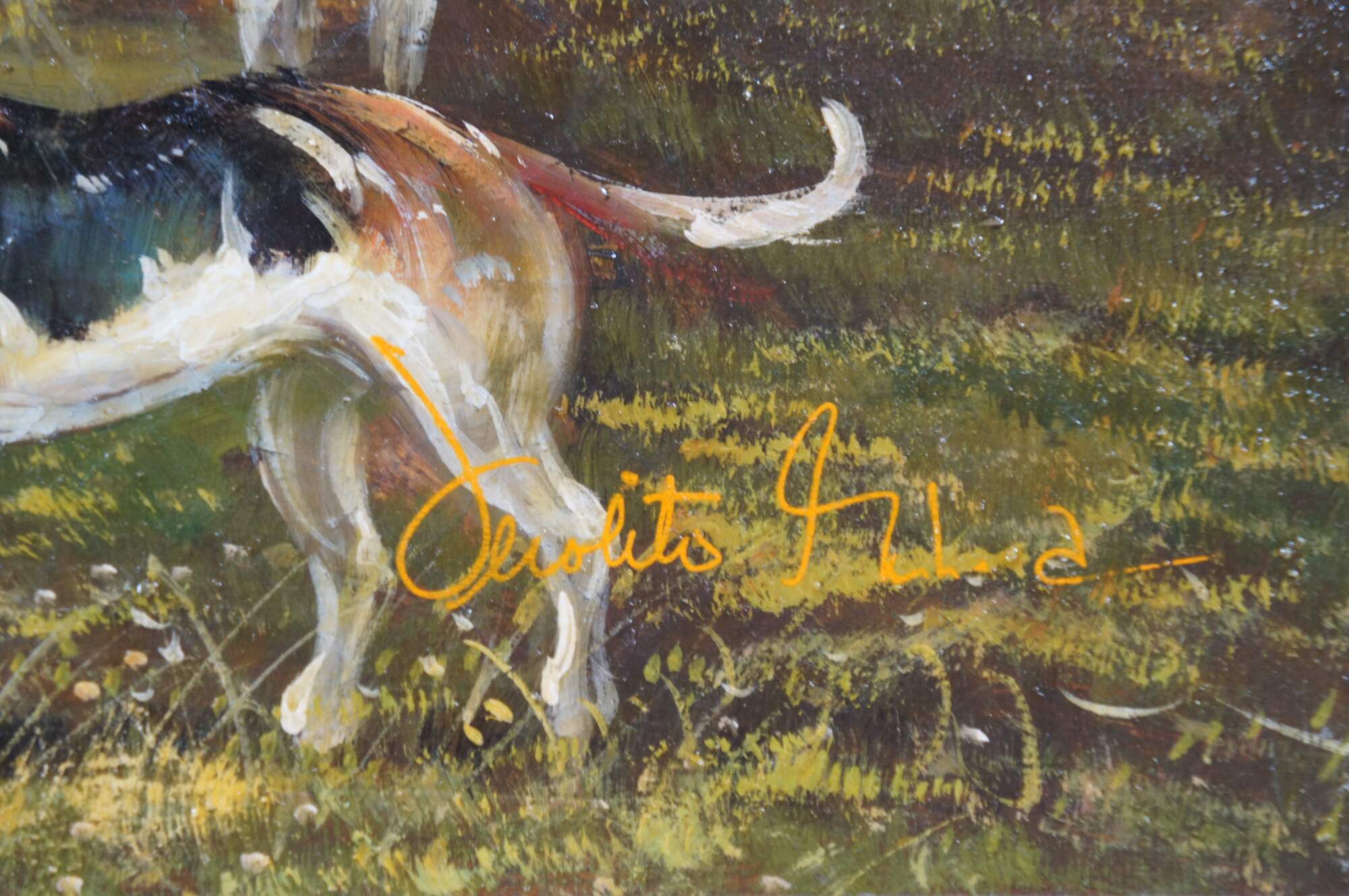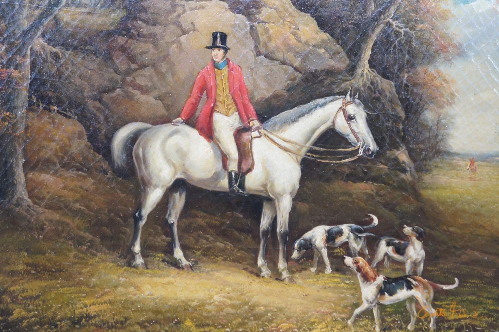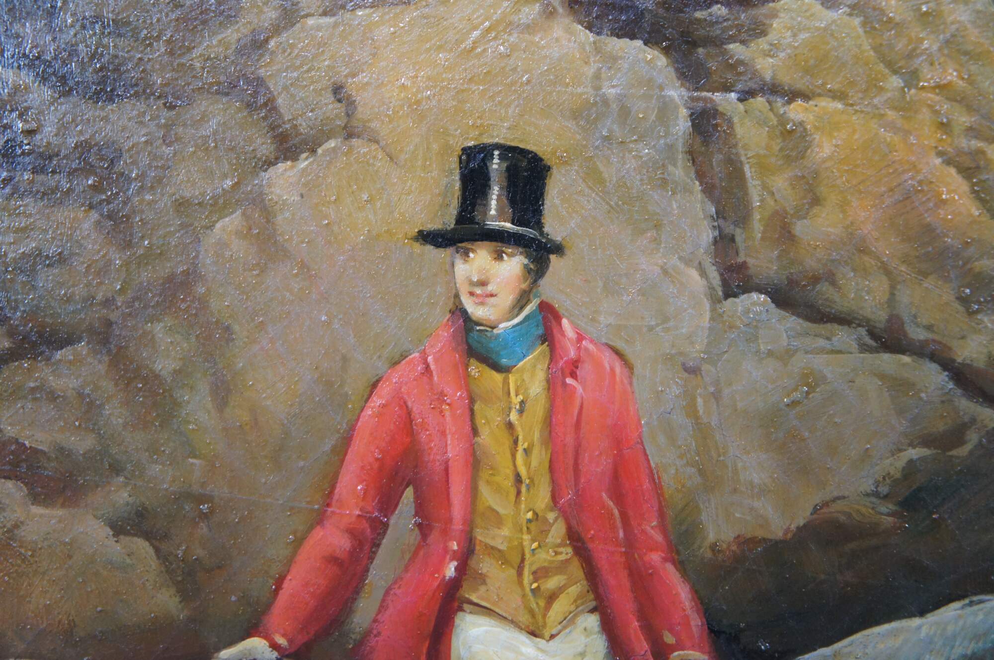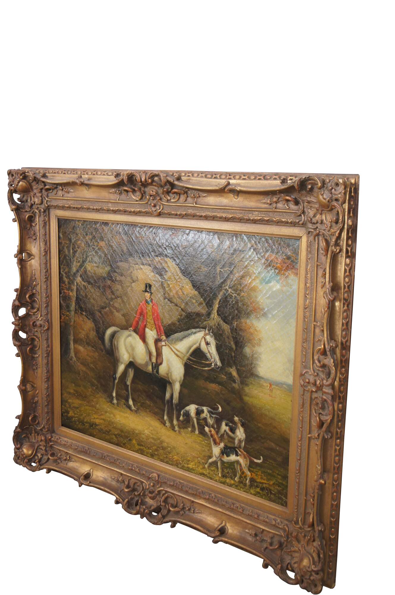 A distinguished 20th century Portrait of Rowland, Viscount Hill on his grey hunter, with the Shropshire hunt in the distance. After Rhicard Jones British (1767-1840). An oil on painting on canvas with natural craquelure, framed in baroque manner with gold finish.