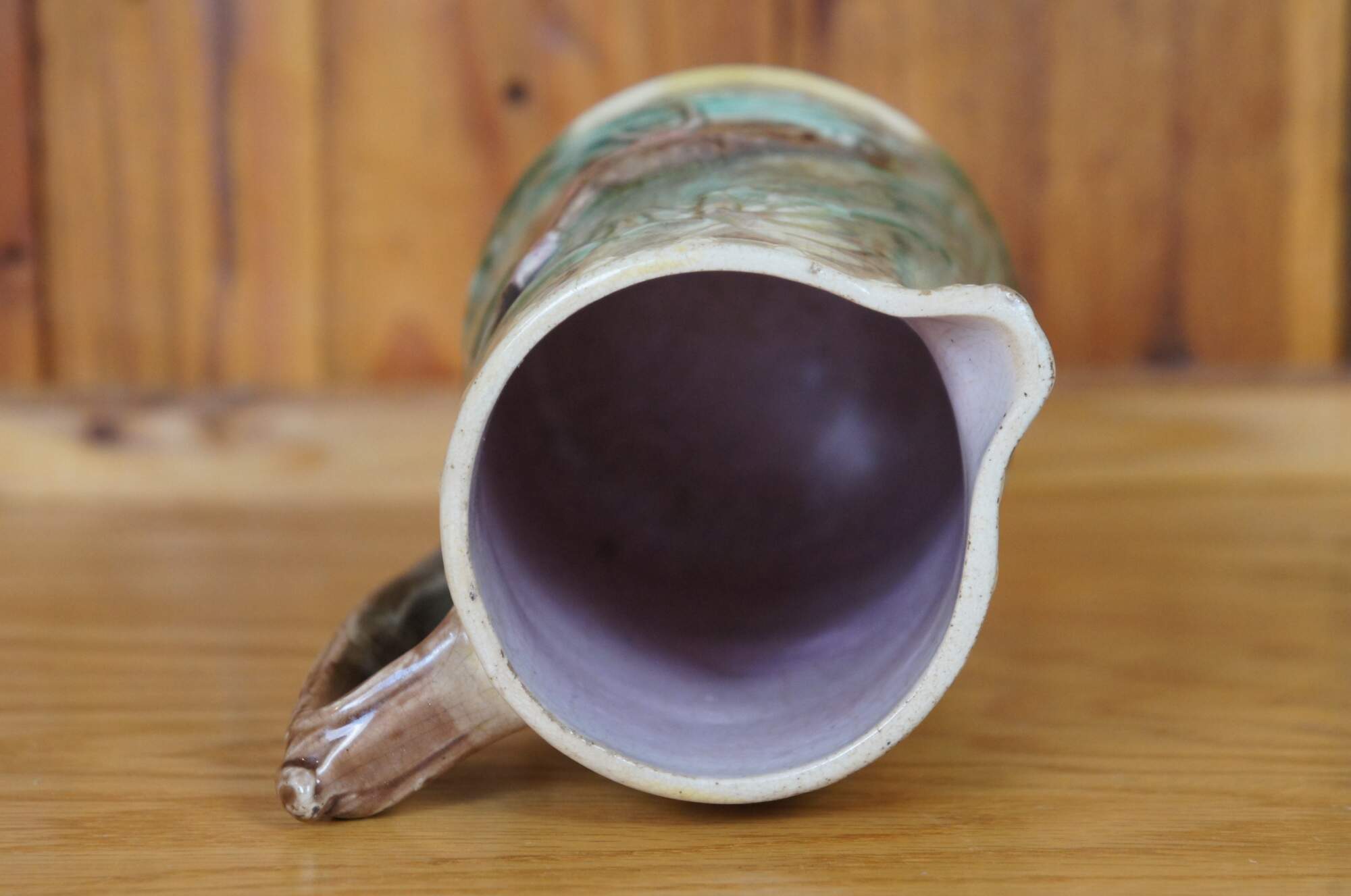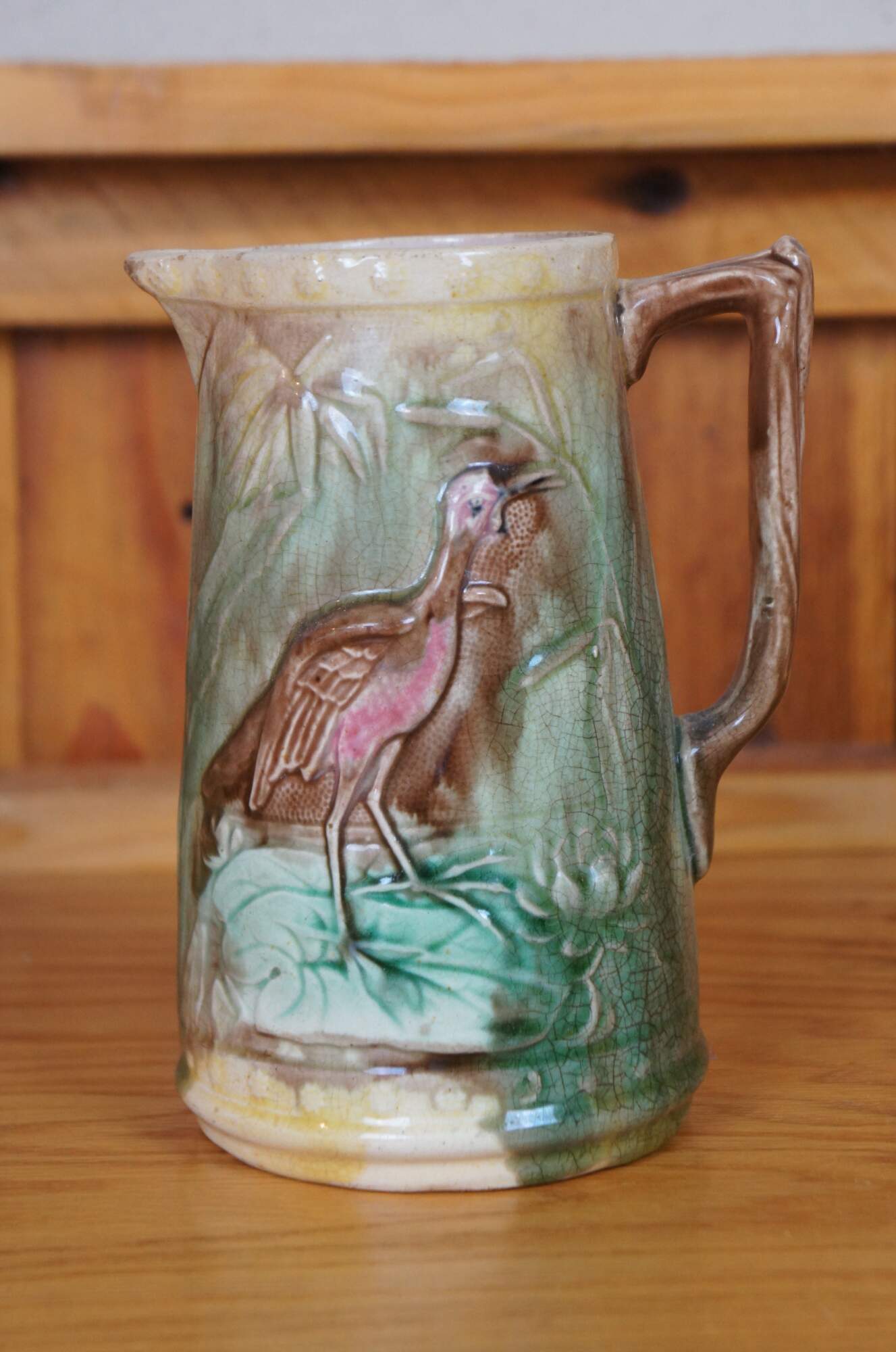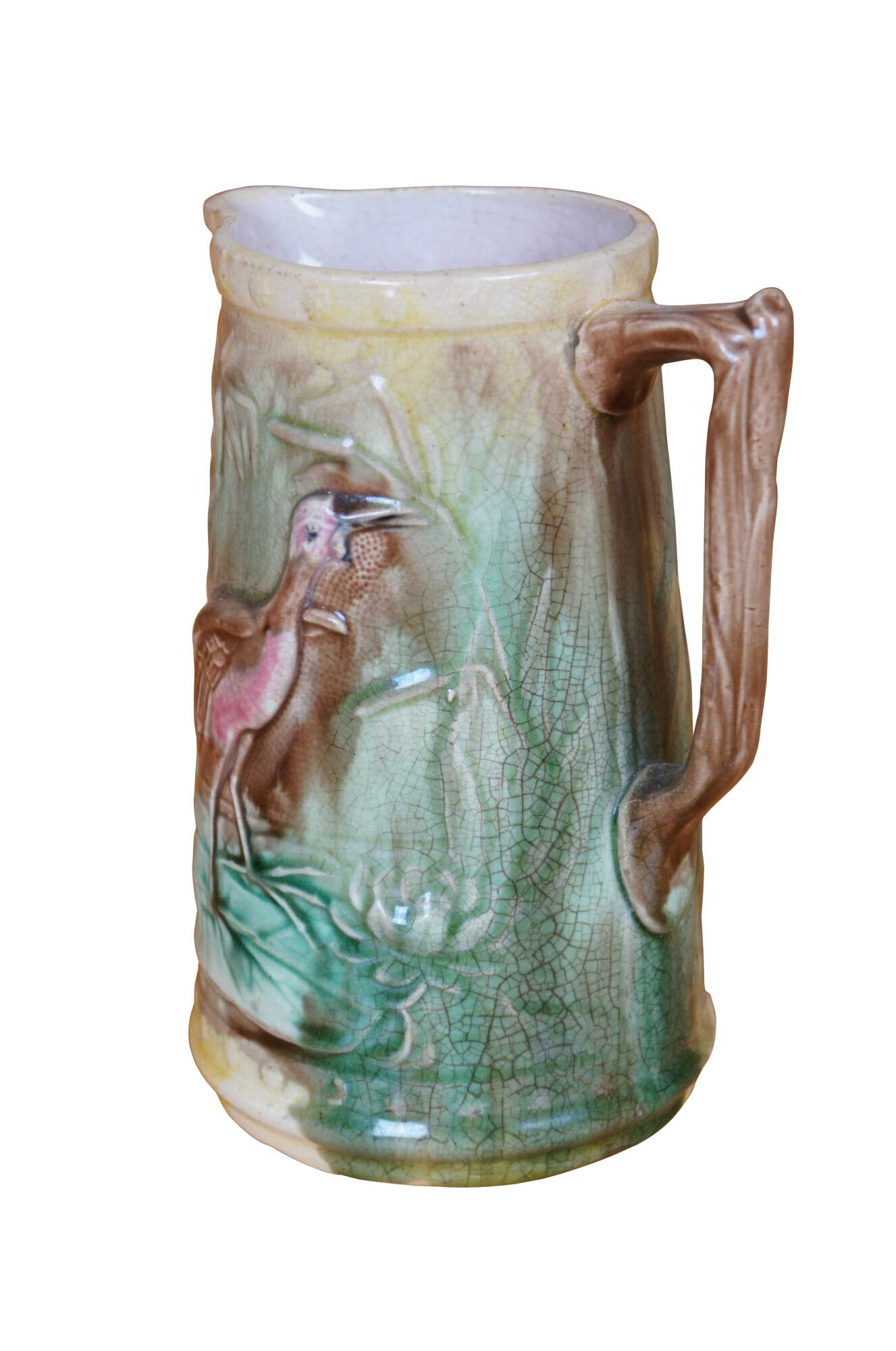 Antique Majolica Heron / Crane / Stork creamer pitcher/jug featuring the bird eating a fish on a water lily pad.