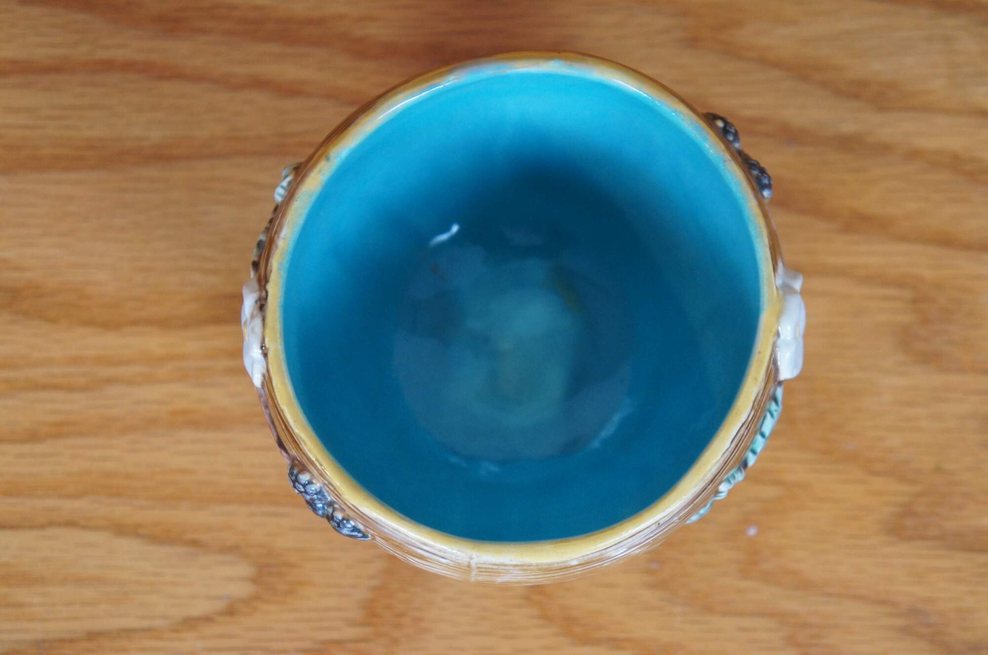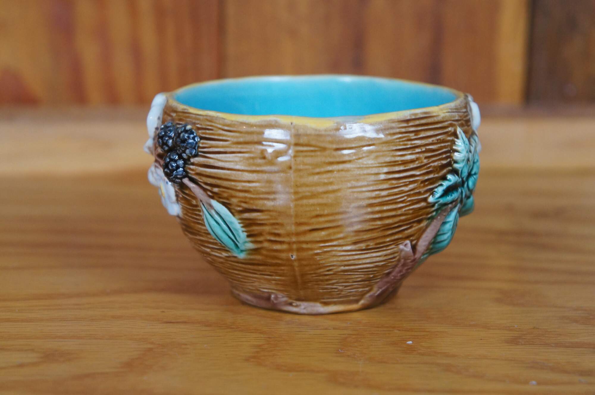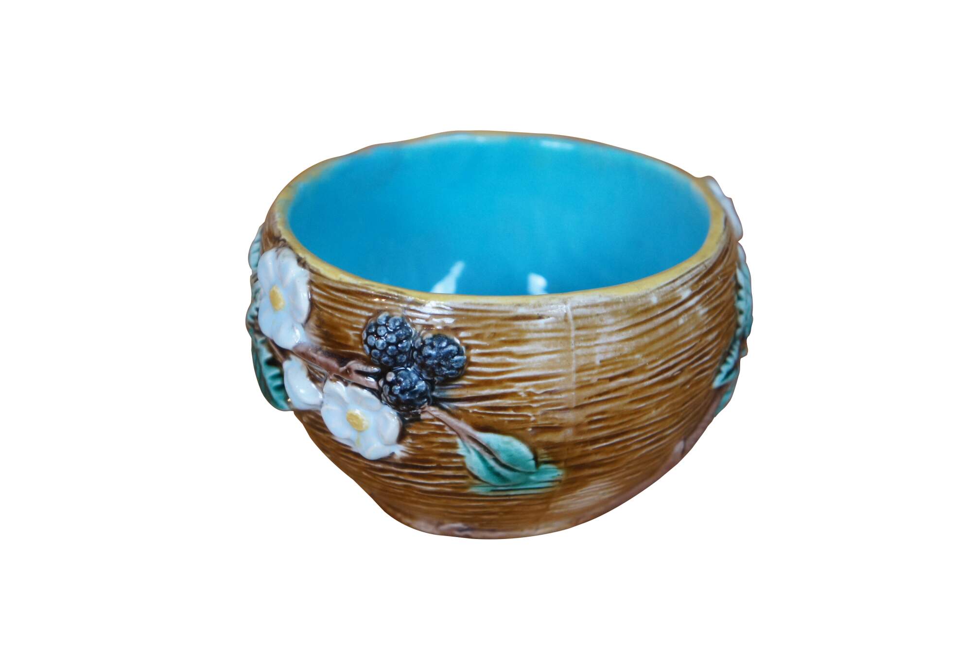 Antique Wedgwood Majolica fruit / sugar bowl / compote featuring a high relief blackberry and flower motif against a bark ground, turquoise interior. Circa November, 1877.